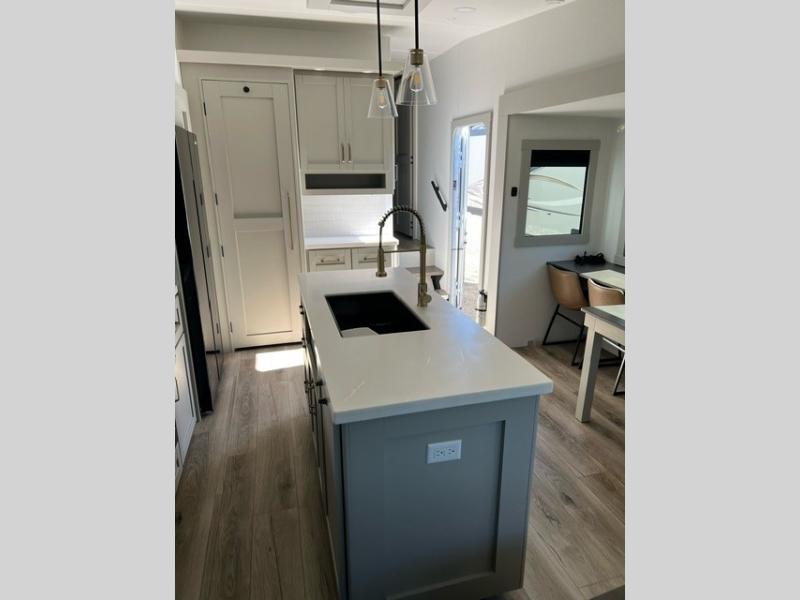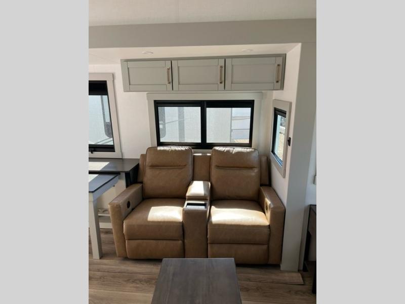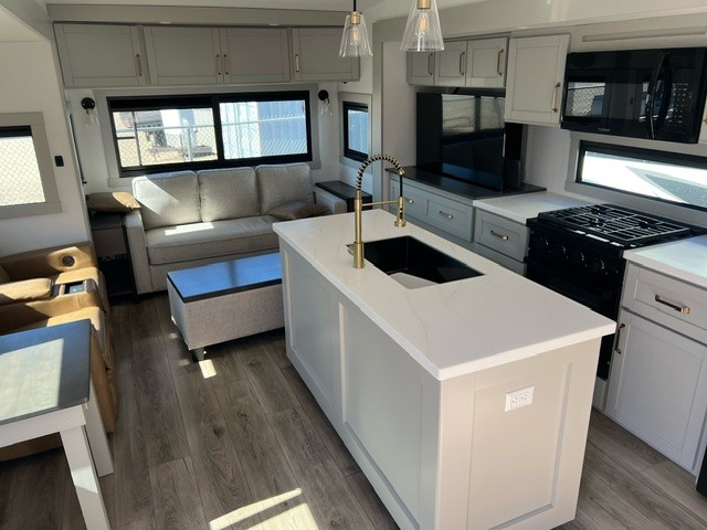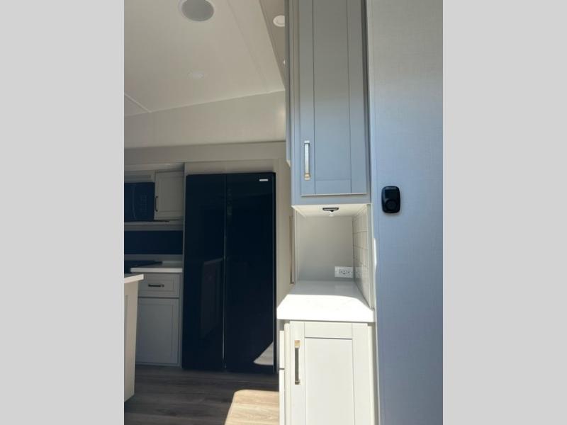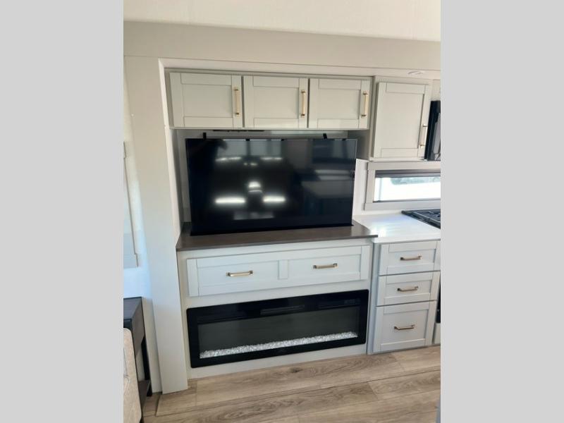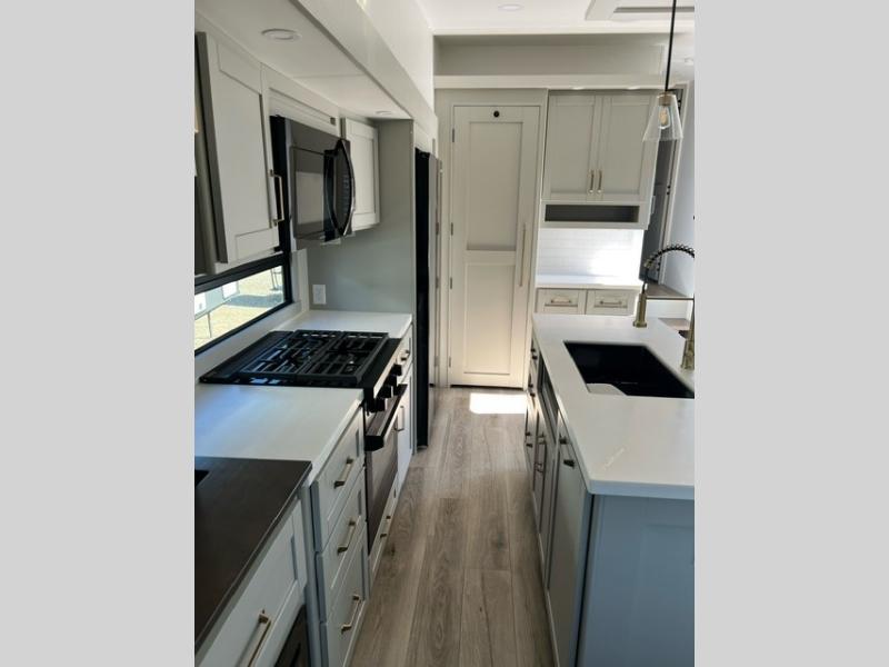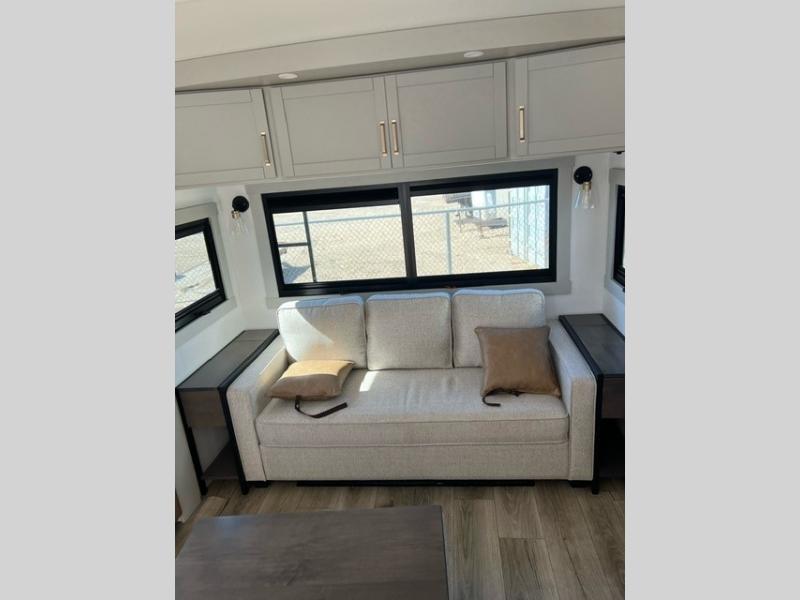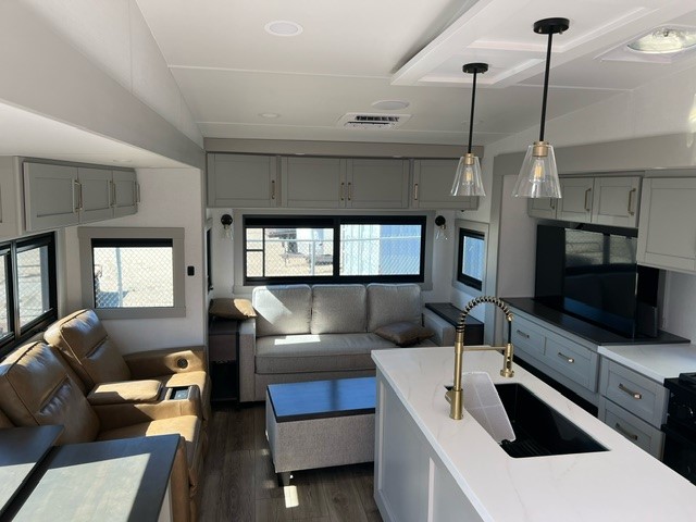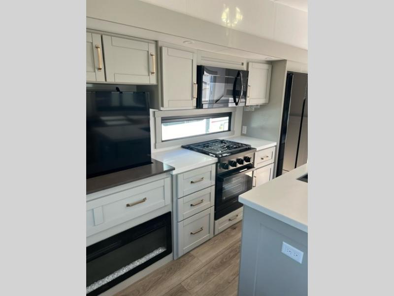 This Model Z luxury fifth wheel is bright and modern on the inside, with loads of amenities that will have you dreaming of your next trip! Enter and find a spacious combined living/kitchen space thanks to dual opposing slides. There is ample seating with a sliding desk/dining table, 62" theater seating, and a 72" tri-fold sofa along the rear wall. You can easily relax and enjoy the 50" Smart telescoping TV with a cozy fireplace below. The kitchen offers all that you need to prepare and cook meals just like home with a 16 cu. ft. refrigerator for your perishables, a 30" microwave oven, and three burner range top and oven. You will love the integrated spice rack, and the kitchen island all outfitted with dog bowls and double pull out trash bins with an integrated Stow 'N Go paper towel holder. There is also an 84" pantry with adjustable shelves for all of your canned and dry goods. Head up the steps to a private master suite with king bed slide. You can opt for the queen bed if you like. A sliding dresser top features hidden storage which is perfect for jewelry and other personal belongings. The front wardrobe features mirrored doors and the corner closet has been prepped for a stackable washer and dryer if you choose to add that option. Relax and enjoy a large bath featuring a linen cabinet, a 30" x 42" shower, and vanity with sink, plus medicine cabinet.