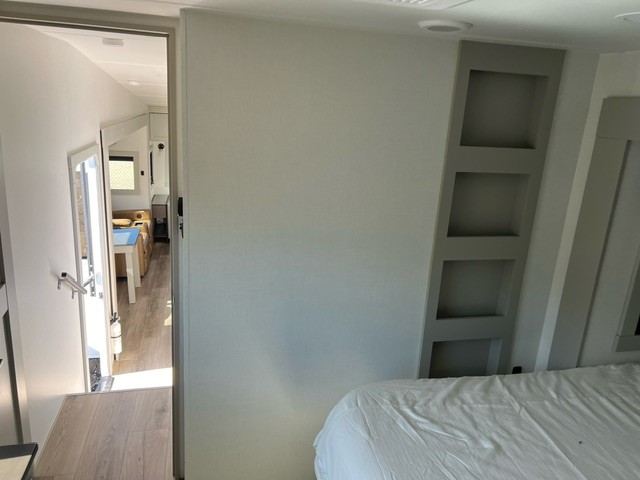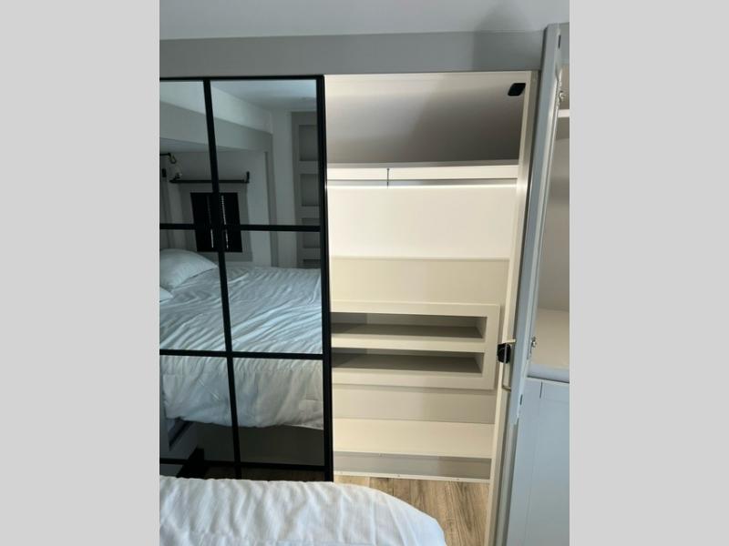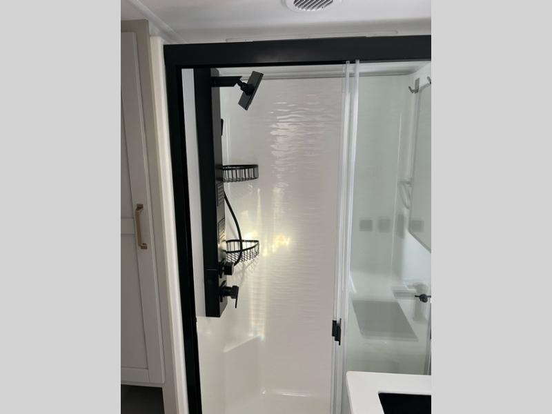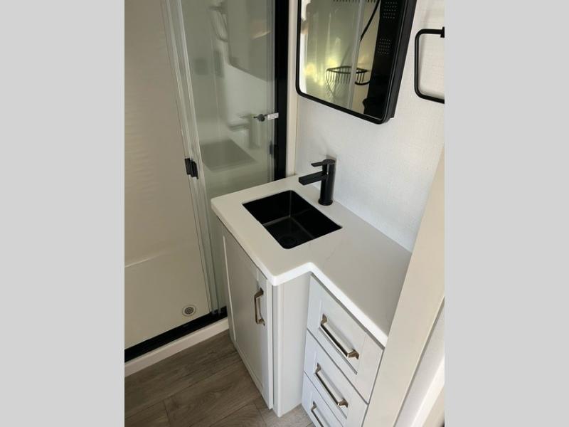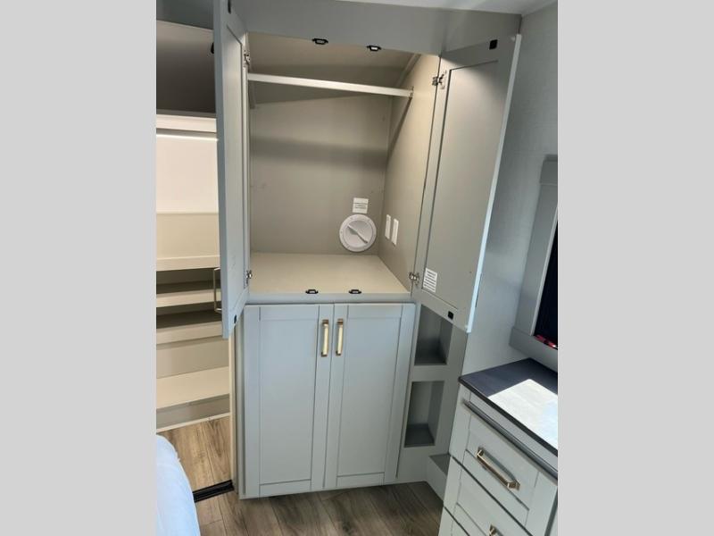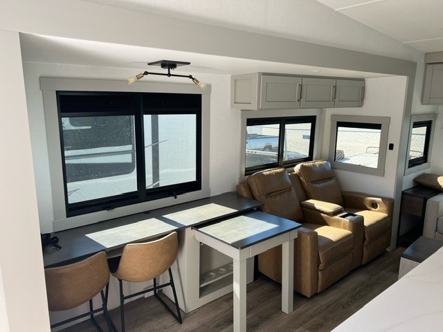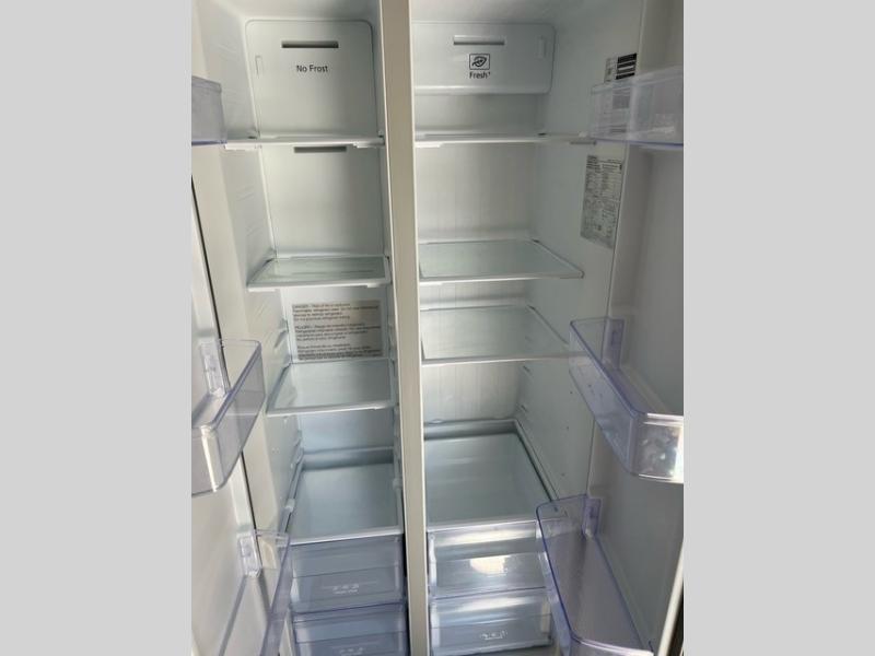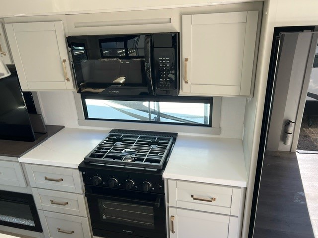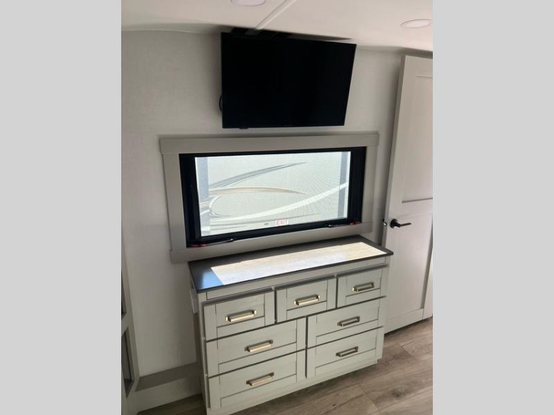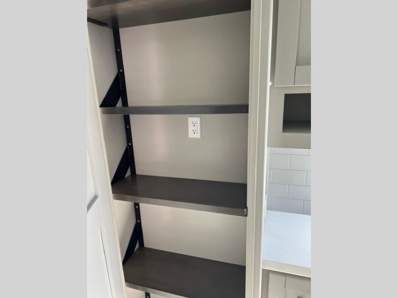 This Model Z luxury fifth wheel is bright and modern on the inside, with loads of amenities that will have you dreaming of your next trip! Enter and find a spacious combined living/kitchen space thanks to dual opposing slides. There is ample seating with a sliding desk/dining table, 62" theater seating, and a 72" tri-fold sofa along the rear wall. You can easily relax and enjoy the 50" Smart telescoping TV with a cozy fireplace below. The kitchen offers all that you need to prepare and cook meals just like home with a 16 cu. ft. refrigerator for your perishables, a 30" microwave oven, and three burner range top and oven. You will love the integrated spice rack, and the kitchen island all outfitted with dog bowls and double pull out trash bins with an integrated Stow 'N Go paper towel holder. There is also an 84" pantry with adjustable shelves for all of your canned and dry goods. Head up the steps to a private master suite with king bed slide. You can opt for the queen bed if you like. A sliding dresser top features hidden storage which is perfect for jewelry and other personal belongings. The front wardrobe features mirrored doors and the corner closet has been prepped for a stackable washer and dryer if you choose to add that option. Relax and enjoy a large bath featuring a linen cabinet, a 30" x 42" shower, and vanity with sink, plus medicine cabinet.