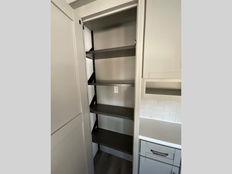 This Model Z luxury fifth wheel is bright and modern on the inside, with loads of amenities that will have you dreaming of your next trip! Enter and find a spacious combined living/kitchen space thanks to dual opposing slides. There is ample seating with a sliding desk/dining table, 62" theater seating, and a 72" tri-fold sofa along the rear wall. You can easily relax and enjoy the 50" Smart telescoping TV with a cozy fireplace below. The kitchen offers all that you need to prepare and cook meals just like home with a 16 cu. ft. refrigerator for your perishables, a 30" microwave oven, and three burner range top and oven. You will love the integrated spice rack, and the kitchen island all outfitted with dog bowls and double pull out trash bins with an integrated Stow 'N Go paper towel holder. There is also an 84" pantry with adjustable shelves for all of your canned and dry goods. Head up the steps to a private master suite with king bed slide. You can opt for the queen bed if you like. A sliding dresser top features hidden storage which is perfect for jewelry and other personal belongings. The front wardrobe features mirrored doors and the corner closet has been prepped for a stackable washer and dryer if you choose to add that option. Relax and enjoy a large bath featuring a linen cabinet, a 30" x 42" shower, and vanity with sink, plus medicine cabinet.