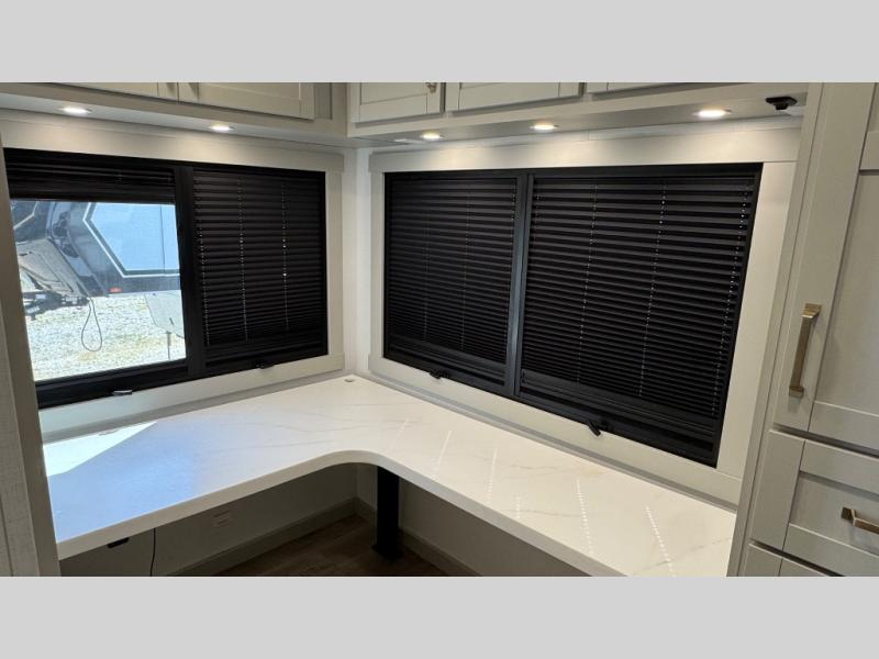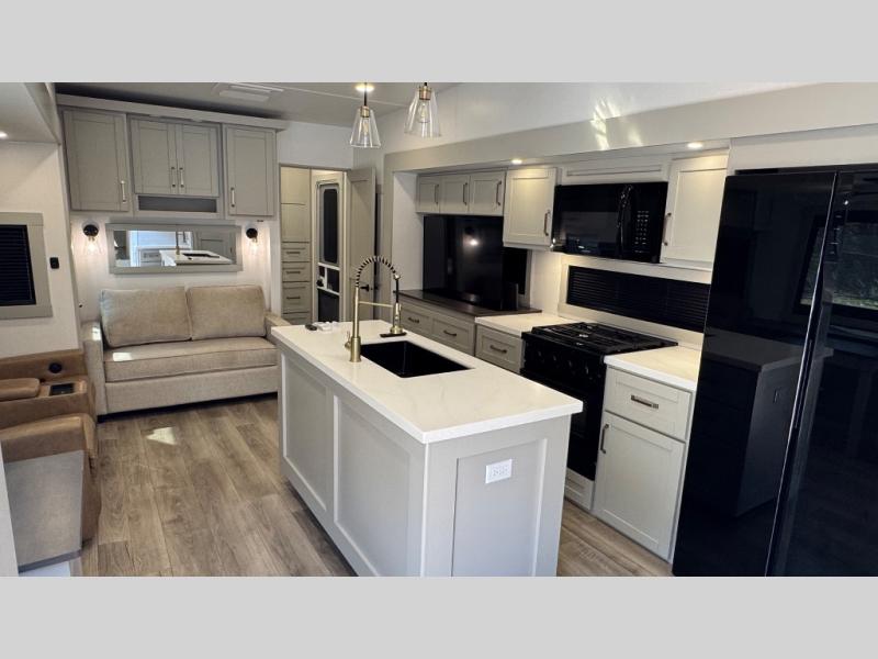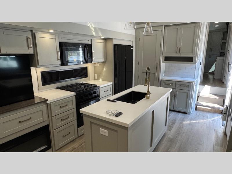 If you're looking for a feature-packed fifth wheel, this is the one! The rear multipurpose flex space can be used as an office/butler's pantry/laundry room/mudroom! There is an adjustable-height desk, storage space, plus washer and dryer prep. One of the dual entry doors is even found here for added convenience. The combined middle kitchen and living room includes dual opposing slides, a tri-fold sofa, theater seating, and a sliding desk/dining table. There is also a televator and fireplace, kitchen island with pet bowls, and an 84" pantry with adjustable shelving to name a few more features. A full bath towards the front includes a 30" x 42" shower, and the front private bedroom will feel just like home with its king bed slide out. There is also a sliding dresser top with hidden storage, bedside shelves, a front wardrobe, and washer and dryer prep here also!