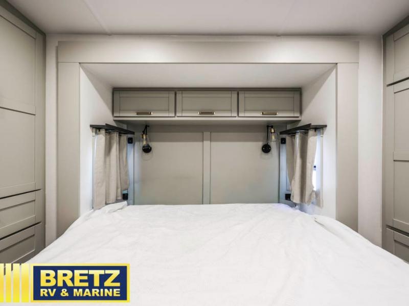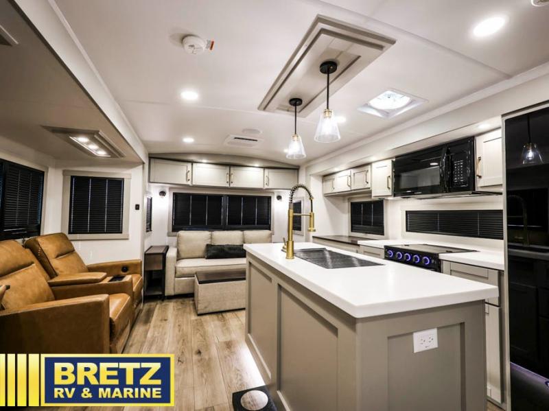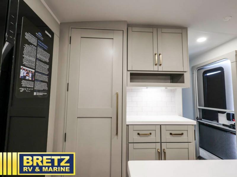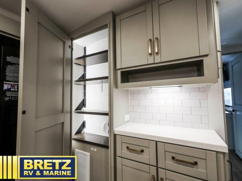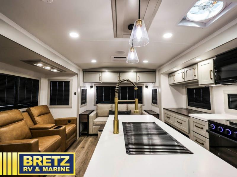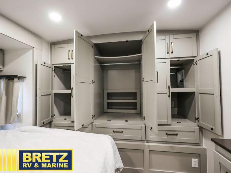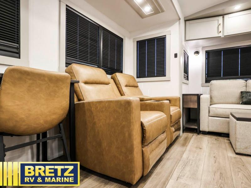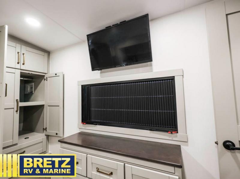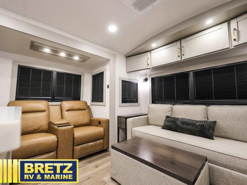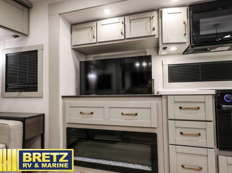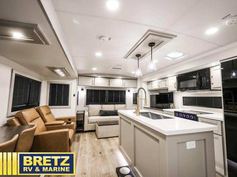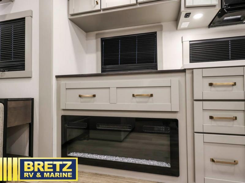 You will love all the space and features in this travel trailer! A luxurious rear living room offers plenty of room to spread out, with a 72" tri-fold sofa plus theater seats, all arranged with a perfect view of the 50" TV over the fireplace. A central kitchen area includes an island with hidden pet bowls. Find even more storage with the hutch plus pantry with adjustable shelves. The front bedroom comes with a queen bed, but if you'd like you can upgrade to a king for even more room. No matter which you choose, you will enjoy watching the 32" bedroom TV. The full-width wardrobe has room for all of your clothes and also includes prep for an optional washer and dryer. And the full bath includes a 30" x 42" one-piece fiberglass shower. Outside you'll enjoy two awnings, pass-through storage, and LED chassis lighting.