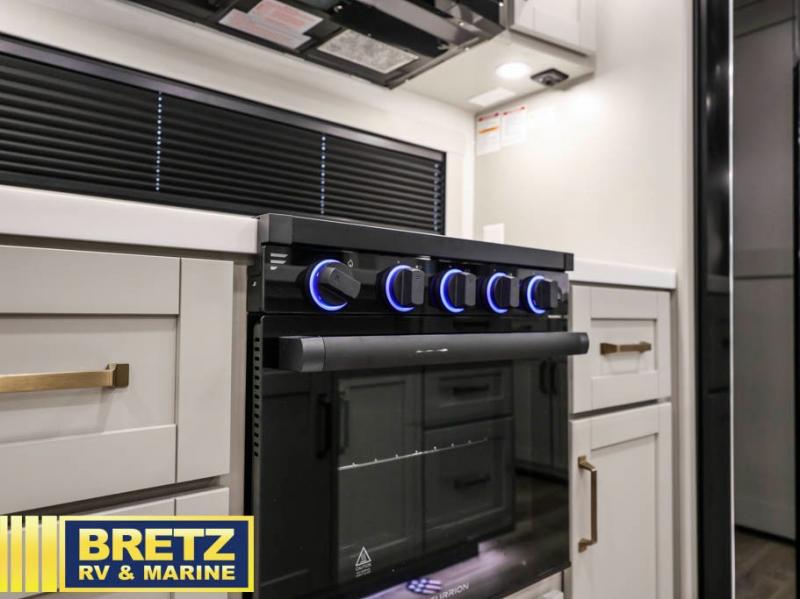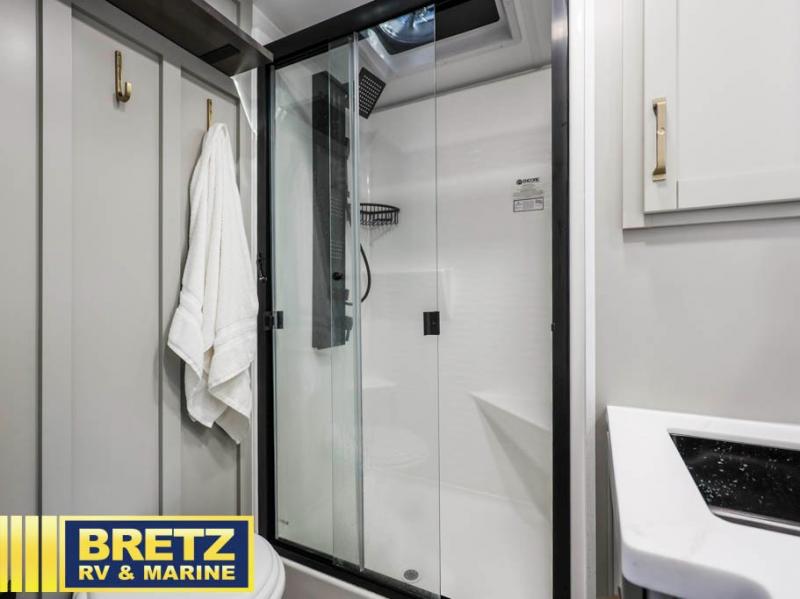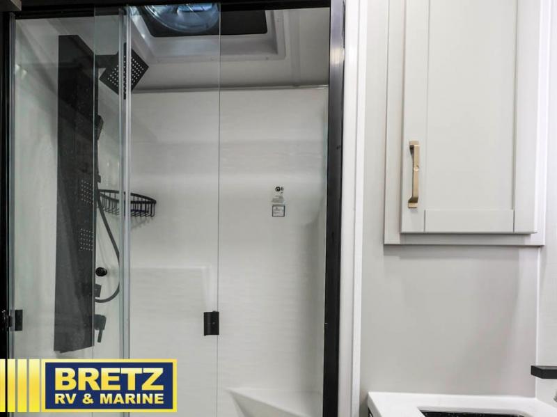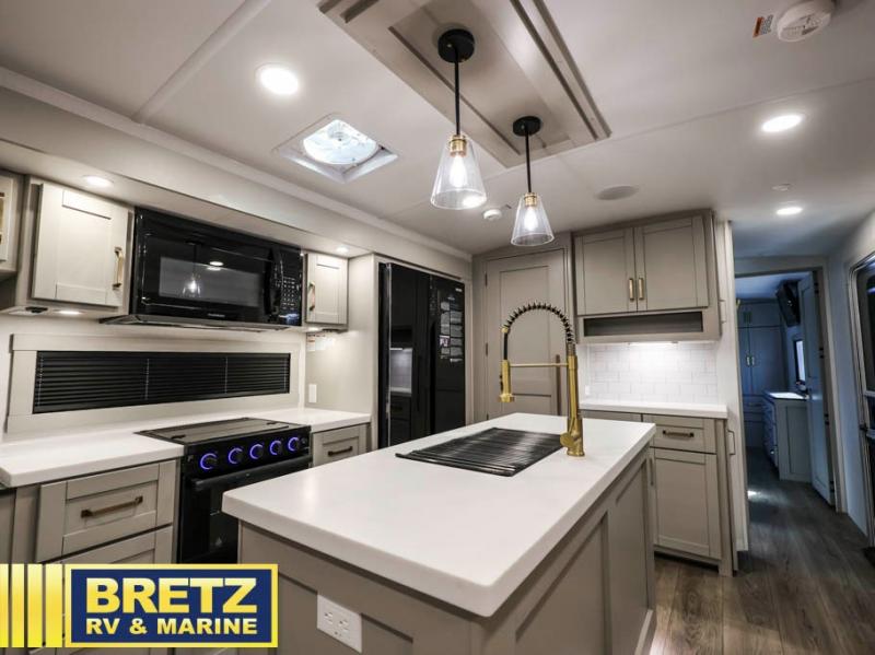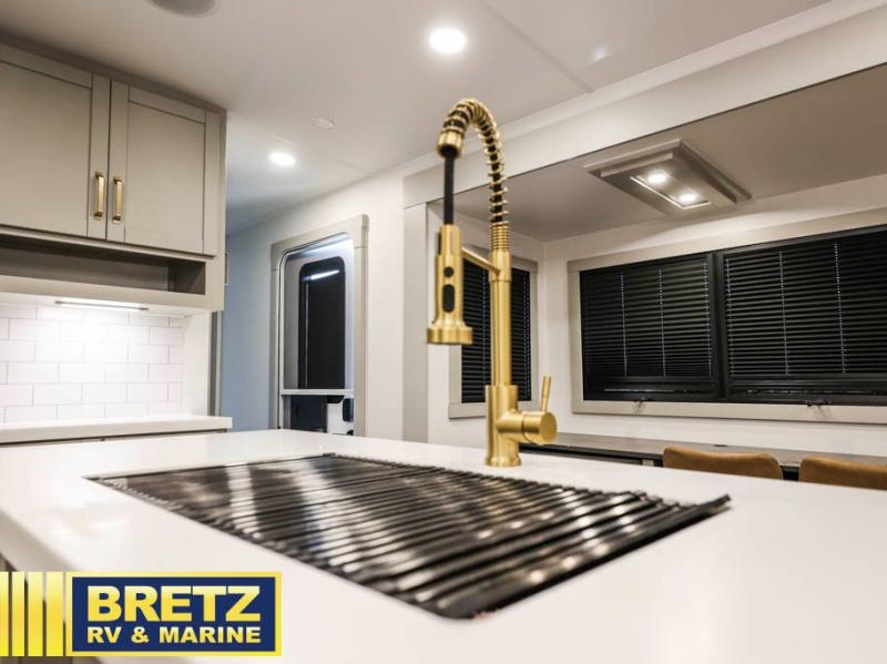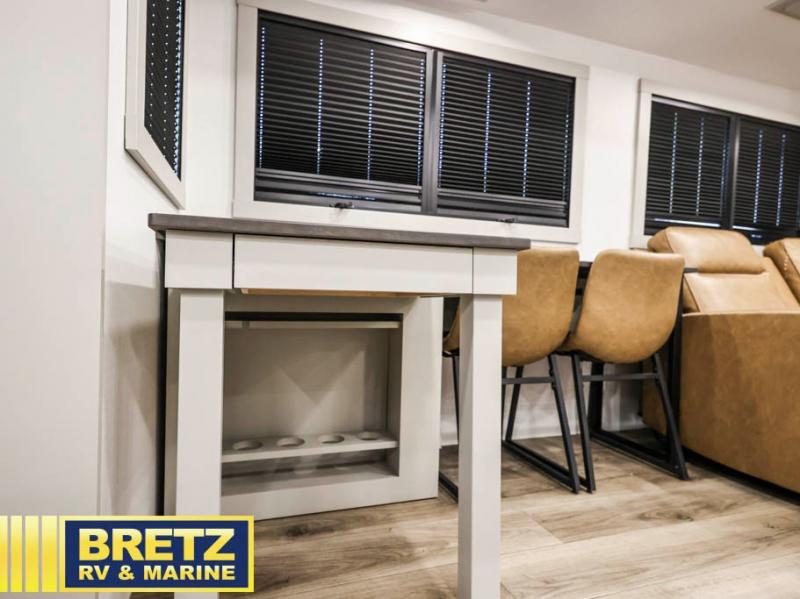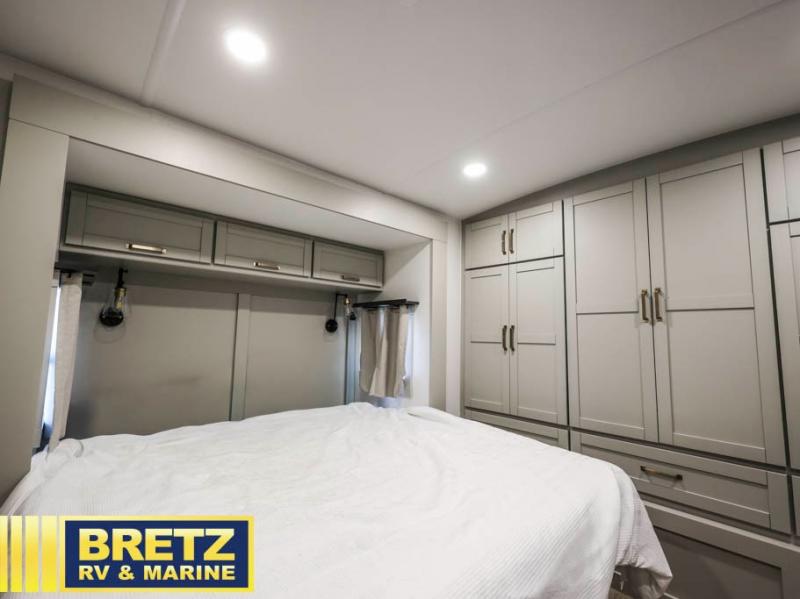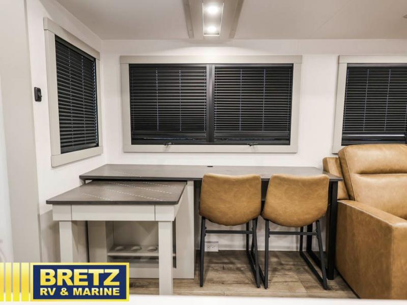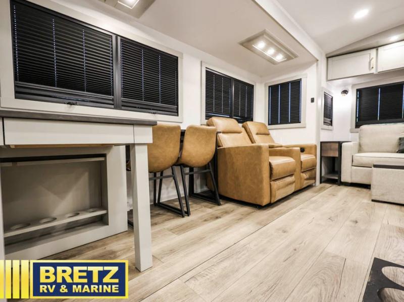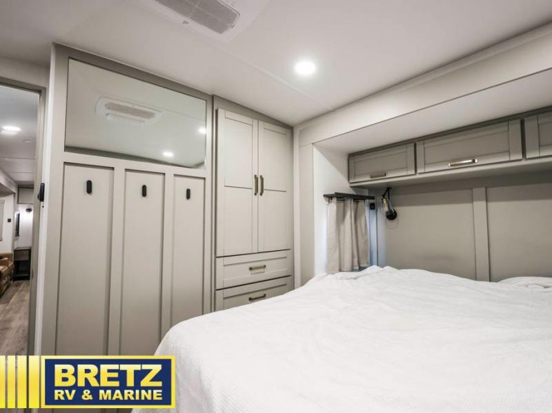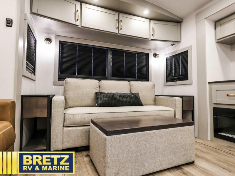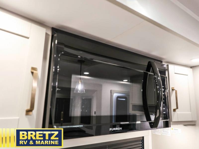 You will love all the space and features in this travel trailer! A luxurious rear living room offers plenty of room to spread out, with a 72" tri-fold sofa plus theater seats, all arranged with a perfect view of the 50" TV over the fireplace. A central kitchen area includes an island with hidden pet bowls. Find even more storage with the hutch plus pantry with adjustable shelves. The front bedroom comes with a queen bed, but if you'd like you can upgrade to a king for even more room. No matter which you choose, you will enjoy watching the 32" bedroom TV. The full-width wardrobe has room for all of your clothes and also includes prep for an optional washer and dryer. And the full bath includes a 30" x 42" one-piece fiberglass shower. Outside you'll enjoy two awnings, pass-through storage, and LED chassis lighting.