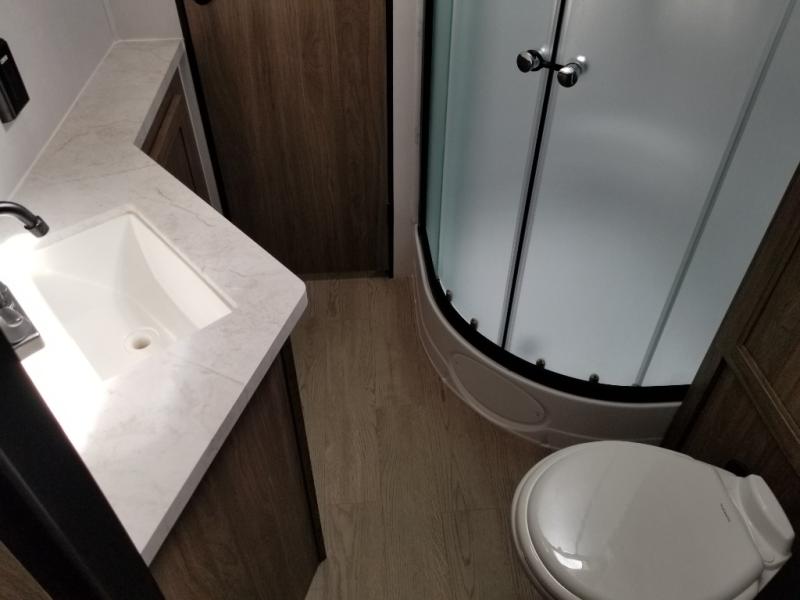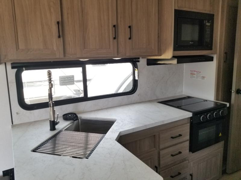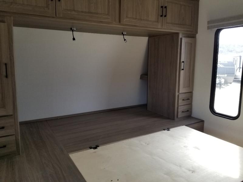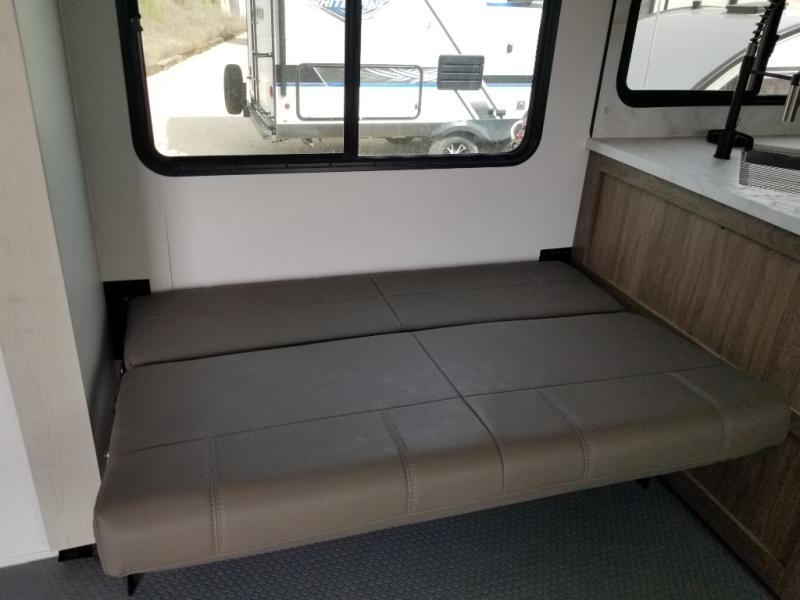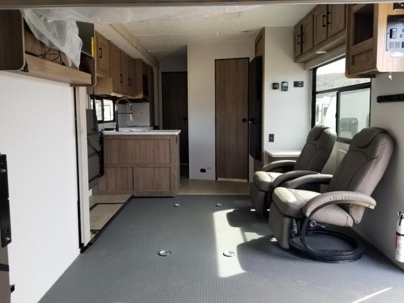 Looking for a spacious travel trailer that you can carry your toys to and from the off-road park and stay overnight in comfort? Well this might just fit the bill! You will appreciate the 15' 7" cargo space for all your toys, and the large slide out with a flip-up slide floor door will provide extra interior space. The chef of the family or group can prepare dinner on the three burner cooktop or use the microwave, and the double entry bath includes plenty of counter space that will come in handy when you're getting ready each day. This trailer also includes dual entry doors; one into the garage area and one into the front master bedroom with a king bed for your convenience. You will also find a rear pull down screen, pull-down roller night shades to be able to sleep in late, and a solar package to help you stay off-grid.