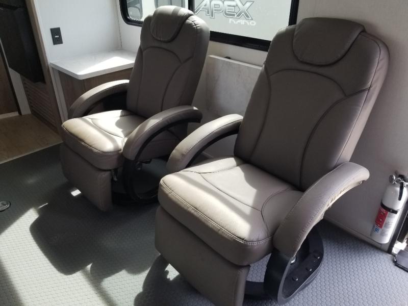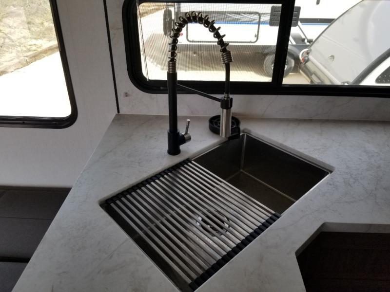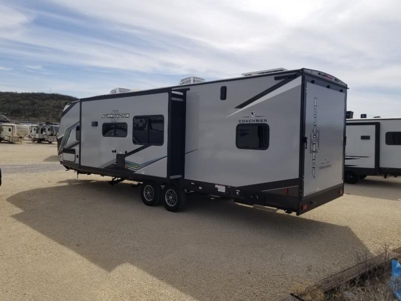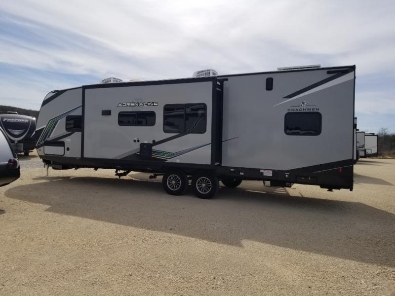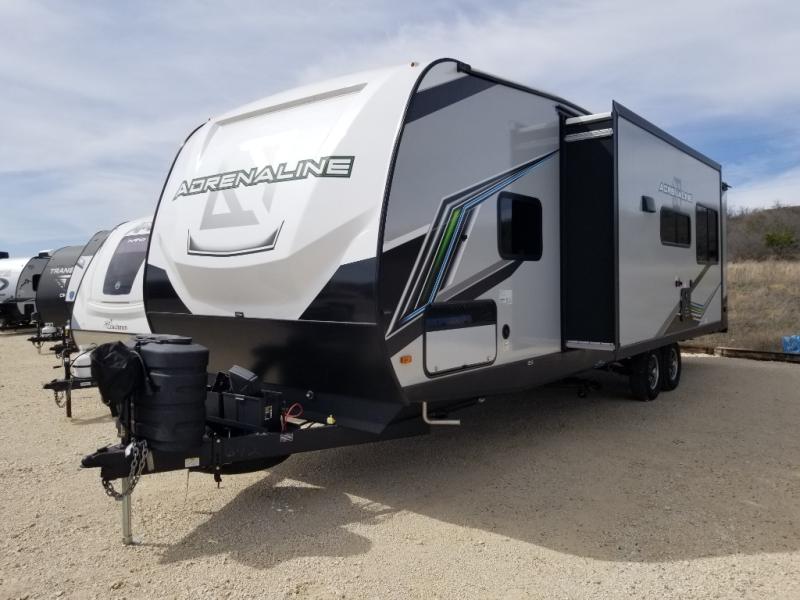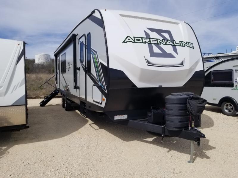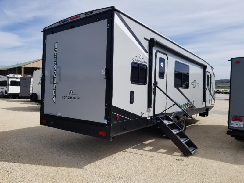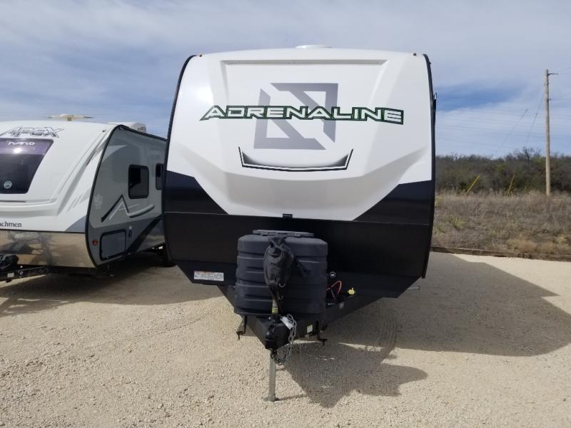 With any Adrenaline toy hauler travel trailer by Coachmen, the required Exterior Value package includes a one-piece Tufflex PVC roof membrane, a fiberglass front cap with rock guard to help against road debris, heavy duty Dexter axles with Nev-R-Adjust brakes and E-Z Lube, and aluminum wheels. Some exterior standards include a heated and enclosed underbelly, a patio ready ramp door with cables for an outdoor above ground space to enjoy, a power tongue jack for easy setup, and an outside spray port to clean off your toys. The interior standards include HD rubberized oil/gas/moisture resistant flooring in the garage area, hidden hinge cabinets and doors, a rear detachable screen, and USB charging ports in multiple locations for your electronics to mention a few.