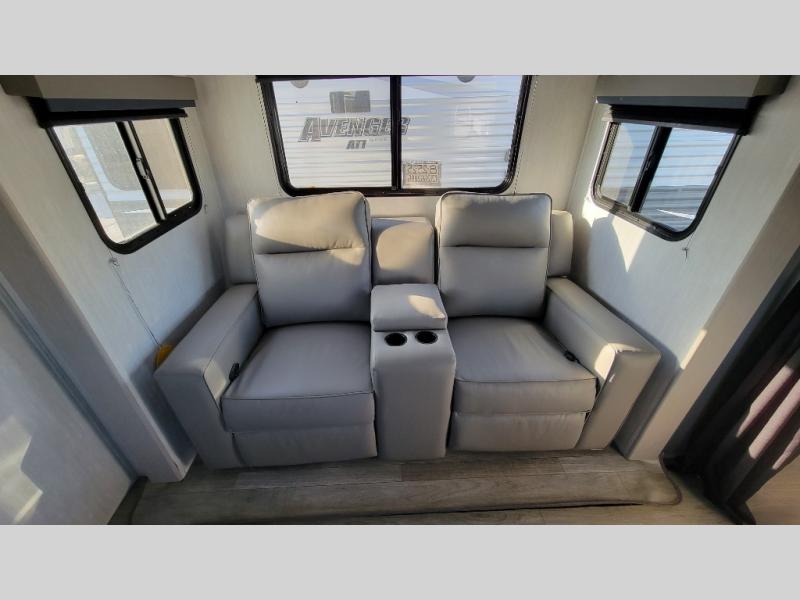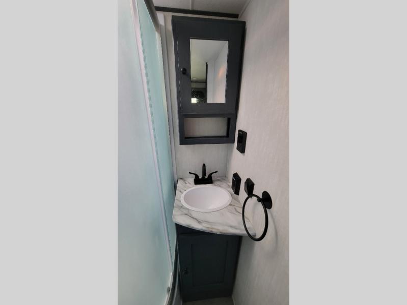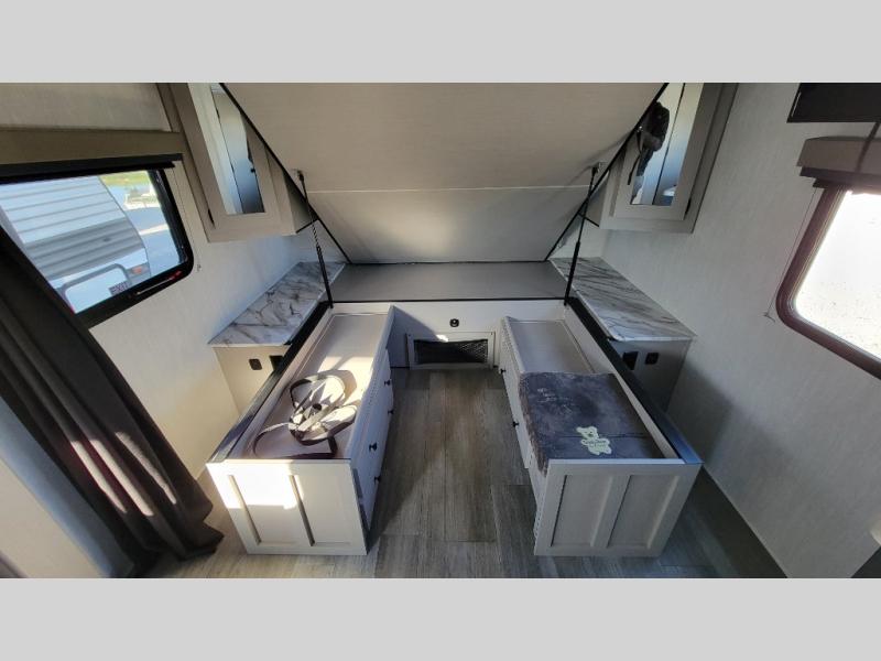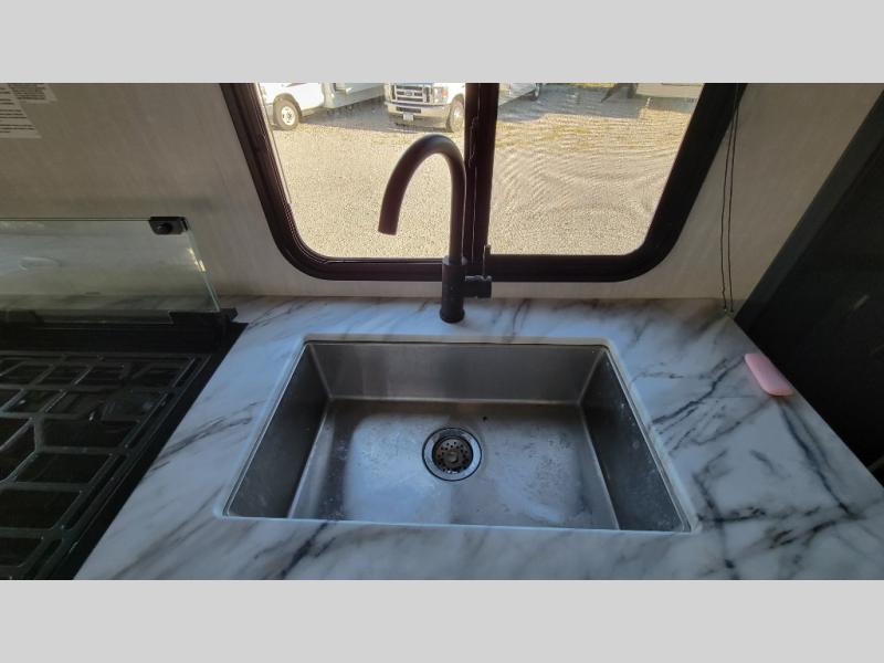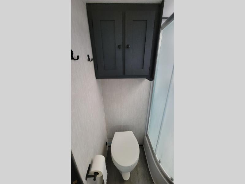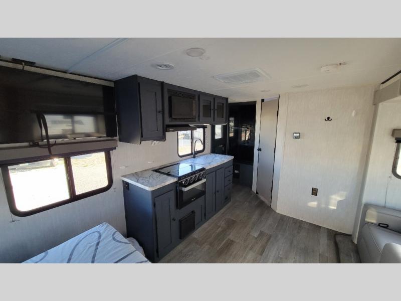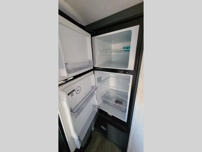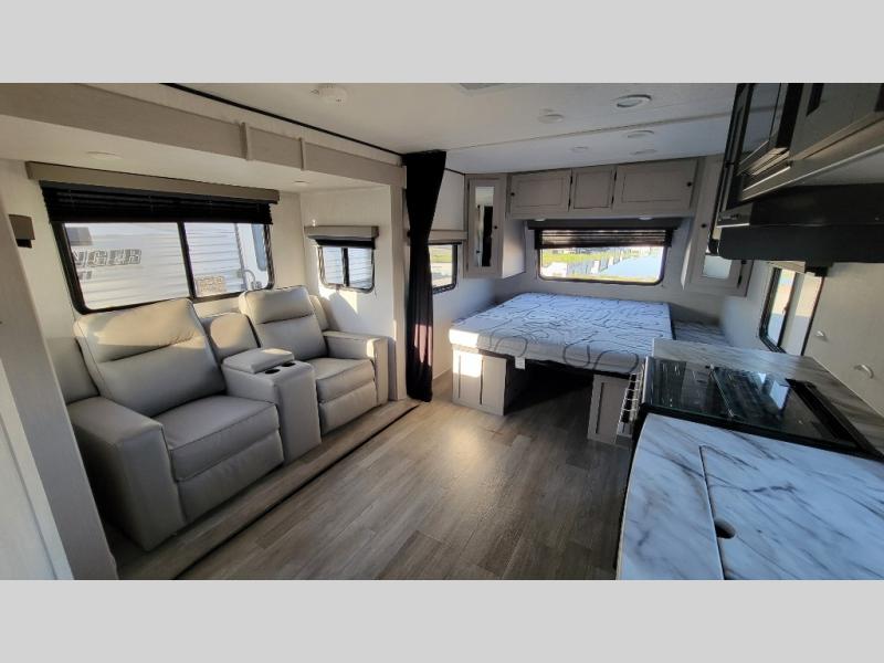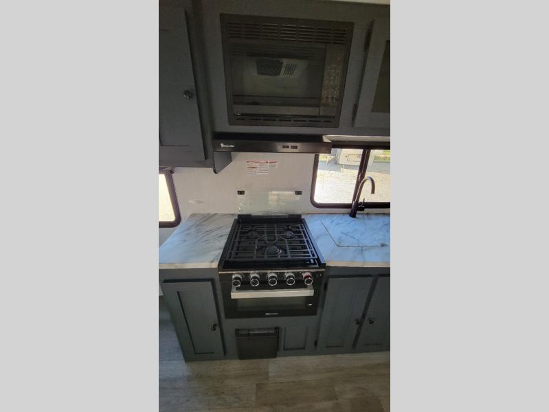 You'll love camping in this single slide out travel trailer. There is a front queen bed with dual wardrobes and nightstands to keep your space tidy, plus there is a free-standing table in front of the bed where you can play a game or dine together. A three burner cooktop and air fryer will let you make meals each day, and the 8 cu. ft. 12V refrigerator can hold your perishables. But you may just find yourself cooking outdoors on the exterior griddle under the power awning!