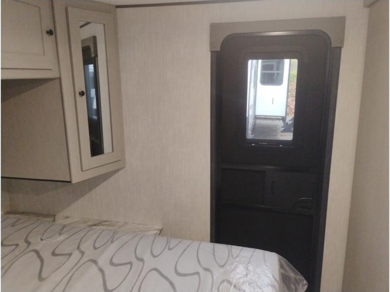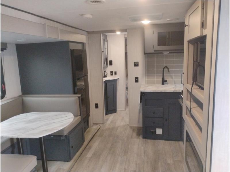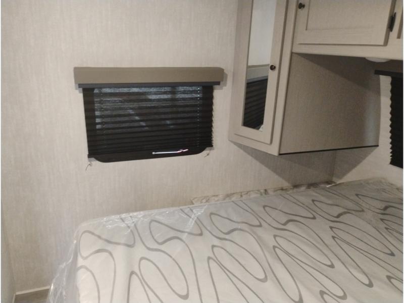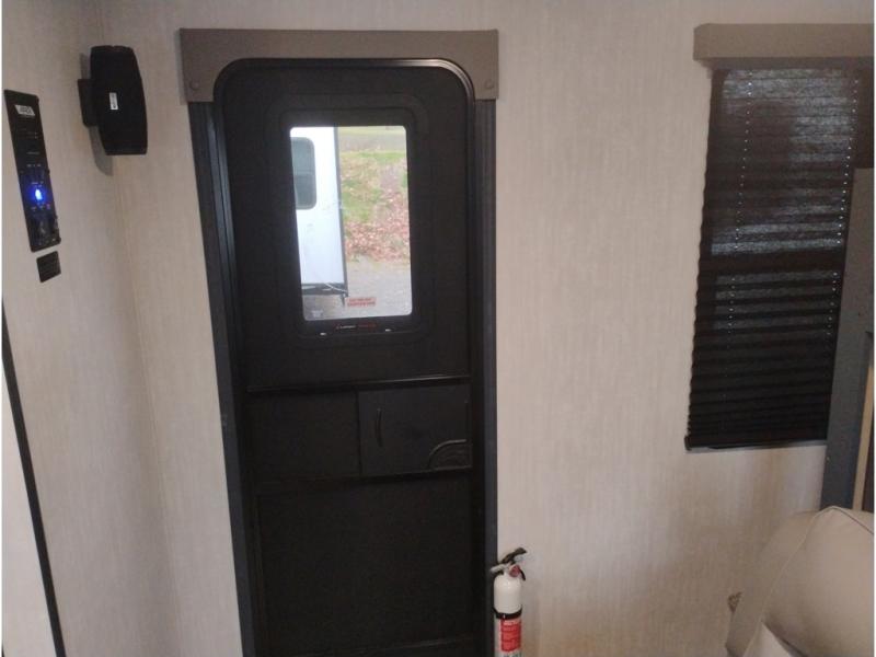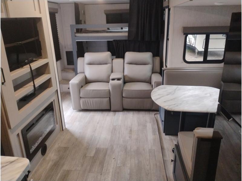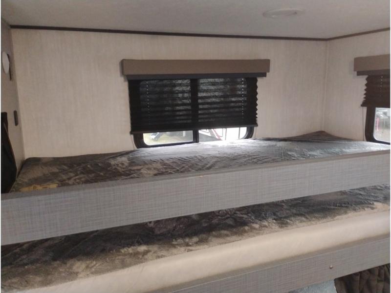 Camping with family or a larger group of friends is easier than ever in this dual entry trailer that can sleep nine people comfortably. The little ones will love the double-size bunks with storage steps, and you'll have the queen bed with super storage all to yourselves. There is also a U-shaped dinette slide and a sofa for even more sleeping space. If the weather is nice, you'll find yourselves outdoors under the 20' power awning and enjoying a snack from the exterior camp kitchen. This model also includes an entertainment center with an LED TV, and you'll find the pantry/storage behind the entertainment center for added convenience.
