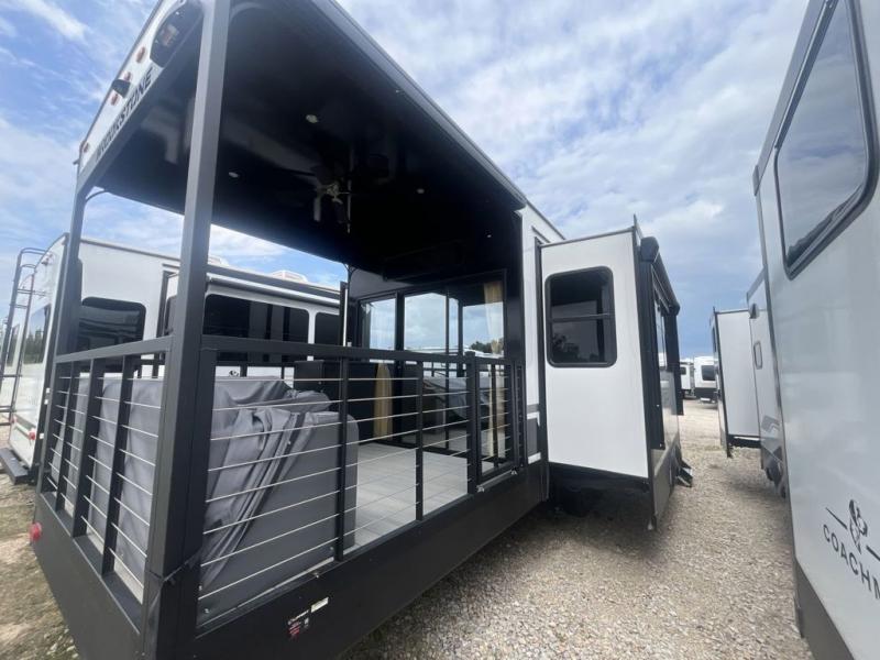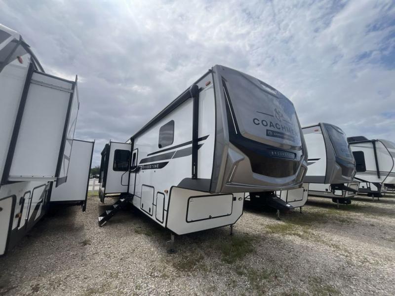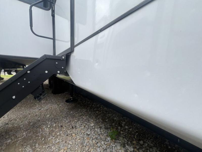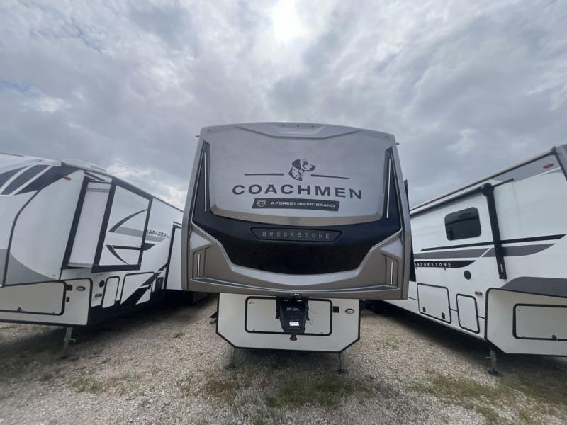 The Brookstone fifth wheels by Coachmen are coming to you with wide-body comfort, home-like amenities, and unique designs for a truly luxurious RV. The Weather Shield+ consists of a 6X double Azdel aluminum cage sidewall system, a Radiant Pro weather barrier system, and more that will help you extend your camping season or go full-time. Head inside to find solid surface countertops in the kitchen, an 4K Smart LED TV in the living room, slow rise roller night shades, and the list of comforts goes on! The Brookstone also includes 6-point electric auto-leveling, four Solid Step entry steps, an electric awning with LED lights, and many more exterior conveniences!