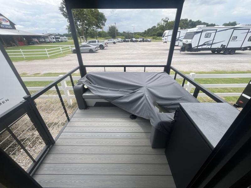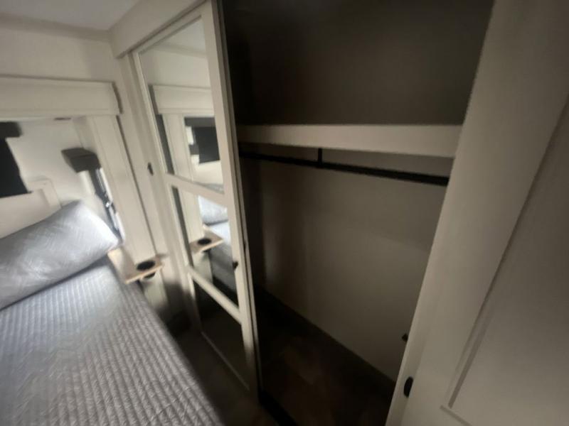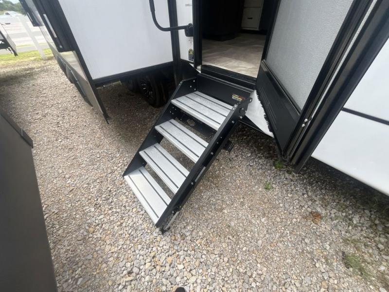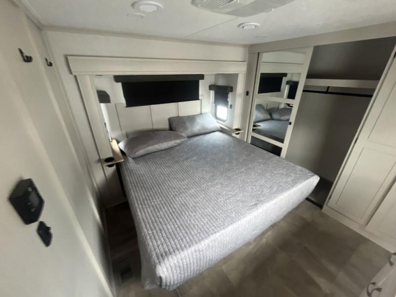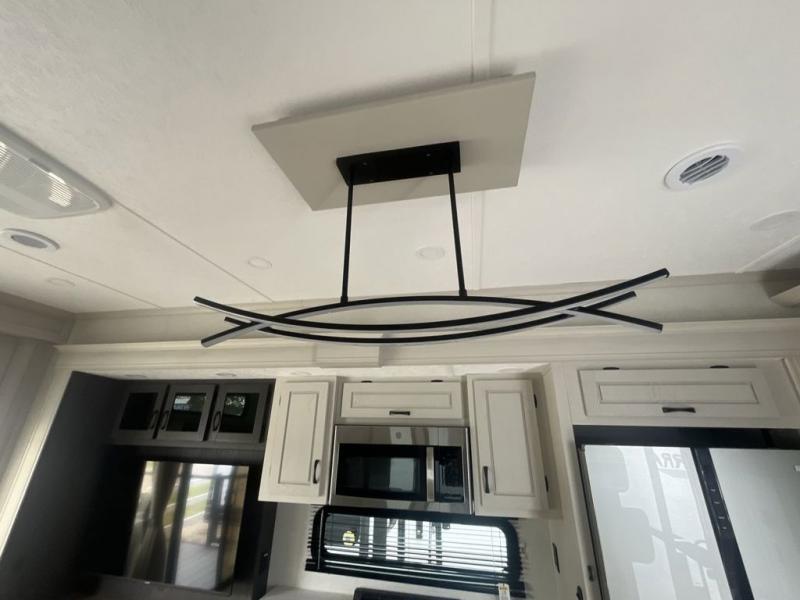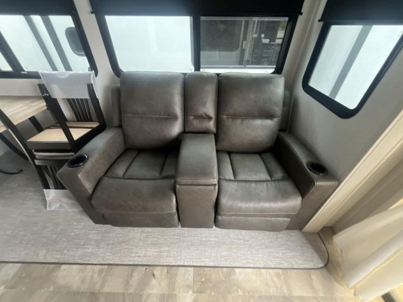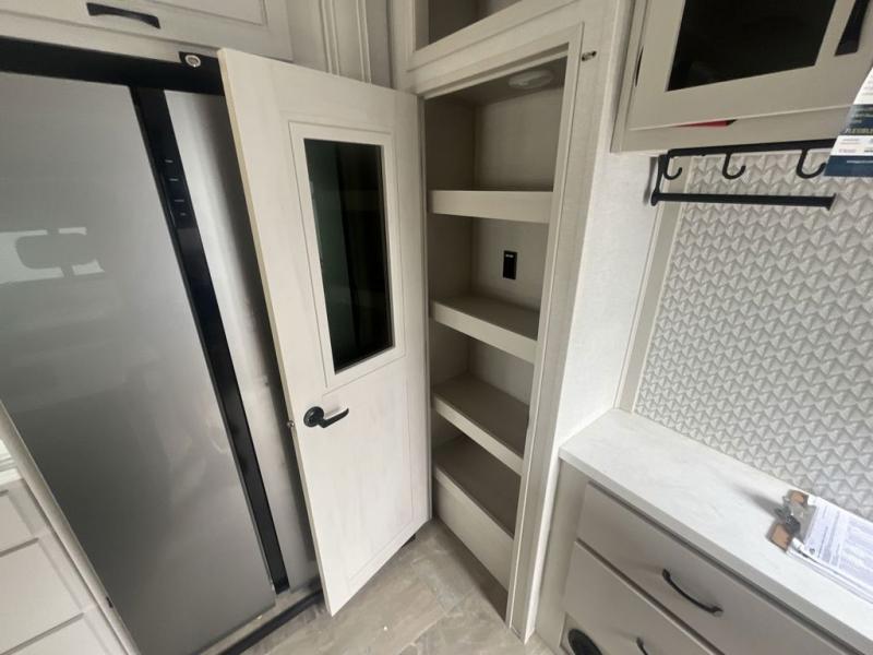 Step outside and enjoy the fresh air on our covered patio, complete with a refrigerator and optional L-shaped sofa, which is the perfect place to relax and unwind after a long day of adventure. Inside, the kitchen/living room area will make you feel an at-home experience, featuring overhead cabinets, an entertainment center, theater seating, a free-spanning table, a kitchen island, a microwave, a refrigerator, and a pantry. Perfect for cooking up a storm, entertaining friends and family, or simply relaxing and enjoying the comforts of home. The full bathroom is a spacious oasis, complete with a shower with a seat, a linen closet, and more. Plus, with a front bedroom featuring a king bed, dresser, washer and dryer prep, and a large wardrobe, you'll have the perfect place to rest and recharge after a long day of adventure. With two entry/exit doors and a massive 20’ awning, you'll have easy access to the RV and plenty of shade and protection from the weather.