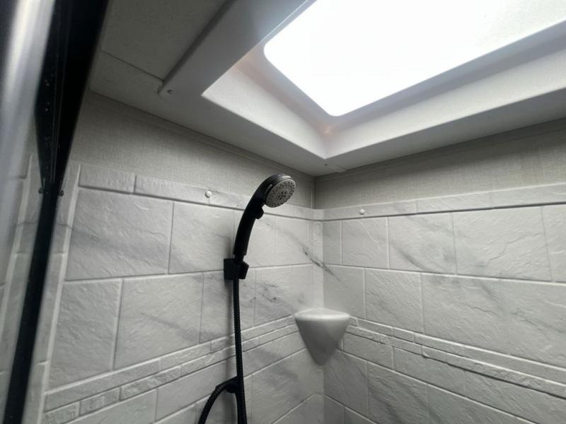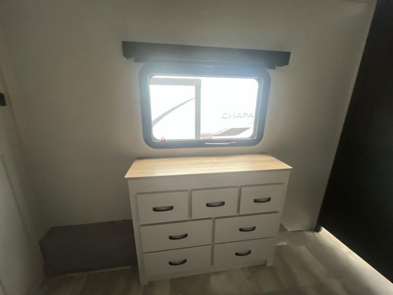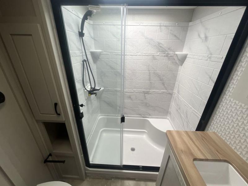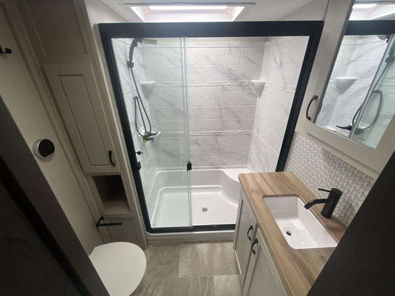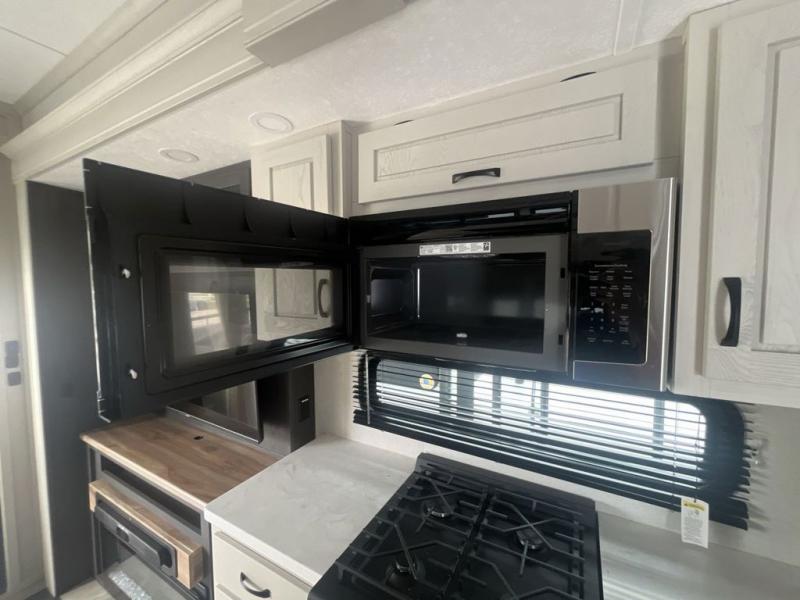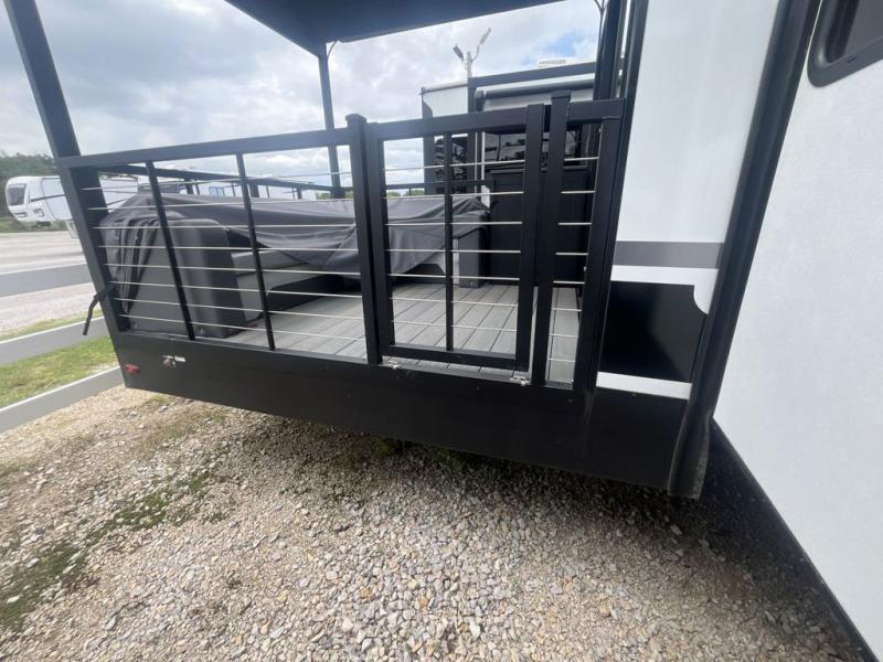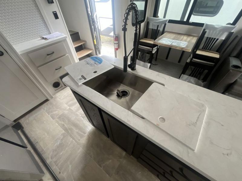 Step outside and enjoy the fresh air on our covered patio, complete with a refrigerator and optional L-shaped sofa, which is the perfect place to relax and unwind after a long day of adventure. Inside, the kitchen/living room area will make you feel an at-home experience, featuring overhead cabinets, an entertainment center, theater seating, a free-spanning table, a kitchen island, a microwave, a refrigerator, and a pantry. Perfect for cooking up a storm, entertaining friends and family, or simply relaxing and enjoying the comforts of home. The full bathroom is a spacious oasis, complete with a shower with a seat, a linen closet, and more. Plus, with a front bedroom featuring a king bed, dresser, washer and dryer prep, and a large wardrobe, you'll have the perfect place to rest and recharge after a long day of adventure. With two entry/exit doors and a massive 20’ awning, you'll have easy access to the RV and plenty of shade and protection from the weather.