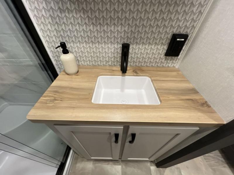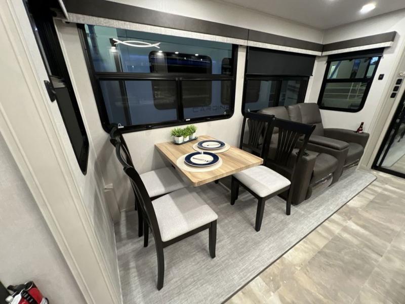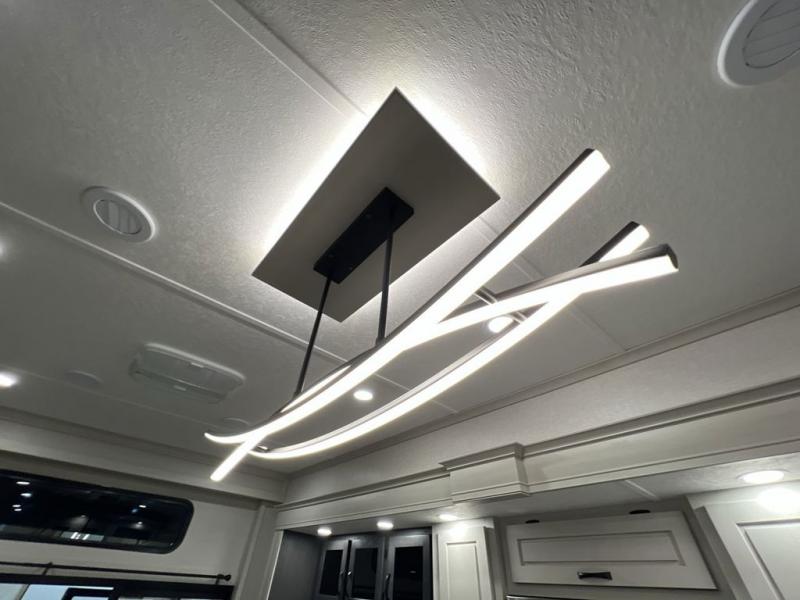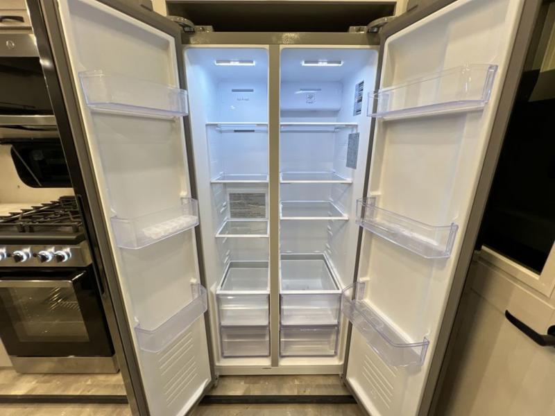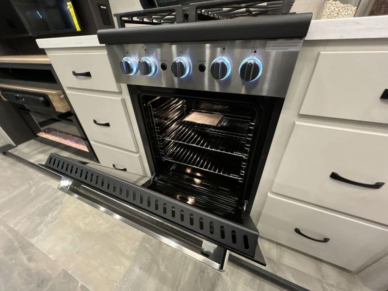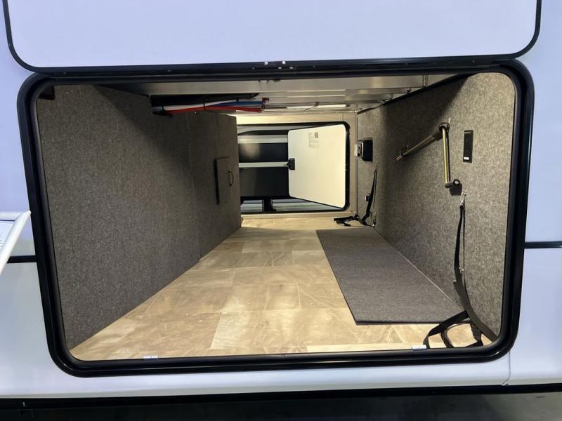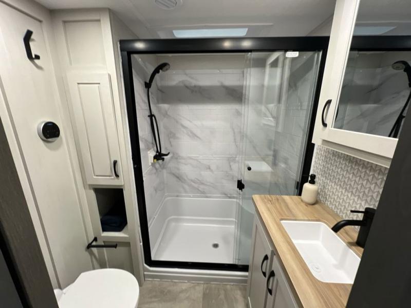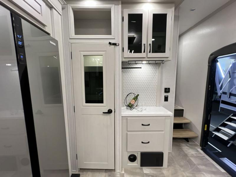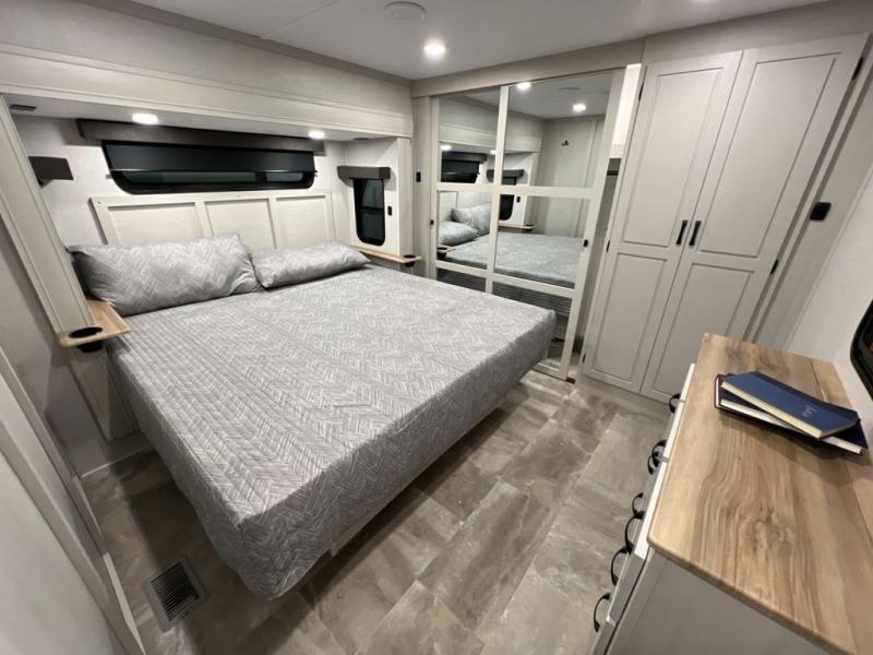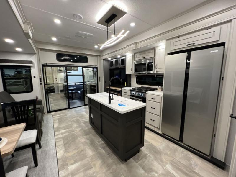 Step outside and enjoy the fresh air on our covered patio, complete with a refrigerator and optional L-shaped sofa, which is the perfect place to relax and unwind after a long day of adventure. Inside, the kitchen/living room area will make you feel an at-home experience, featuring overhead cabinets, an entertainment center, theater seating, a free-spanning table, a kitchen island, a microwave, a refrigerator, and a pantry. Perfect for cooking up a storm, entertaining friends and family, or simply relaxing and enjoying the comforts of home. The full bathroom is a spacious oasis, complete with a shower with a seat, a linen closet, and more. Plus, with a front bedroom featuring a king bed, dresser, washer and dryer prep, and a large wardrobe, you'll have the perfect place to rest and recharge after a long day of adventure. With two entry/exit doors and a massive 20’ awning, you'll have easy access to the RV and plenty of shade and protection from the weather.