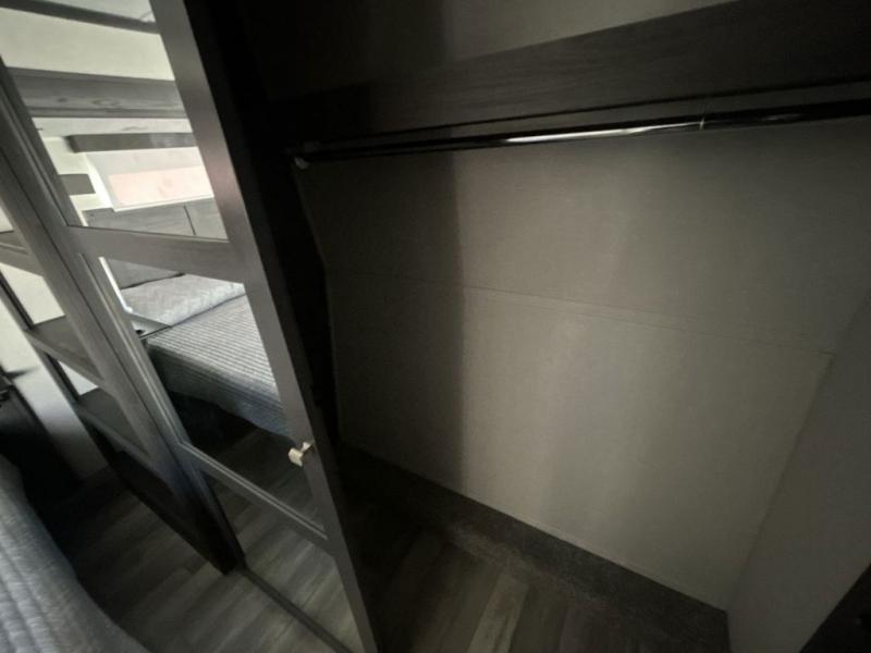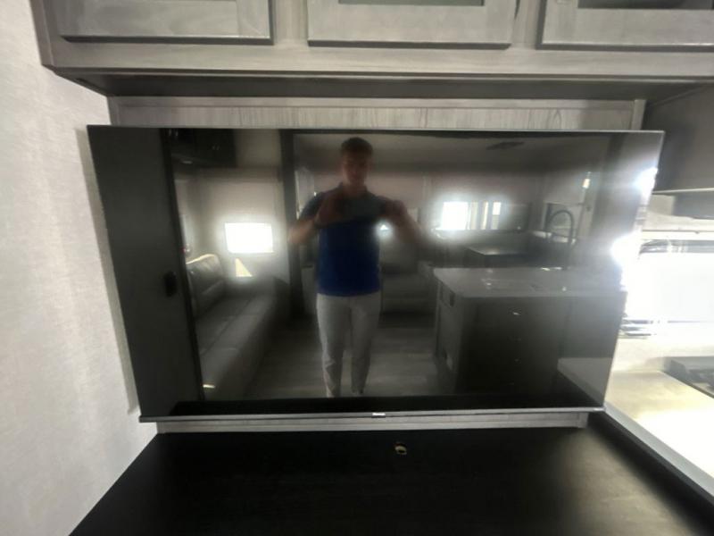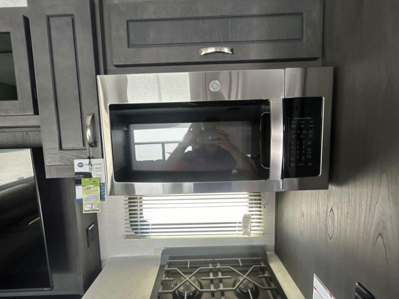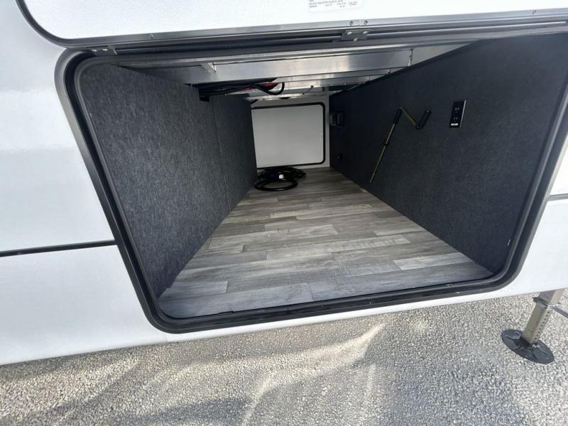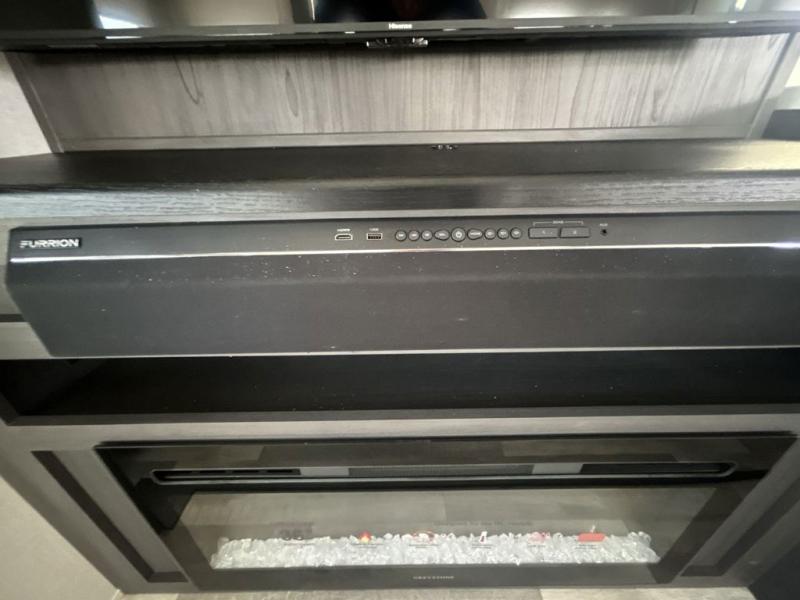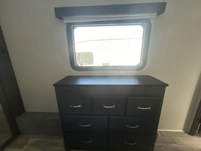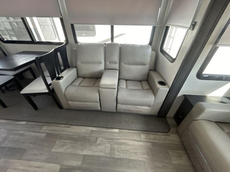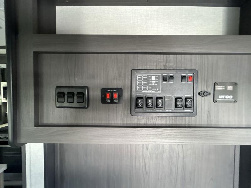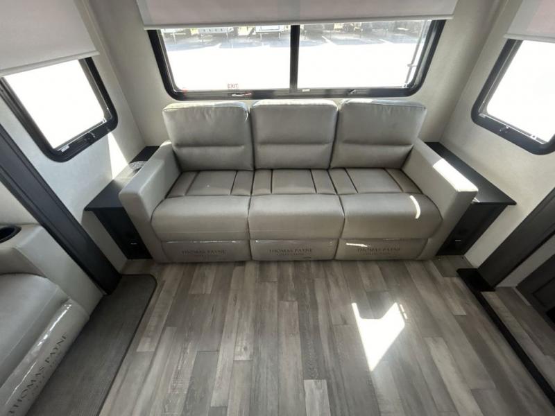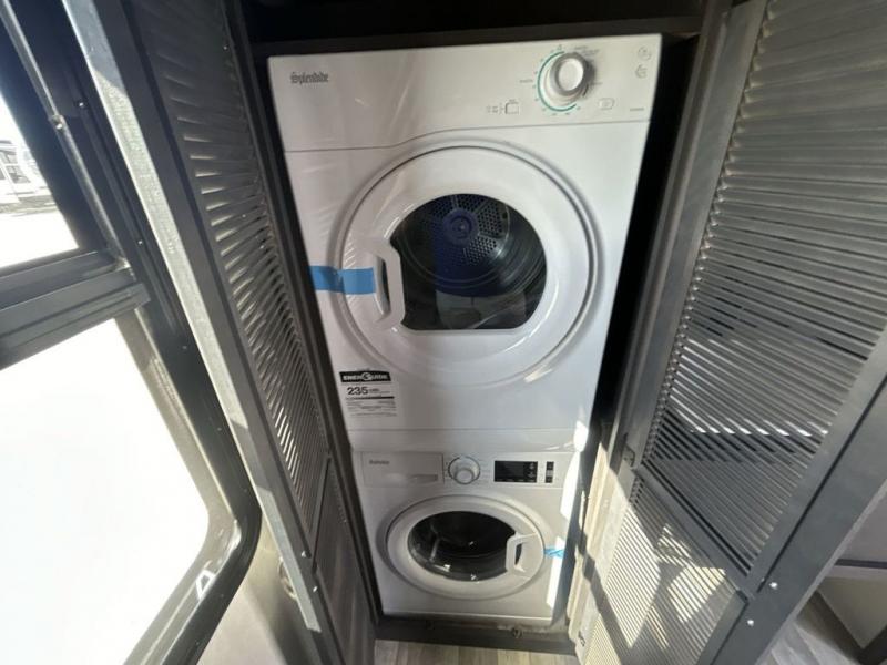 The rear living room is the perfect place to unwind, featuring a 78” trifold sofa, theater seating, overhead cabinets, and an entertainment center. Whether you're watching a movie, reading a book, or simply enjoying the company of loved ones, this room has everything you need to relax and recharge. The spacious kitchen is fitted with a kitchen island, refrigerator, microwave, free-standing table, hutch, and overhead cabinets. Perfect for preparing your favorite meals and enjoy with family. With a convenient coat bench, desk with flip-up storage, washer, and dryer, you'll have everything you need to stay organized and comfortable on the go. The full bathroom is an enormous oasis with a linen closet for added convenience. Also with a front bedroom featuring a king bed, dresser, shelves, and wardrobe, you'll have the perfect place to rest and recharge after a long day of adventure, also plenty of space for storing all your belongings and staying organized on the road.