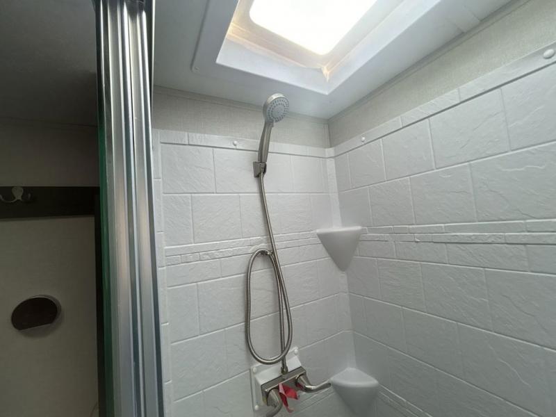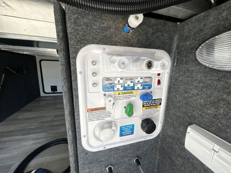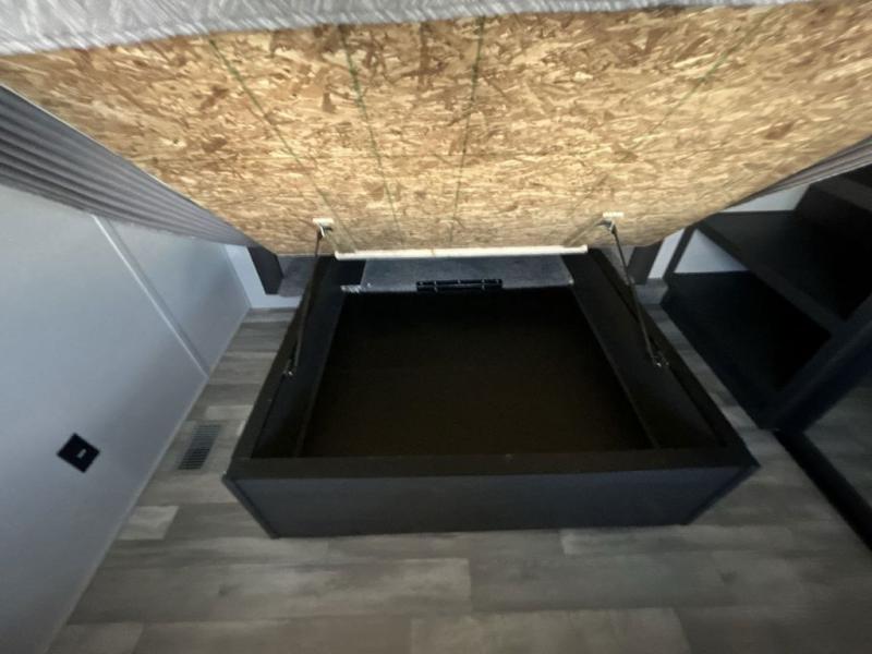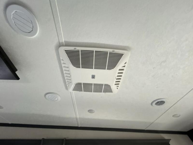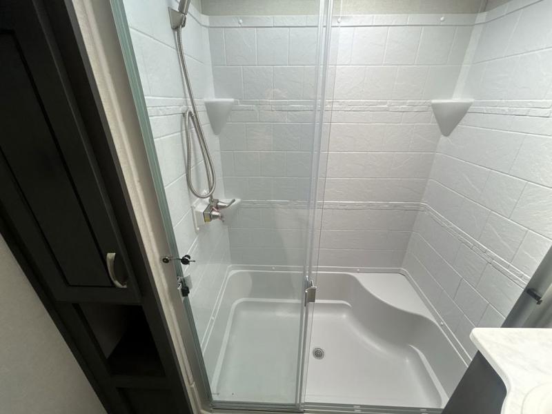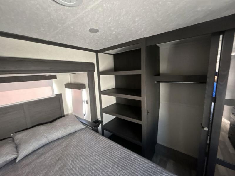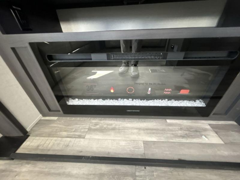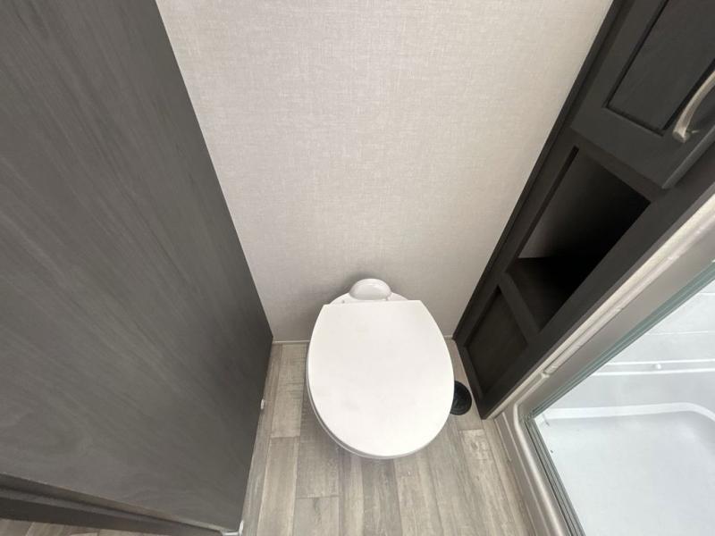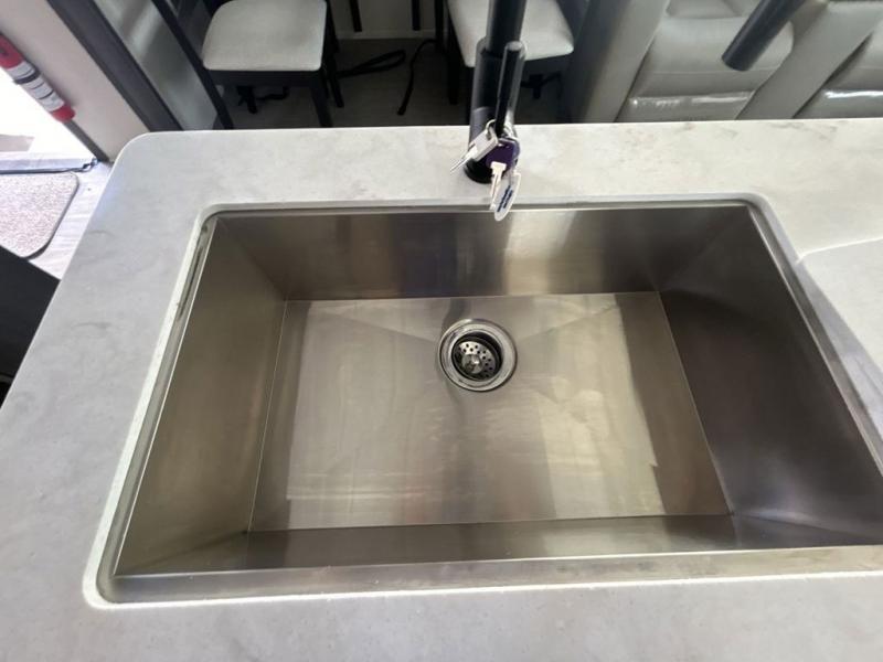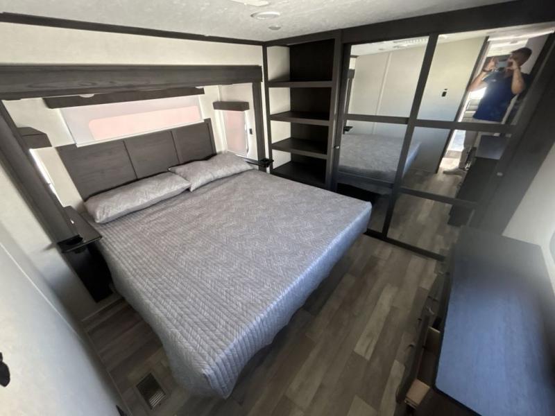 The rear living room is the perfect place to unwind, featuring a 78” trifold sofa, theater seating, overhead cabinets, and an entertainment center. Whether you're watching a movie, reading a book, or simply enjoying the company of loved ones, this room has everything you need to relax and recharge. The spacious kitchen is fitted with a kitchen island, refrigerator, microwave, free-standing table, hutch, and overhead cabinets. Perfect for preparing your favorite meals and enjoy with family. With a convenient coat bench, desk with flip-up storage, washer, and dryer, you'll have everything you need to stay organized and comfortable on the go. The full bathroom is an enormous oasis with a linen closet for added convenience. Also with a front bedroom featuring a king bed, dresser, shelves, and wardrobe, you'll have the perfect place to rest and recharge after a long day of adventure, also plenty of space for storing all your belongings and staying organized on the road.
