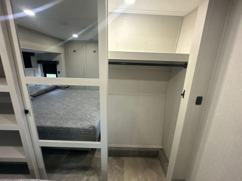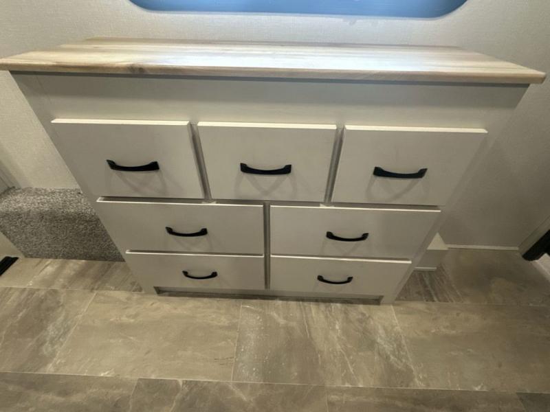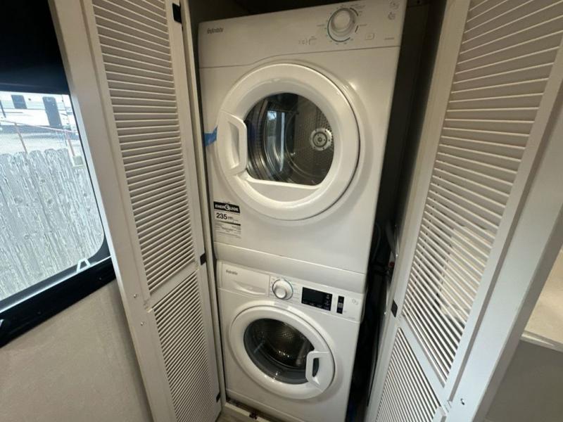 The rear living room is the perfect place to unwind, featuring a 78” trifold sofa, theater seating, overhead cabinets, and an entertainment center. Whether you're watching a movie, reading a book, or simply enjoying the company of loved ones, this room has everything you need to relax and recharge. The spacious kitchen is fitted with a kitchen island, refrigerator, microwave, free-standing table, hutch, and overhead cabinets. Perfect for preparing your favorite meals and enjoy with family. With a convenient coat bench, desk with flip-up storage, washer, and dryer, you'll have everything you need to stay organized and comfortable on the go. The full bathroom is an enormous oasis with a linen closet for added convenience. Also with a front bedroom featuring a king bed, dresser, shelves, and wardrobe, you'll have the perfect place to rest and recharge after a long day of adventure, also plenty of space for storing all your belongings and staying organized on the road.