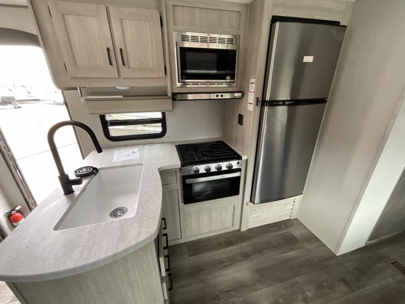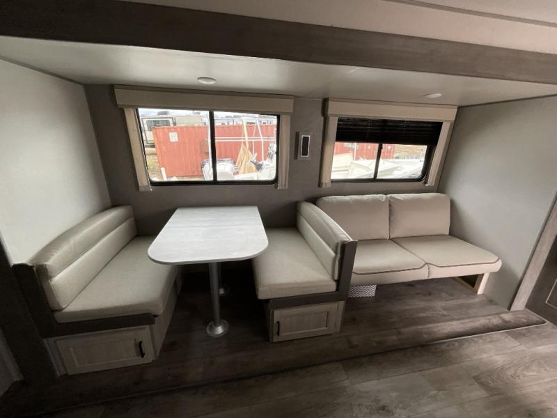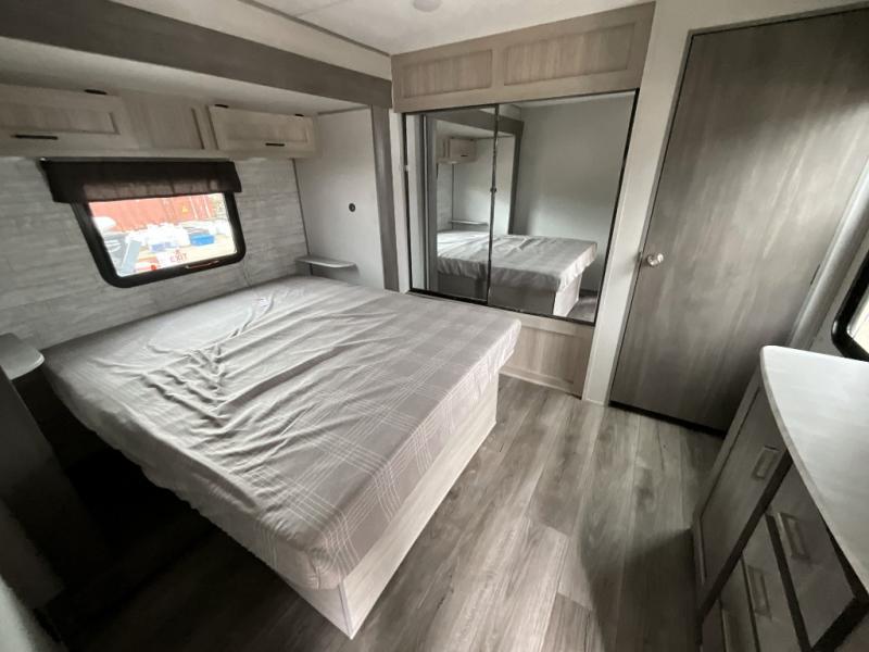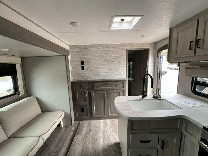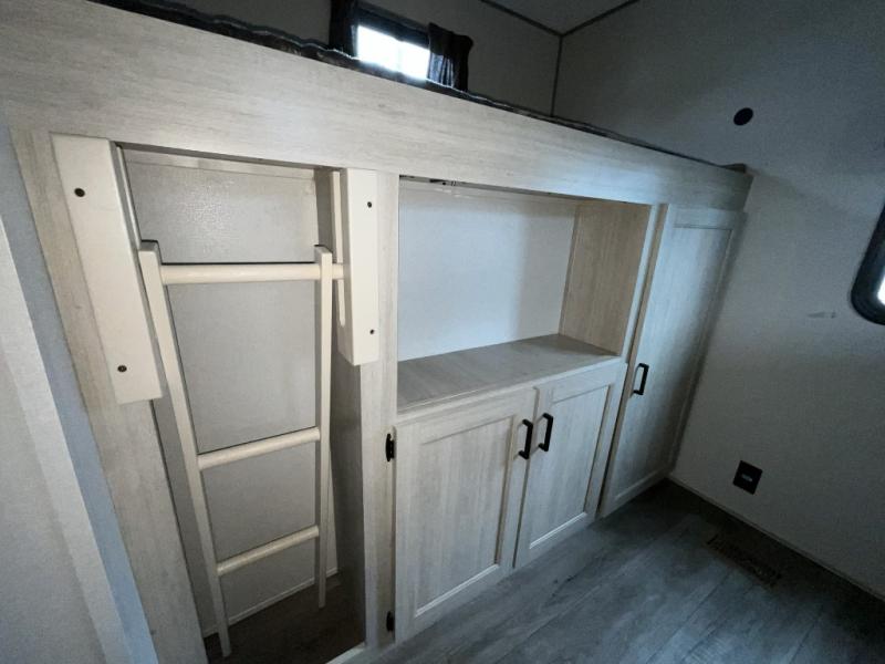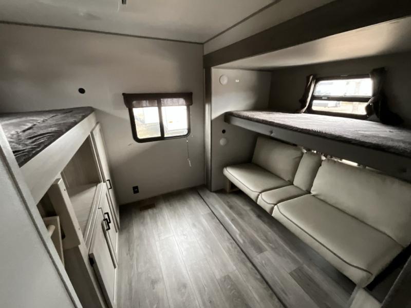 This family-friendly trailer offers lots of floor space thanks to the triple slides throughout! You and your family will love the combined living and kitchen area with a slide out booth dinette and a sofa with drink holders. The L-shaped kitchen counter allows the cook to make meals without moving for anyone trying to get to the full bathroom or the rear bunkhouse. The kids will have their own privacy, two bunk beds, a jack knife sofa with storage totes below plus a TV/wardrobe cabinet. The front private bedroom allows you to sleep like royalty and offers a large closet for your clothing and another closet prepped for a washer/dryer. And don't forget about the full-size camper kitchen and the 21' power awning with multicolor LED lights when you are outside.