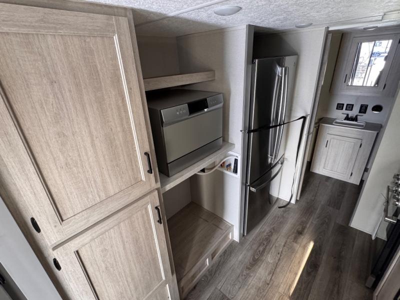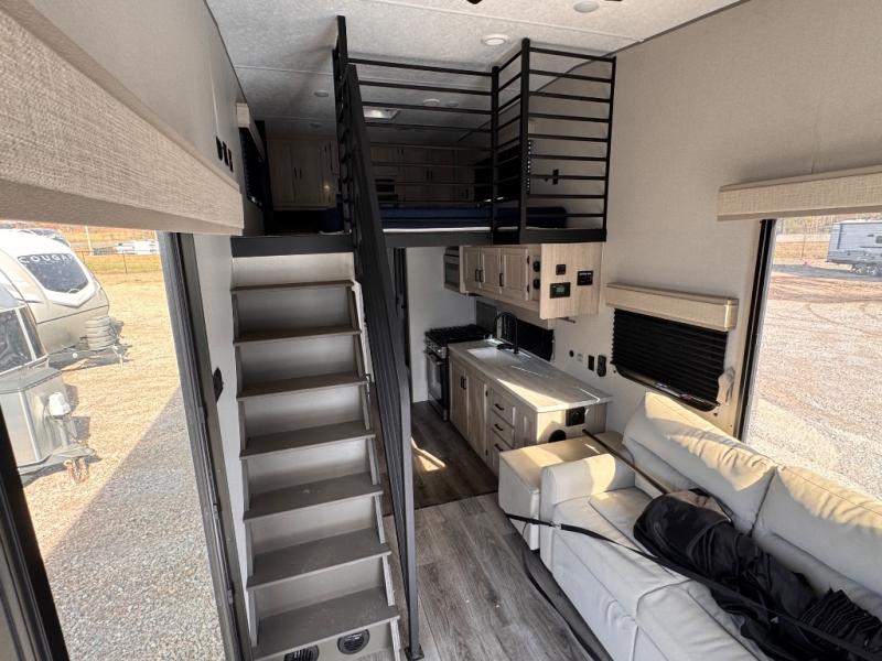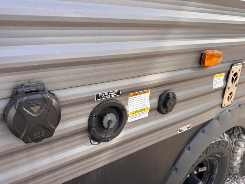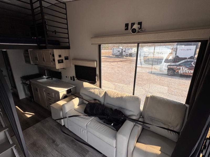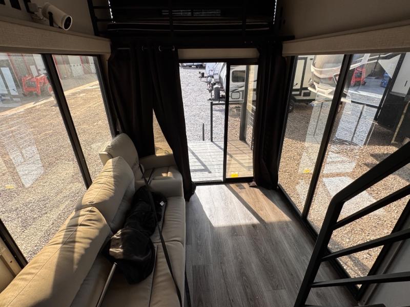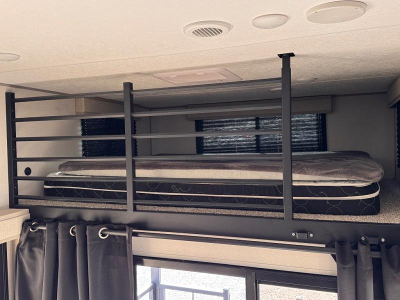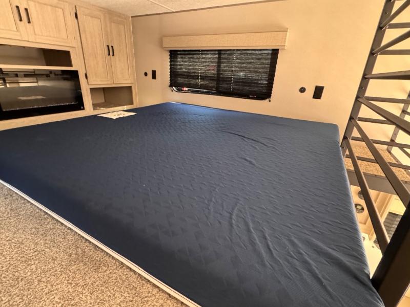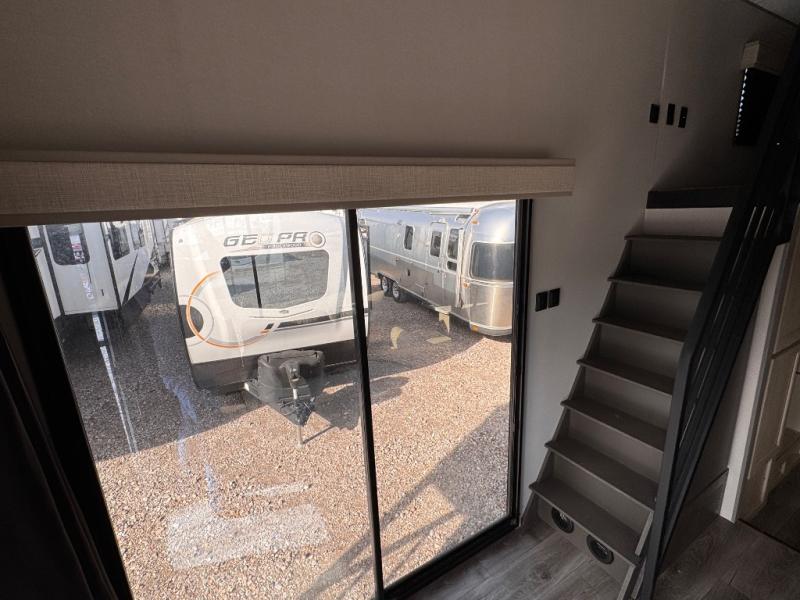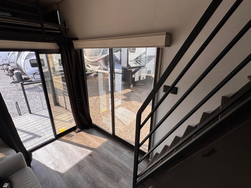 If you are looking for the ultimate camp experience you are going to love this double loft unit with a view! A 180 degree view from inside the front portion with large windows on each side and a full glass front patio door to an outside covered porch with composite decking for years of easy maintenance. Above the covered porch inside, there is a removeable ladder to the front loft space with a queen bunk mattress for sleeping. A staircase to the rear master loft allows for storage under the stairs, and the master loft features a king bed mattress, electric fireplace, and plenty of storage for your things. There are also nice views from both lofts. The living room and kitchen feature all of the necessities to be comfortable. A tri-fold sofa and recliner for relaxing, and an ottoman also has a hinged lift table for dining. The kitchen features all of the appliances needed to create meals and snacks just like at home including a residential refrigerator for your perishables. The rear bath offers privacy and a nice size shower, toilet, and plenty of storage for towels and toiletries. Your family is sure to love this double loft unit!