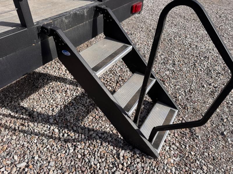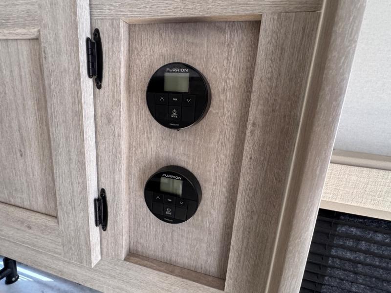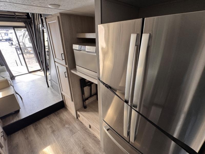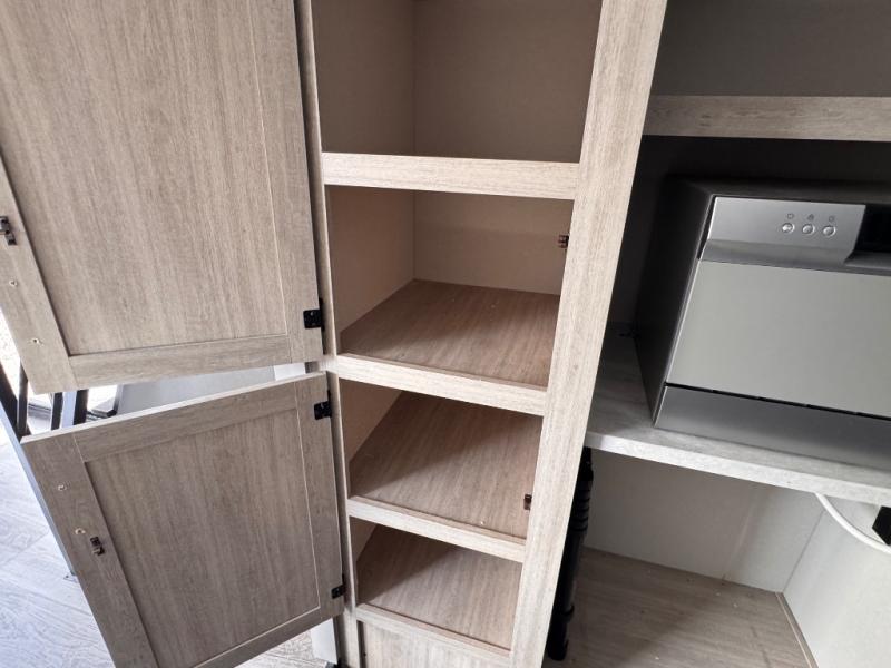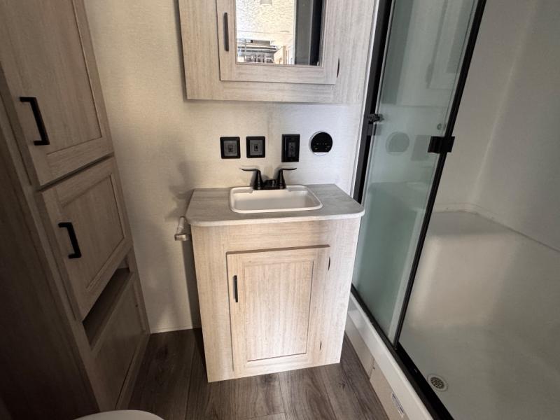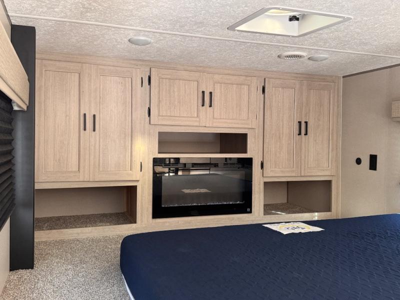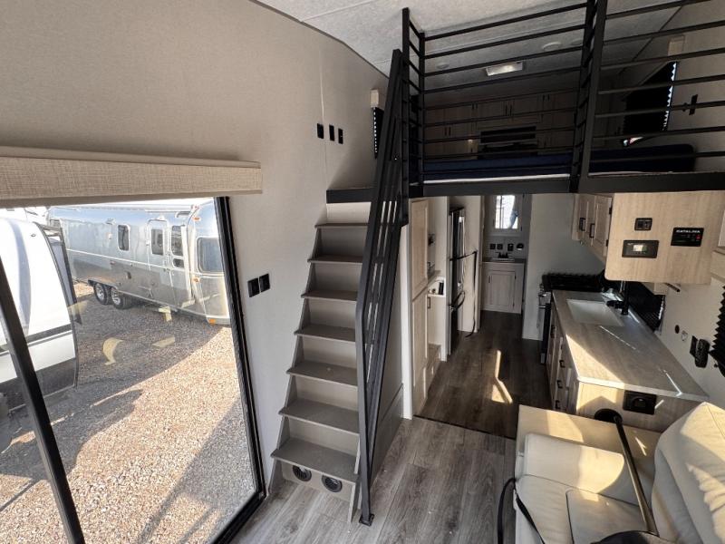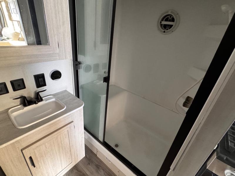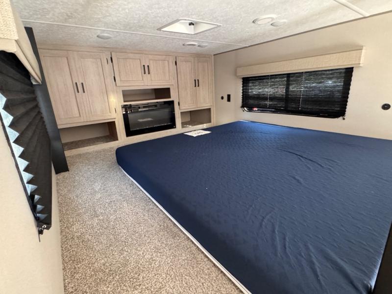 If you are looking for the ultimate camp experience you are going to love this double loft unit with a view! A 180 degree view from inside the front portion with large windows on each side and a full glass front patio door to an outside covered porch with composite decking for years of easy maintenance. Above the covered porch inside, there is a removeable ladder to the front loft space with a queen bunk mattress for sleeping. A staircase to the rear master loft allows for storage under the stairs, and the master loft features a king bed mattress, electric fireplace, and plenty of storage for your things. There are also nice views from both lofts. The living room and kitchen feature all of the necessities to be comfortable. A tri-fold sofa and recliner for relaxing, and an ottoman also has a hinged lift table for dining. The kitchen features all of the appliances needed to create meals and snacks just like at home including a residential refrigerator for your perishables. The rear bath offers privacy and a nice size shower, toilet, and plenty of storage for towels and toiletries. Your family is sure to love this double loft unit!