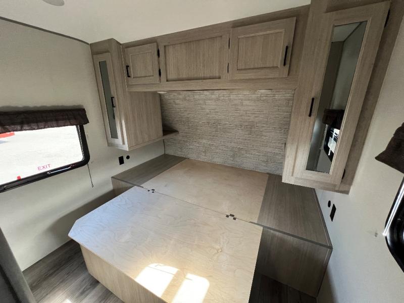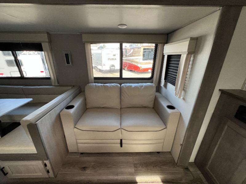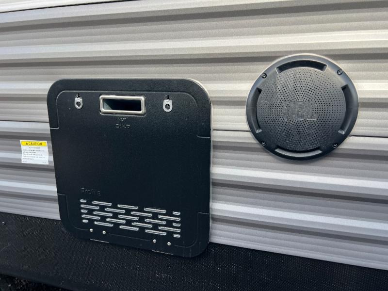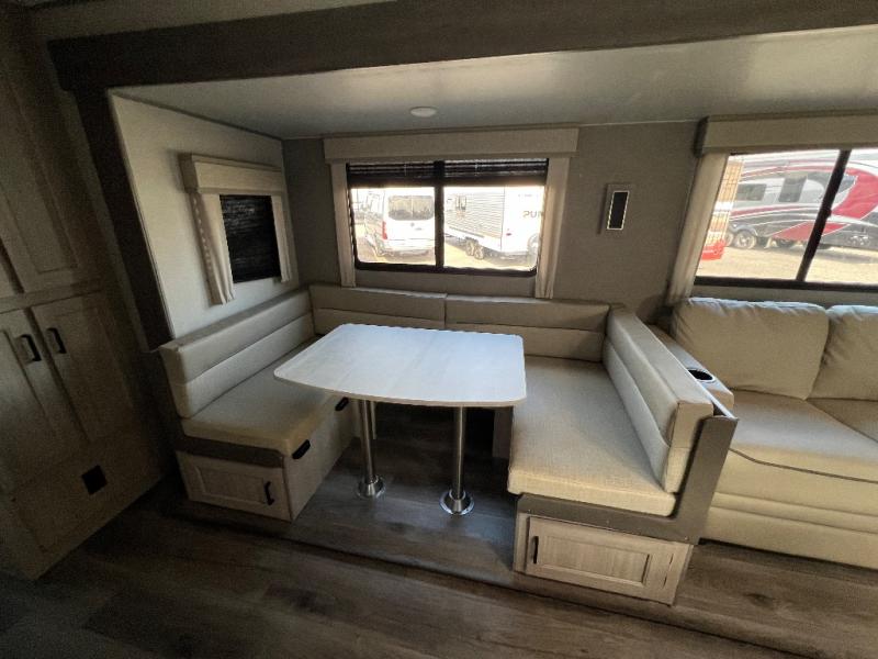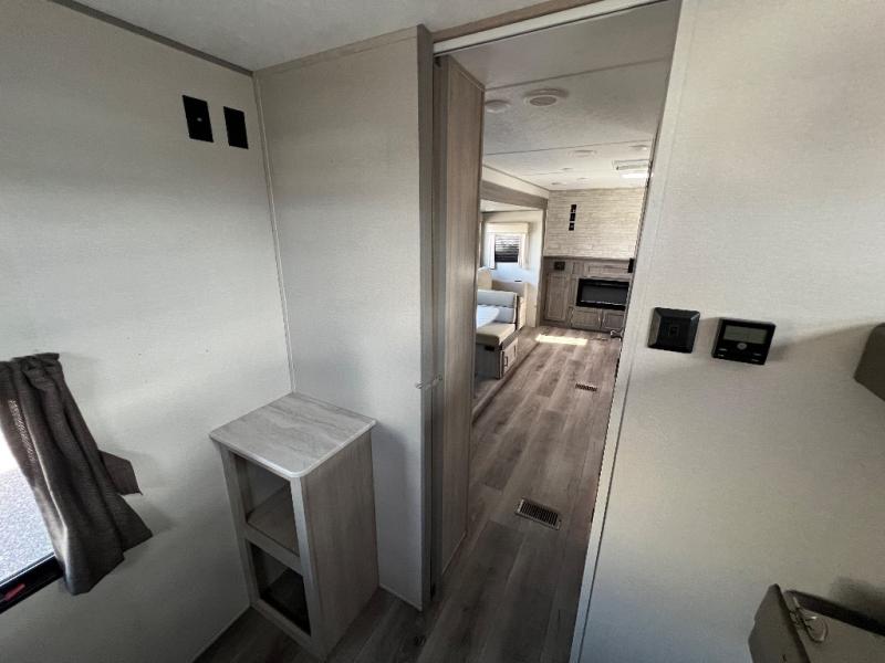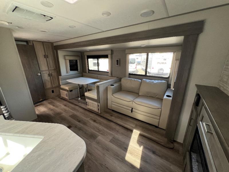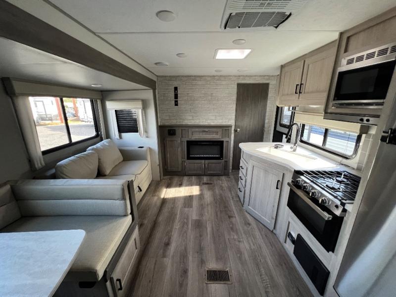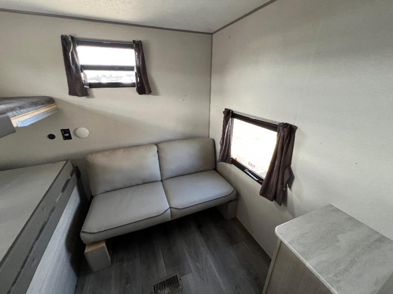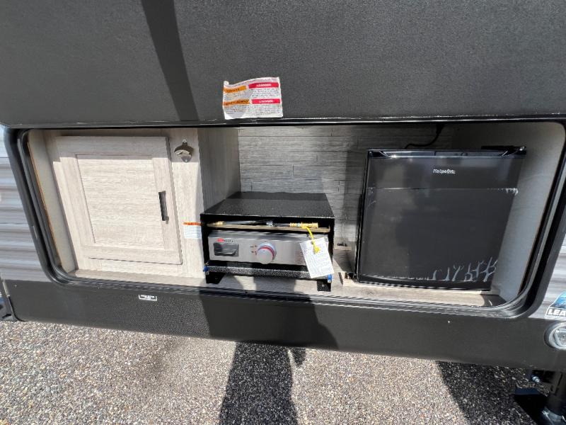 Not only will you be comfortable in this trailer, your friends will have comfort and privacy thanks to having their own bunkhouse, and you'll have a front bedroom where you can sleep like royalty! There are three bunk beds and a jack knife sofa with storage totes below plus a TV cabinet if you want to add a television here. The combined living and kitchen is spacious thanks to the slide out U-shaped dinette and sofa with drink holders. You can even add the fireplace option if you want that feature. The cook will have full amenities to whip up meals including overhead cabinets for dishes and snacks. And the exterior camper kitchen allows the cook to visit with everyone outside under the 18' electric awning that includes multicolor LED lights with a remote.