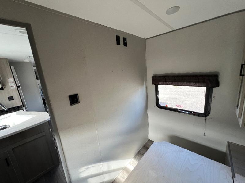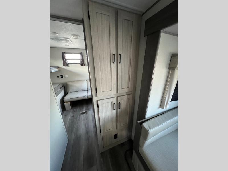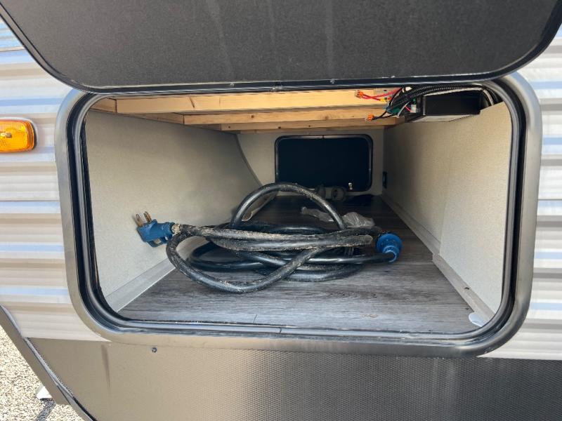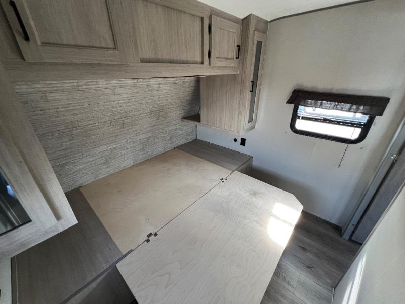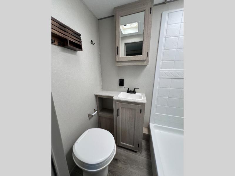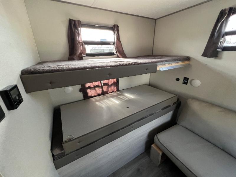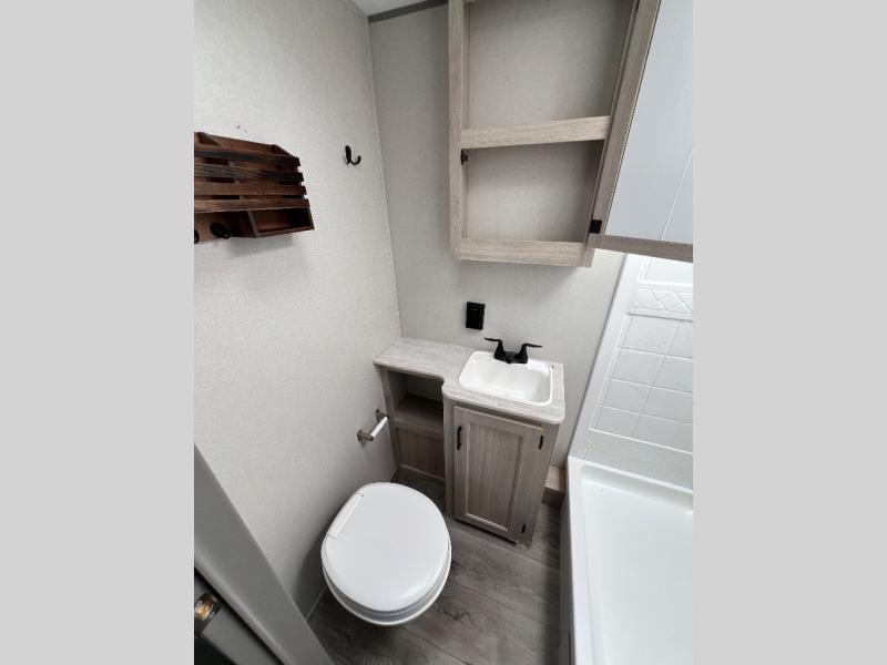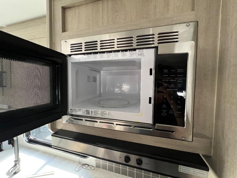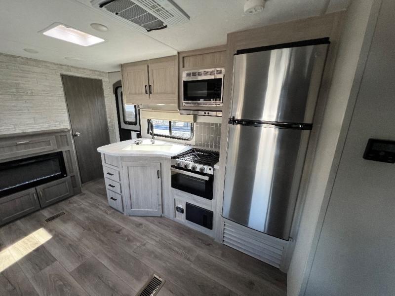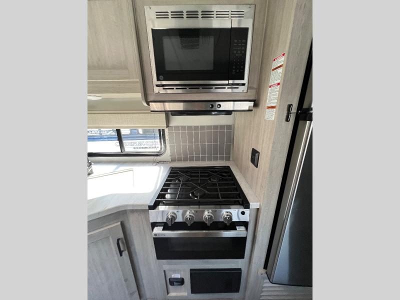 Not only will you be comfortable in this trailer, your friends will have comfort and privacy thanks to having their own bunkhouse, and you'll have a front bedroom where you can sleep like royalty! There are three bunk beds and a jack knife sofa with storage totes below plus a TV cabinet if you want to add a television here. The combined living and kitchen is spacious thanks to the slide out U-shaped dinette and sofa with drink holders. You can even add the fireplace option if you want that feature. The cook will have full amenities to whip up meals including overhead cabinets for dishes and snacks. And the exterior camper kitchen allows the cook to visit with everyone outside under the 18' electric awning that includes multicolor LED lights with a remote.