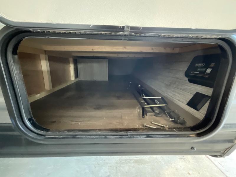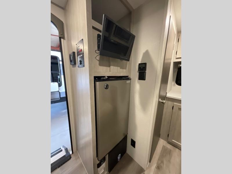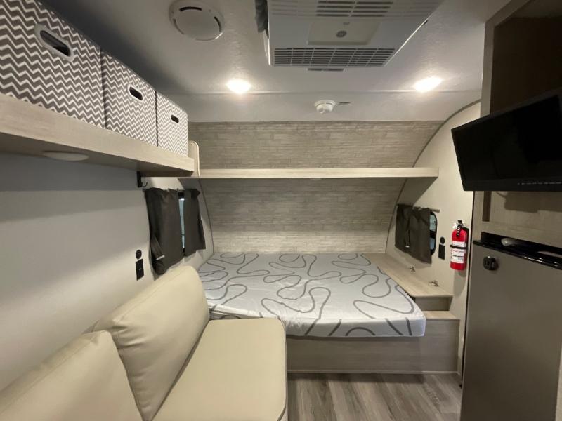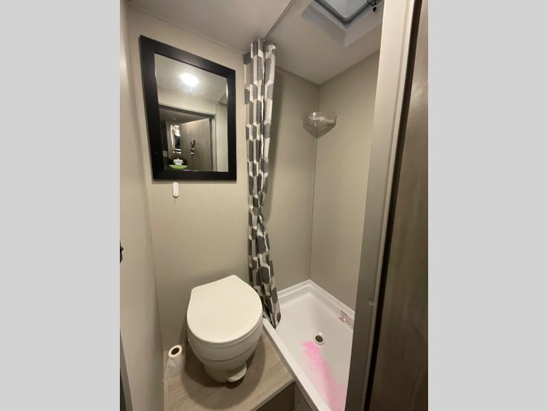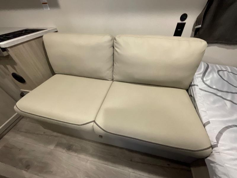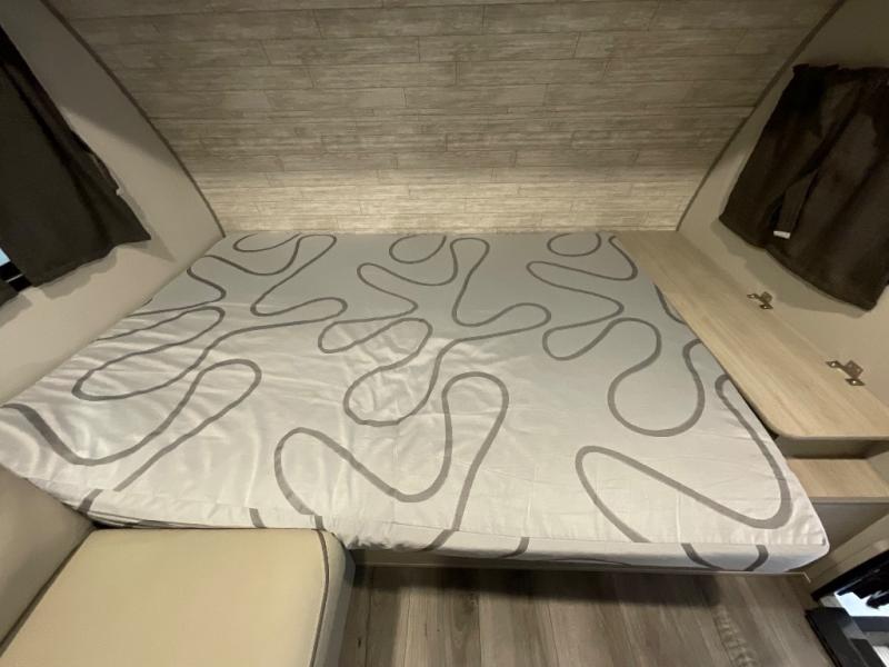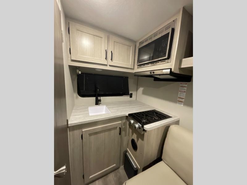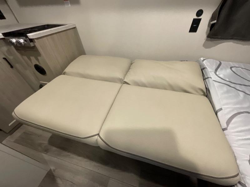 Lightweight camping is easier than you think with this travel trailer in tow! The front 54" x 74" queen bed will provide a great night's rest each night, while your overnight guest takes the 60" Jack knife sofa. There is a handy shelf above the front bed for your belongings plus a shelf with bins over the sofa. A private bath includes a 24" x 32" shower and a toilet with a mirror behind it so you can freshen up each day. You'll also find a two burner cooktop and microwave oven to make meals each day plus a 3.3 cu. ft. 12V refrigerator for food storage!