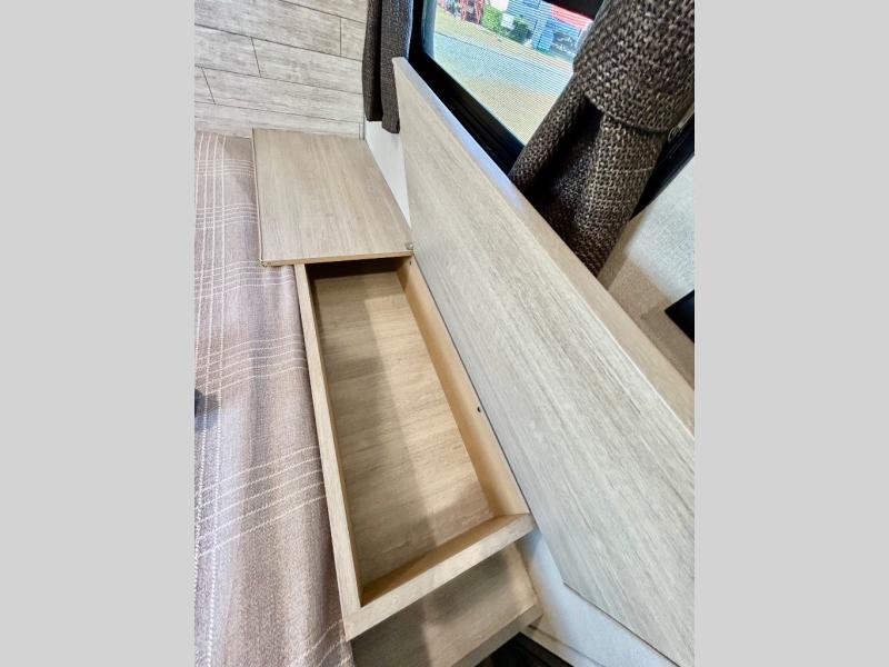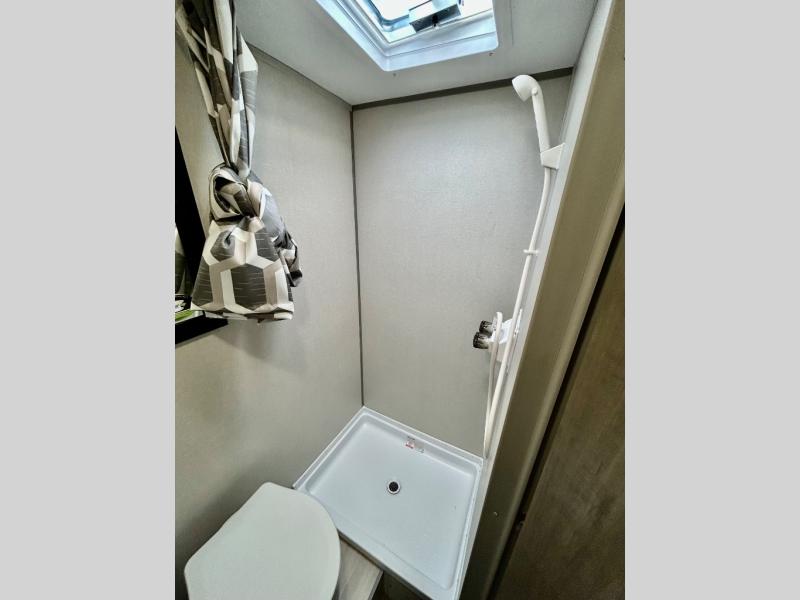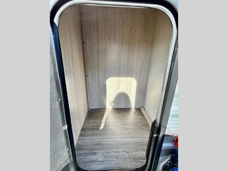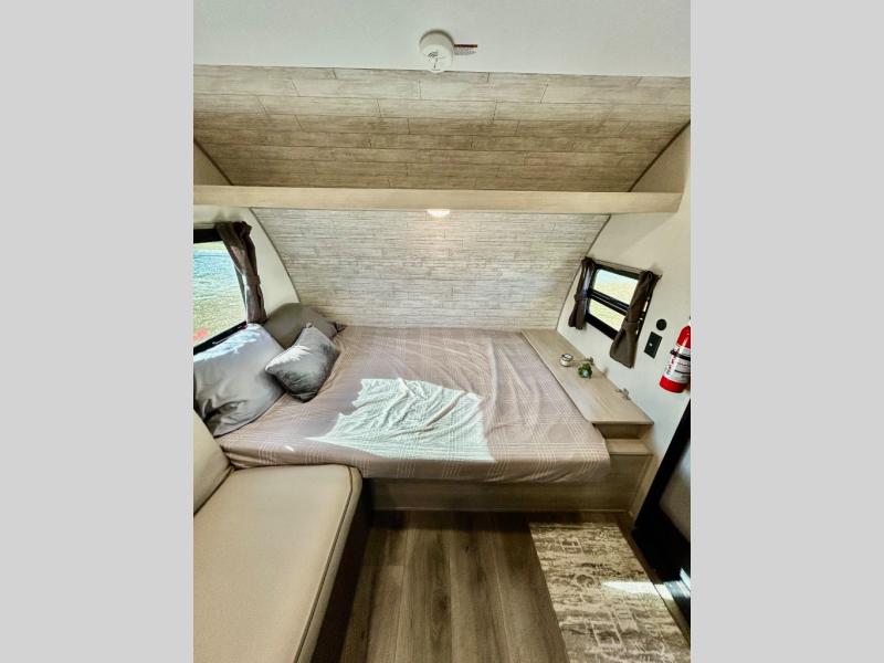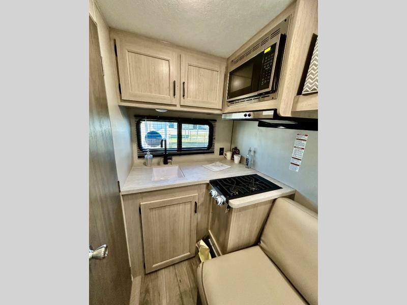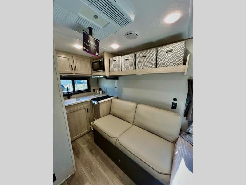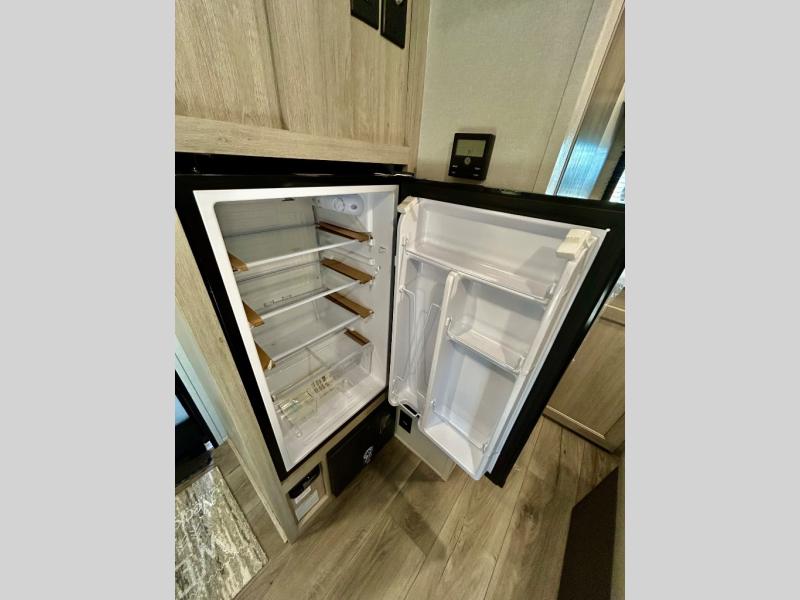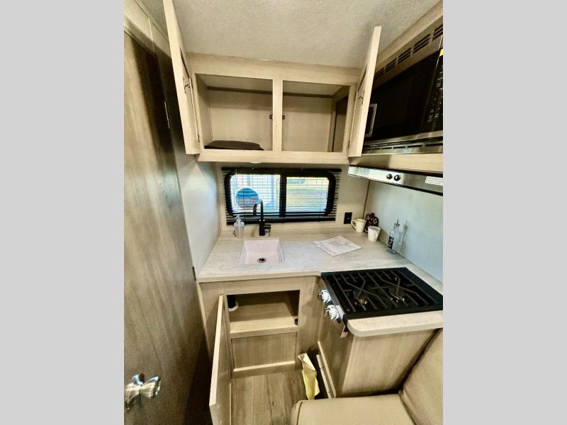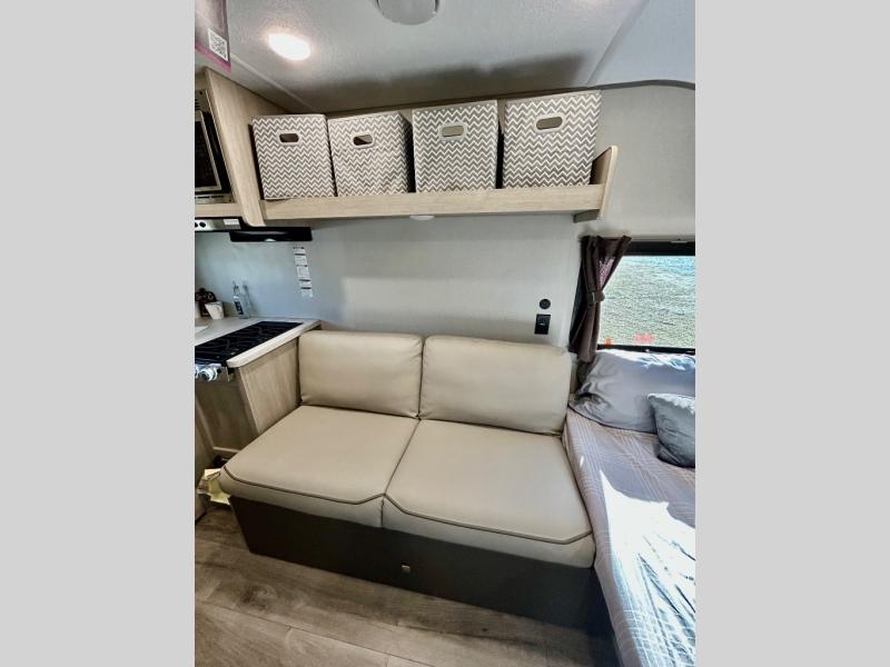 Lightweight camping is easier than you think with this travel trailer in tow! The front 54" x 74" queen bed will provide a great night's rest each night, while your overnight guest takes the 60" Jack knife sofa. There is a handy shelf above the front bed for your belongings plus a shelf with bins over the sofa. A private bath includes a 24" x 32" shower and a toilet with a mirror behind it so you can freshen up each day. You'll also find a two burner cooktop and microwave oven to make meals each day plus a 3.3 cu. ft. 12V refrigerator for food storage!