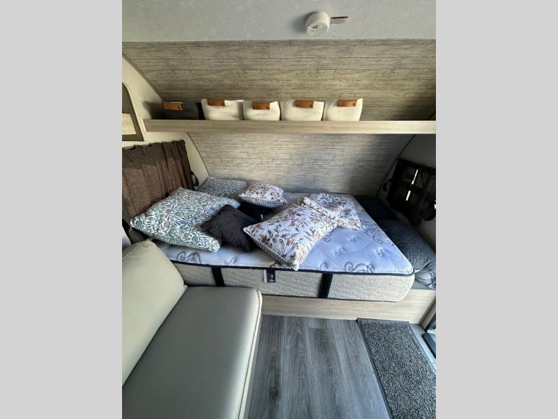 Lightweight camping is easier than you think with this travel trailer in tow! The front 54" x 74" queen bed will provide a great night's rest each night, while your overnight guest takes the 60" Jack knife sofa. There is a handy shelf above the front bed for your belongings plus a shelf with bins over the sofa. A private bath includes a 24" x 32" shower and a toilet with a mirror behind it so you can freshen up each day. You'll also find a two burner cooktop and microwave oven to make meals each day plus a 3.3 cu. ft. 12V refrigerator for food storage!