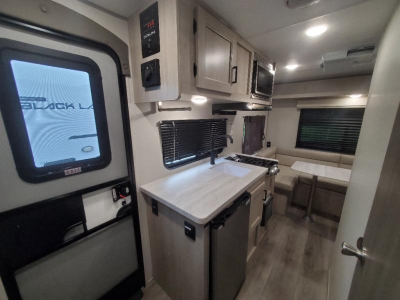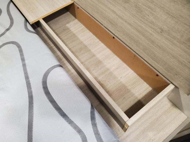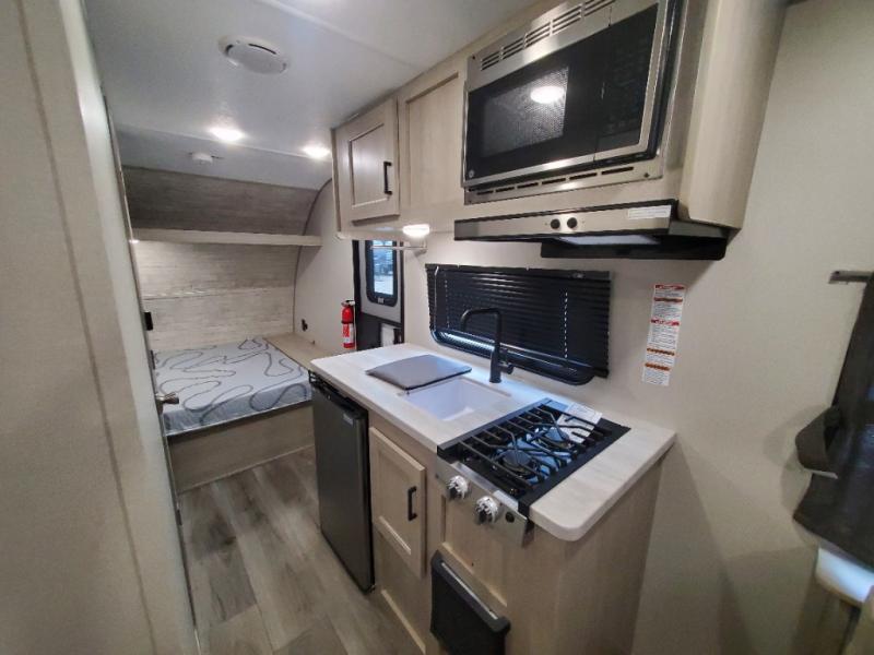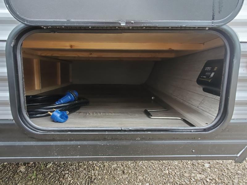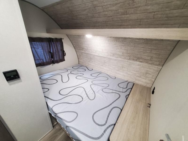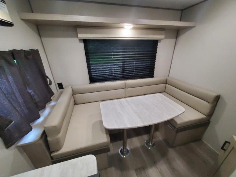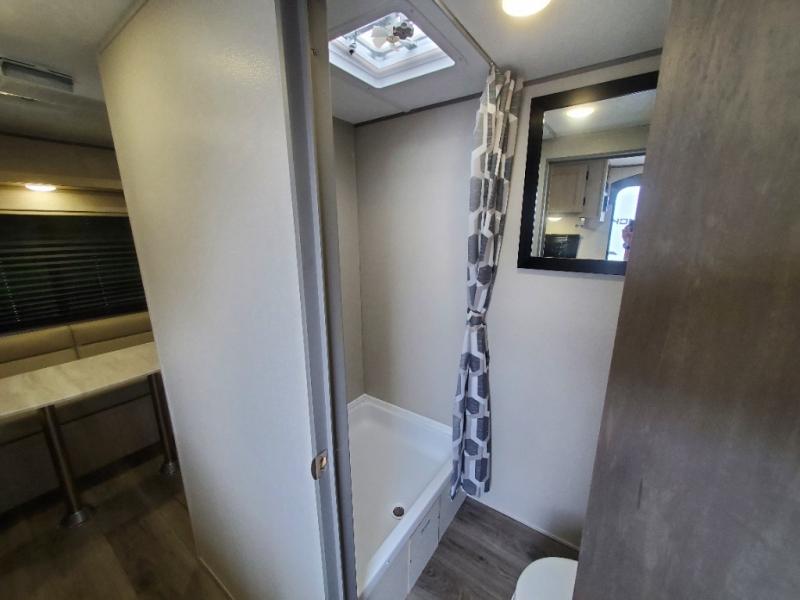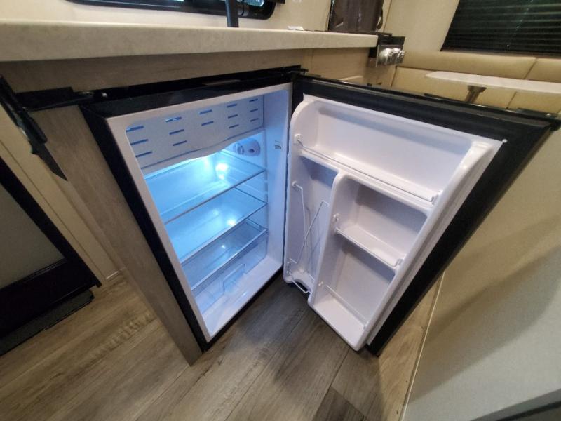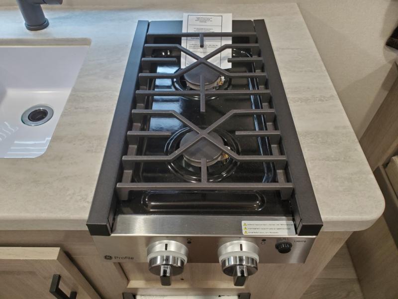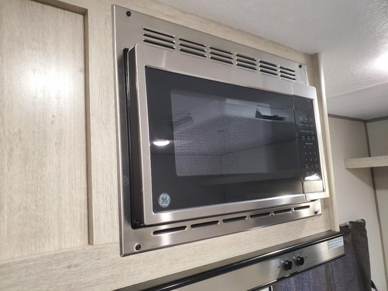 The perfect unit for a cozy weekend retreat for two or three! There is a queen bed up front with overhead storage and more at the foot of the bed to keep your things tidy. The rear of the unit offers a U-shaped dinette with an end table on one end and a handy overhead shelf which is a great spot for meals, watching TV or playing cards and games. A mid-coach bath includes a 36" x 30" shower and toilet with foot flush, plus a storage shelf for necessities. This model also includes a GE two burner cooktop, a GE stainless microwave oven, plus a 3.3 cu. ft. 12V refrigerator to keep food fresh!