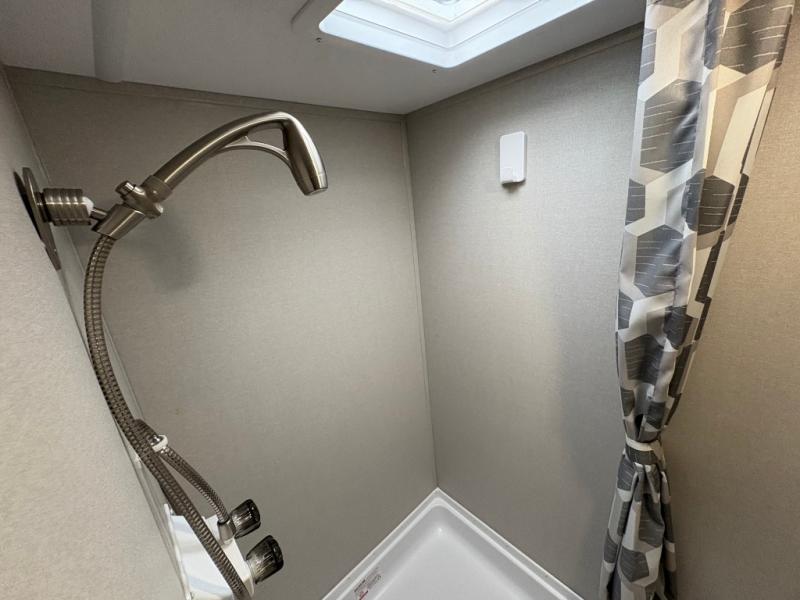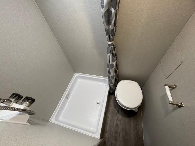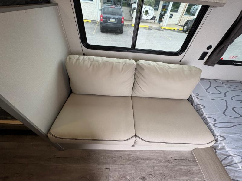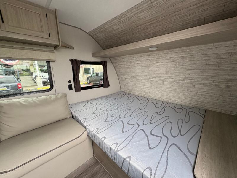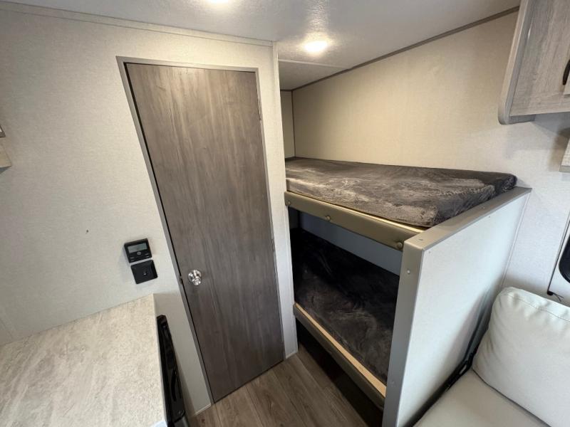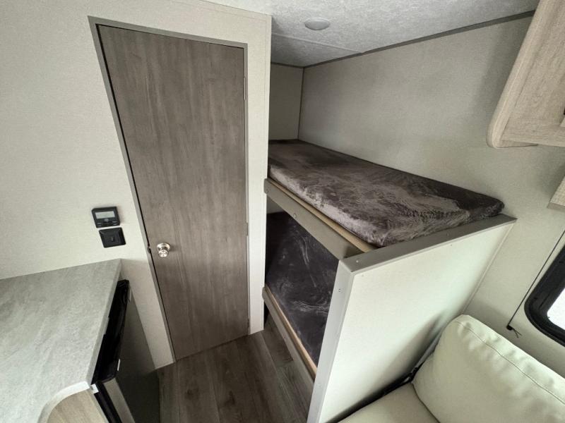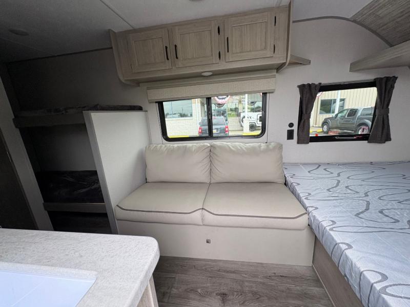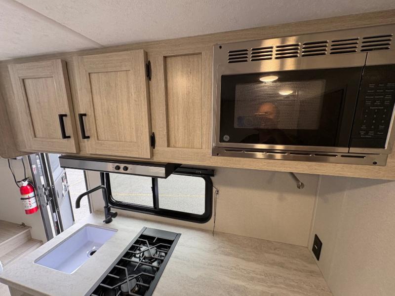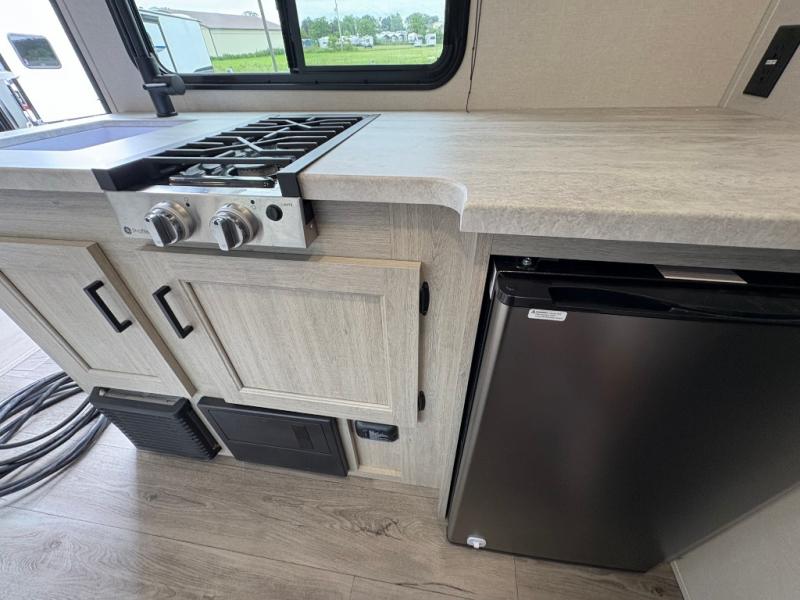 This travel trailers is perfect for a young family or smaller group. You can easily sleep four or more with the rear set of bunk beds and queen bed up front. There is also a 60" sofa for inside down-time, as well as complete kitchen and bath amenities so you can cook and stay clean while traveling. The rear corner bath features a toilet and 36" x 30" shower, and it's conveniently located next to the bunk beds which is great for little ones at night. Cooking inside will be easy with a GE stainless two-burner cooktop and single sink, plus there is also a GE microwave oven for snacks and things that you can easily warm up. If you plan to spend most of your time outdoors, you will find plenty of storage space in the front exterior storage compartment, and there is also plenty of storage inside as well.