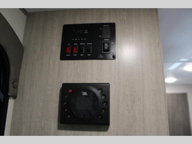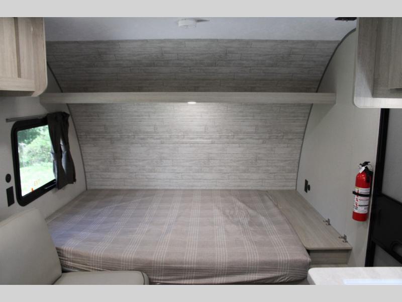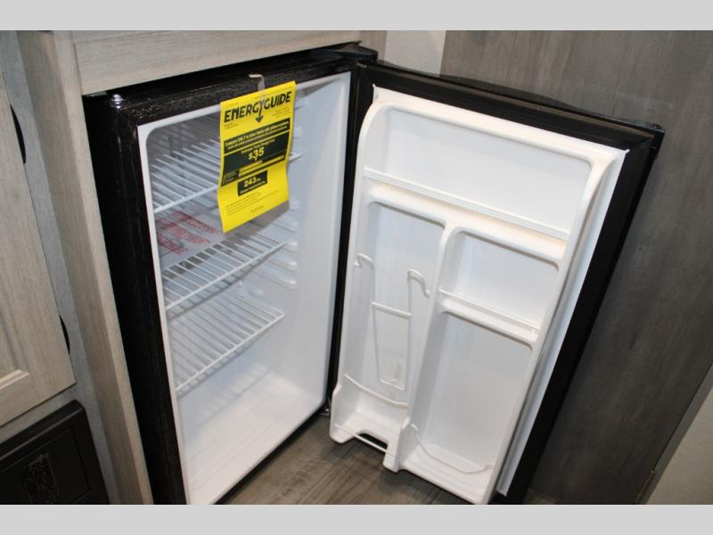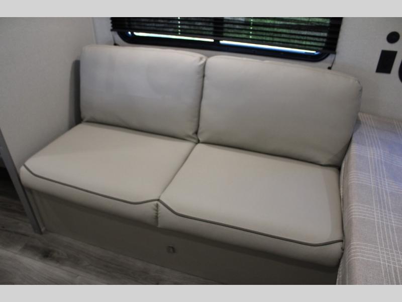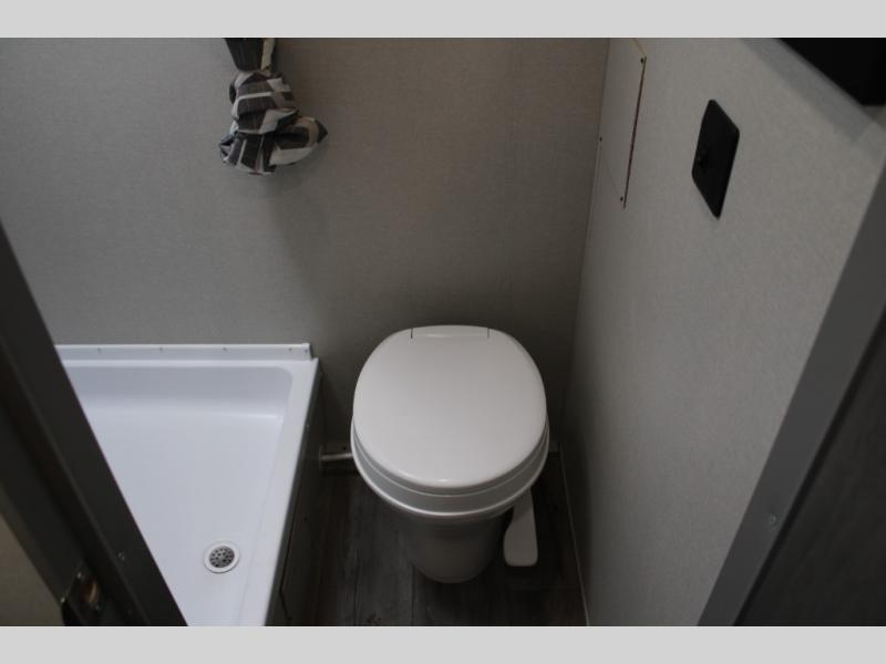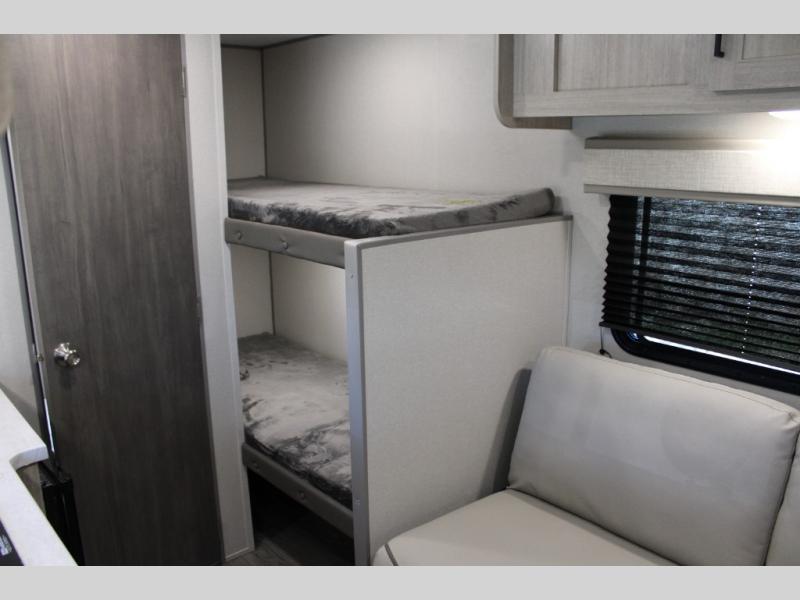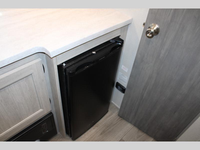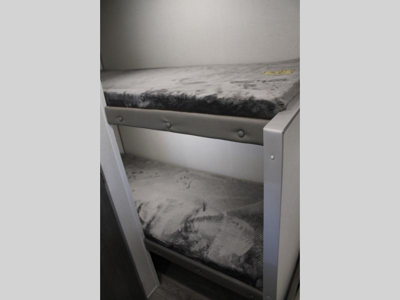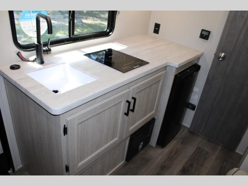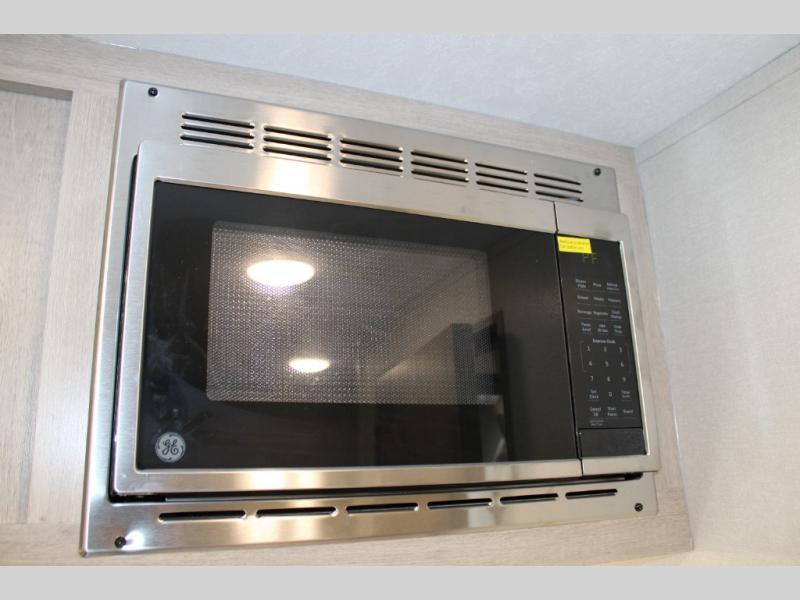 This travel trailers is perfect for a young family or smaller group. You can easily sleep four or more with the rear set of bunk beds and queen bed up front. There is also a 60" sofa for inside down-time, as well as complete kitchen and bath amenities so you can cook and stay clean while traveling. The rear corner bath features a toilet and 36" x 30" shower, and it's conveniently located next to the bunk beds which is great for little ones at night. Cooking inside will be easy with a GE stainless two-burner cooktop and single sink, plus there is also a GE microwave oven for snacks and things that you can easily warm up. If you plan to spend most of your time outdoors, you will find plenty of storage space in the front exterior storage compartment, and there is also plenty of storage inside as well.