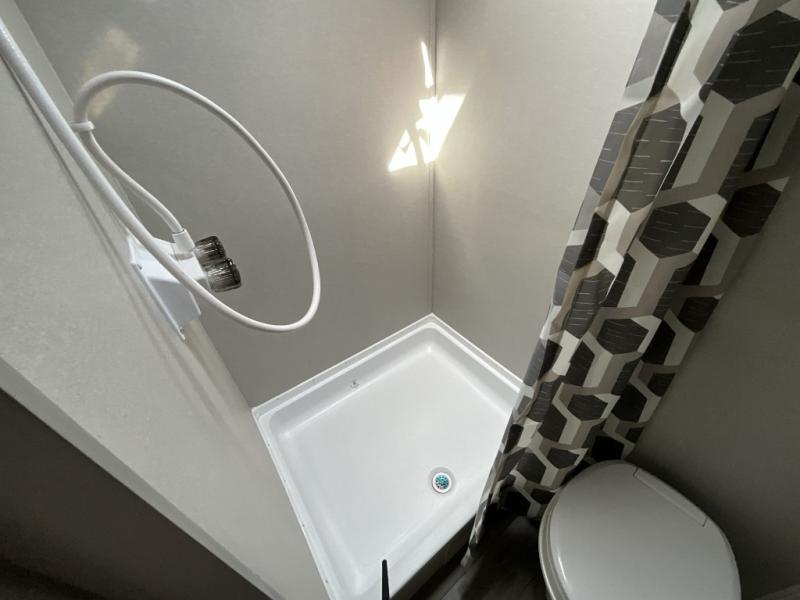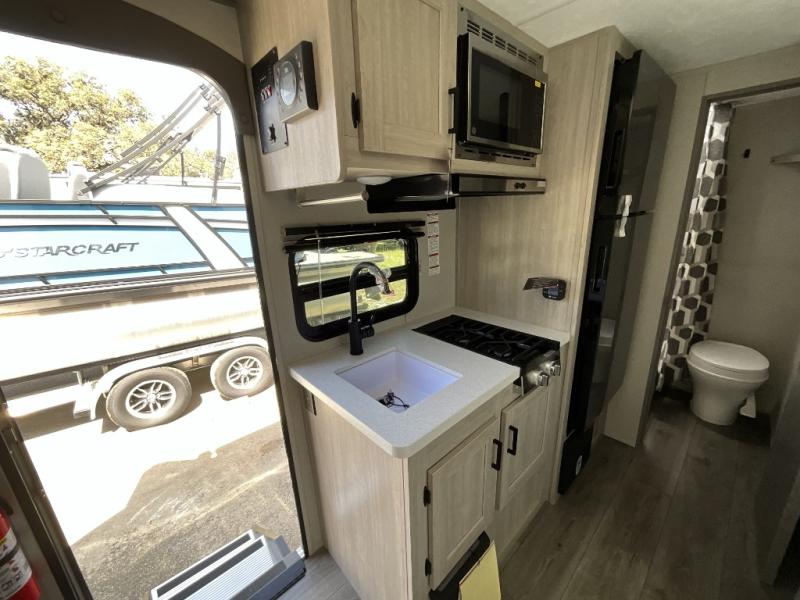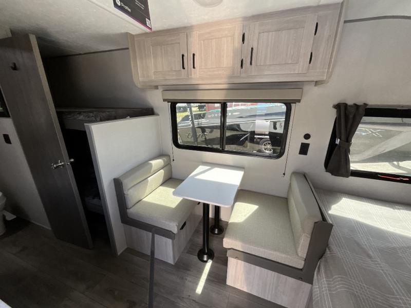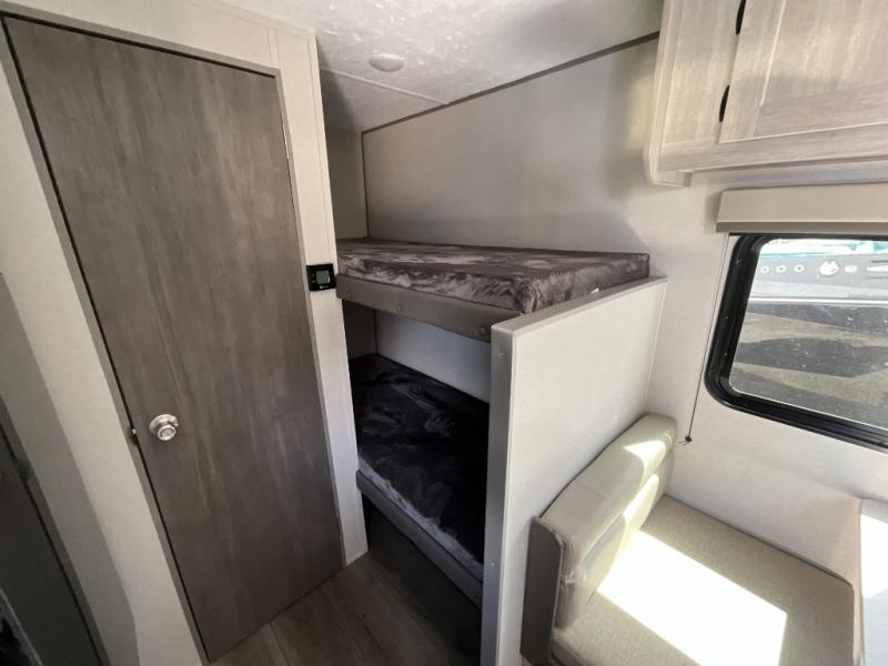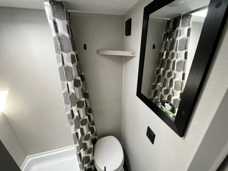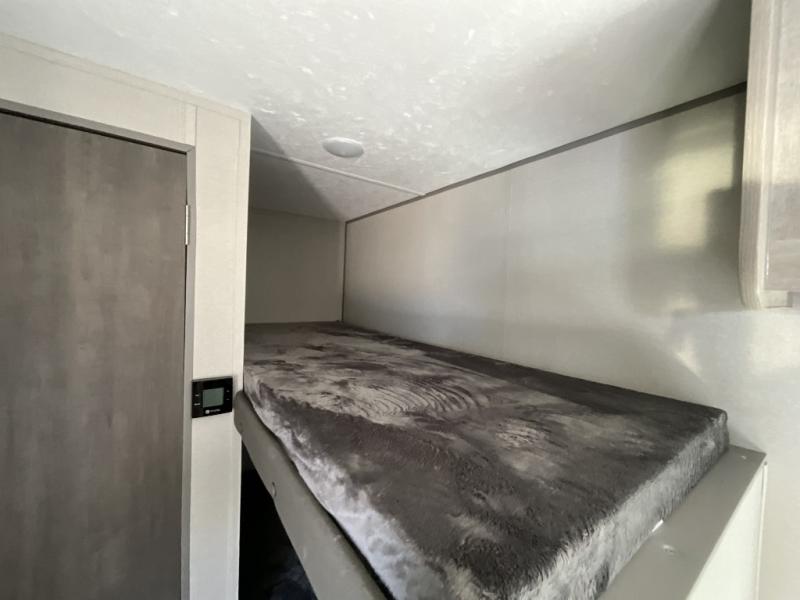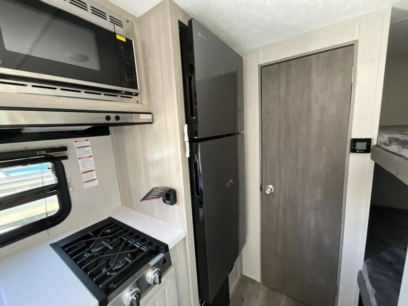 This travel trailers is perfect for a young family or smaller group. You can easily sleep four or more with the rear set of bunk beds and queen bed up front. There is also a 60" sofa for inside down-time, as well as complete kitchen and bath amenities so you can cook and stay clean while traveling. The rear corner bath features a toilet and 36" x 30" shower, and it's conveniently located next to the bunk beds which is great for little ones at night. Cooking inside will be easy with a GE stainless two-burner cooktop and single sink, plus there is also a GE microwave oven for snacks and things that you can easily warm up. If you plan to spend most of your time outdoors, you will find plenty of storage space in the front exterior storage compartment, and there is also plenty of storage inside as well.