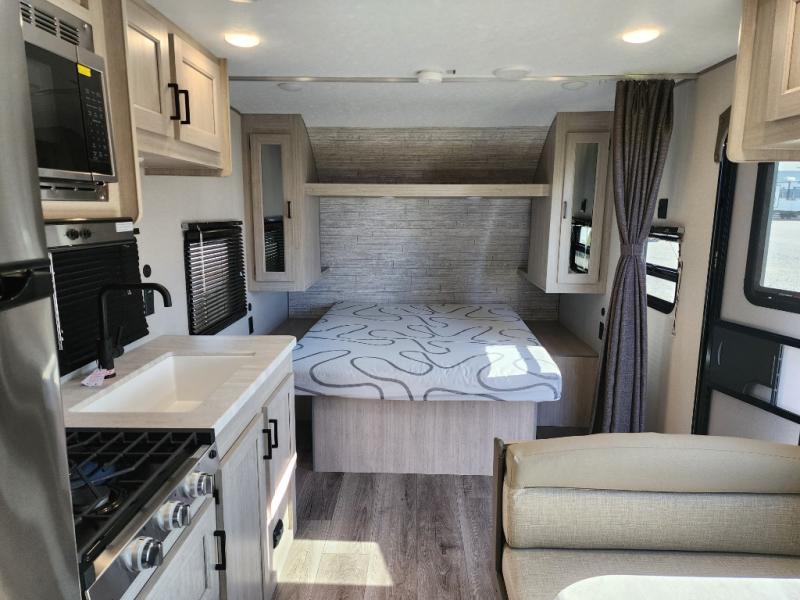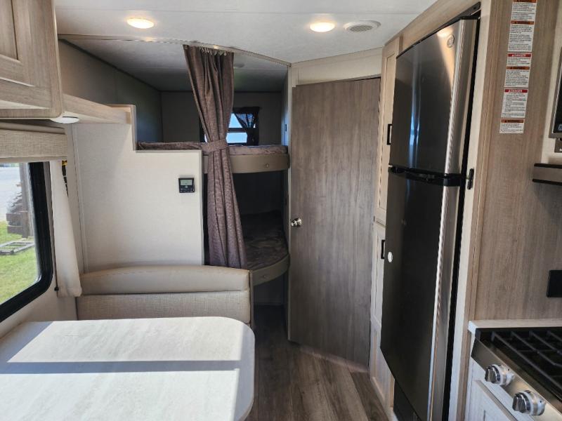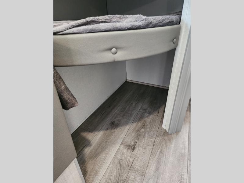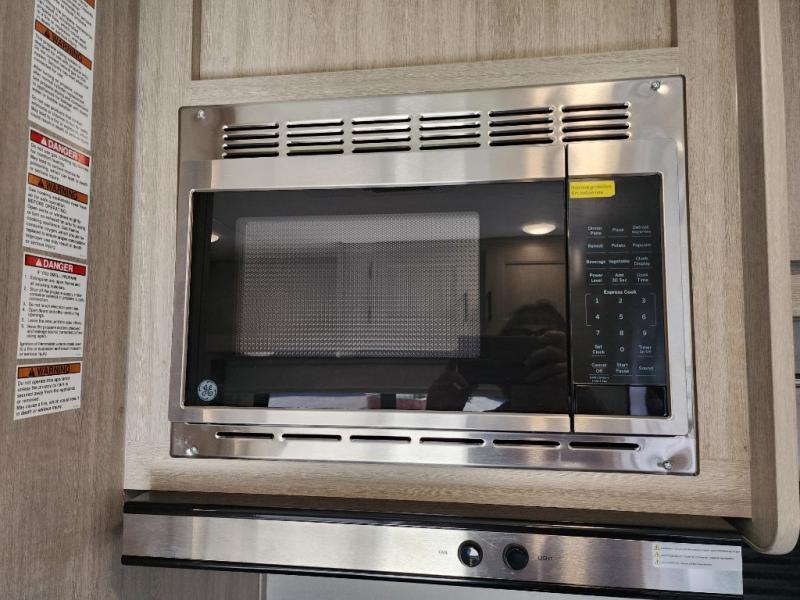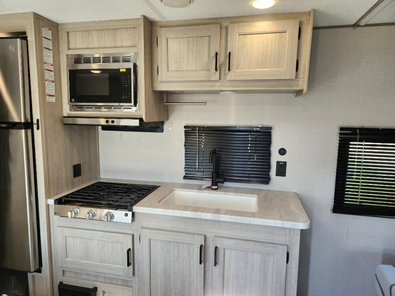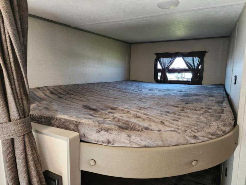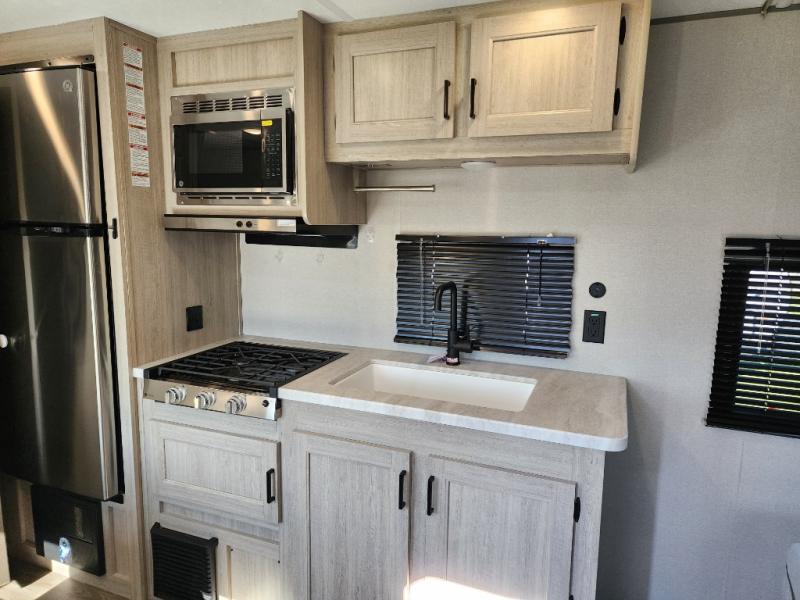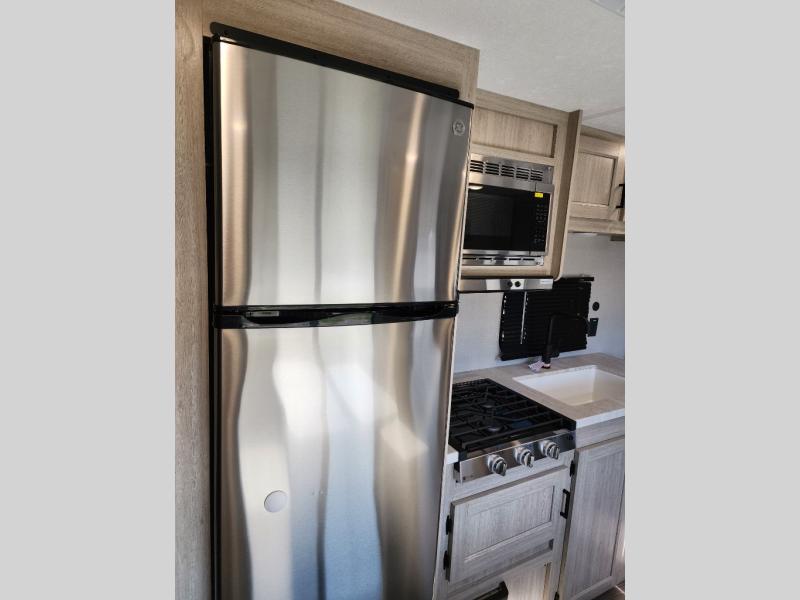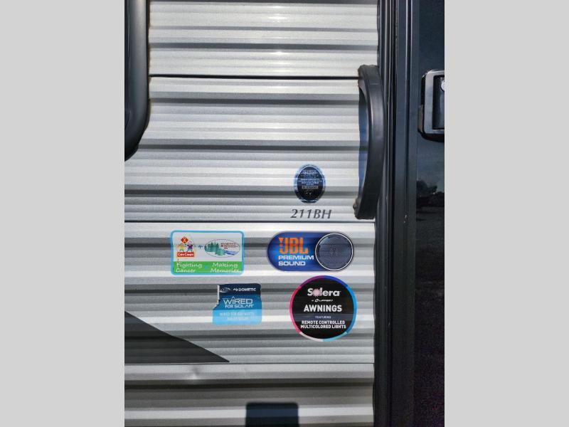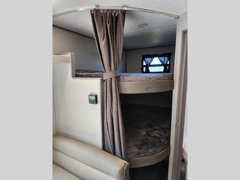 You'll love camping and spending time together in this travel trailer for seven! The bunk beds include under-bunk storage to keep bags out of the way, and the full bath is right next to the bunks for easy nighttime use. A semi-private bedroom up front includes a privacy curtain so you can get dressed each morning, and there are dual wardrobes to keep your things tidy. The chef of your group can whip up breakfast each morning on the three burner cooktop or in the GE stainless microwave, and there is a GE 10.7 cu. ft. 12V refrigerator to keep perishables fresh! A booth dinette provides a place to dine, or you can take your plate outdoors to sit under the 15' power awning with multicolored lights!