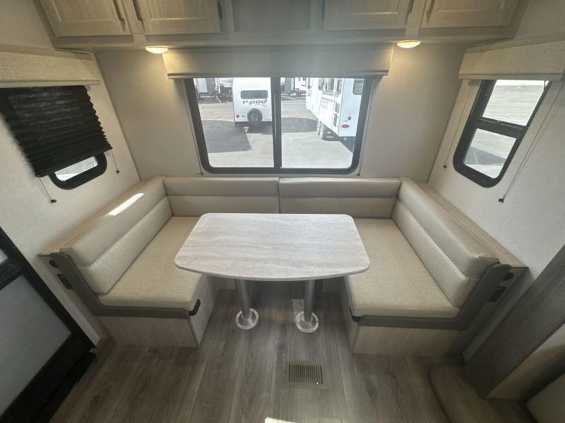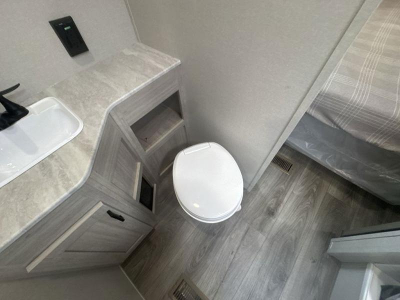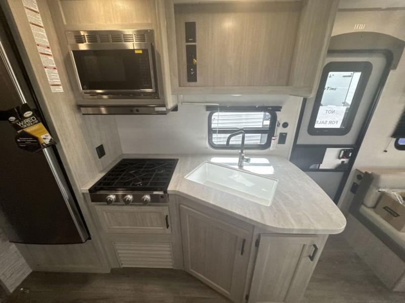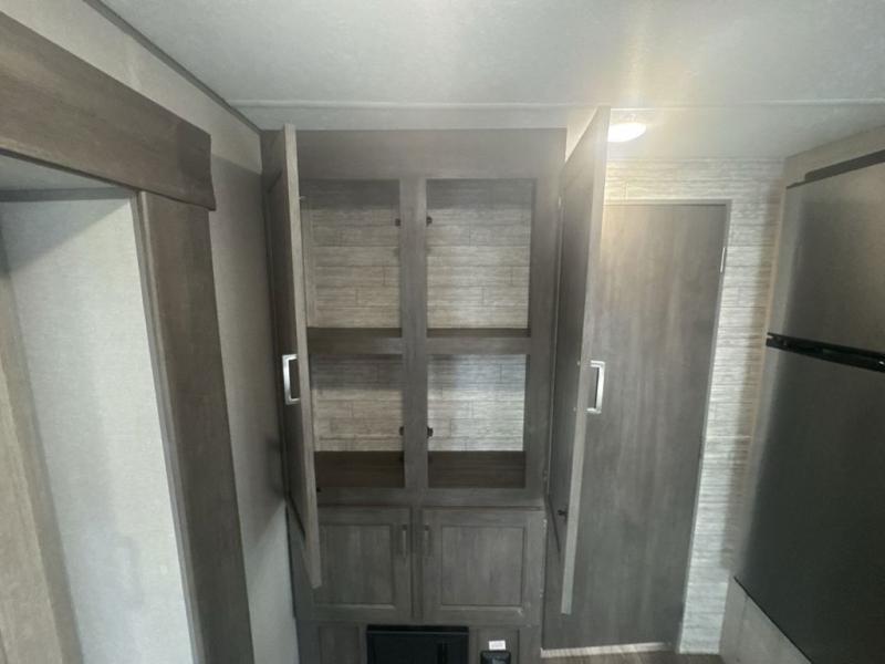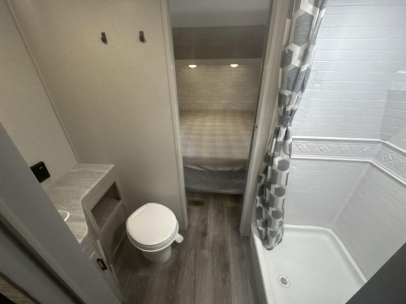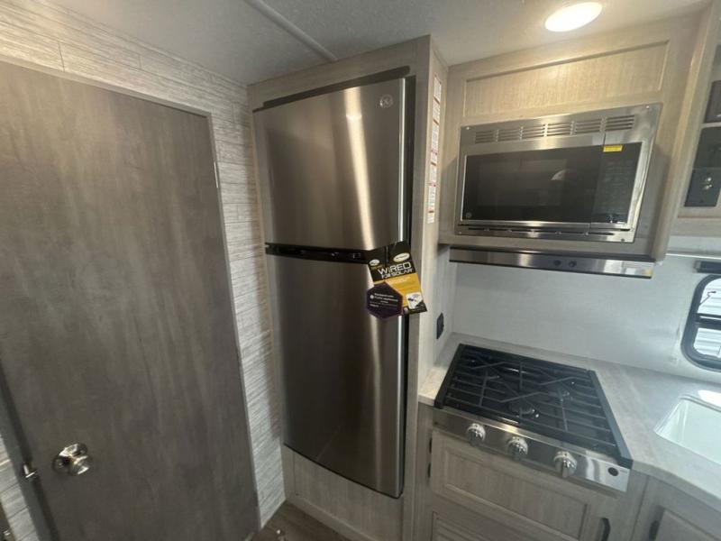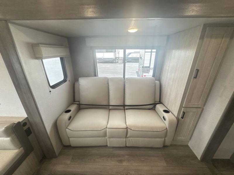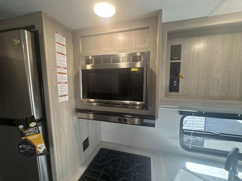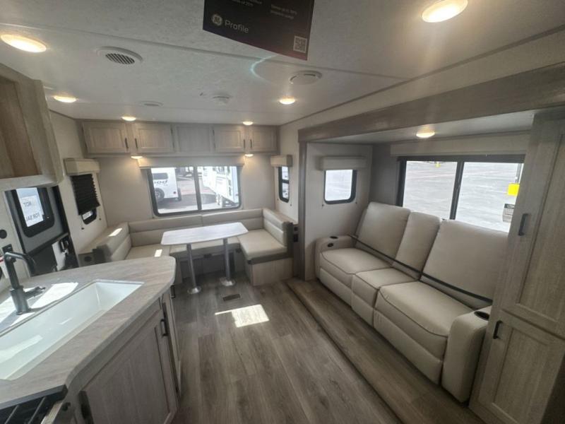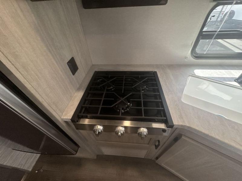 You and your spouse will love the layout of this trailer with a walk-through bathroom which is convenient for you when you are in the front bedroom, and handy for your guests when they stay overnight on the U-shaped dinette. The rear U-shaped dinette includes dual end tables to set your drink on, and the theater seating within the slide out will let you relax each evening. The galley kitchen offers all the appliances needed to make all your meals, such as a GE stainless three burner cooktop, a GE stainless microwave, plus a GE stainless 10.7 cu. ft. 12V refrigerator. You will have your own side of the walk-around queen bed and a wardrobe, as well as USB ports and 110V outlets in the nightstands.