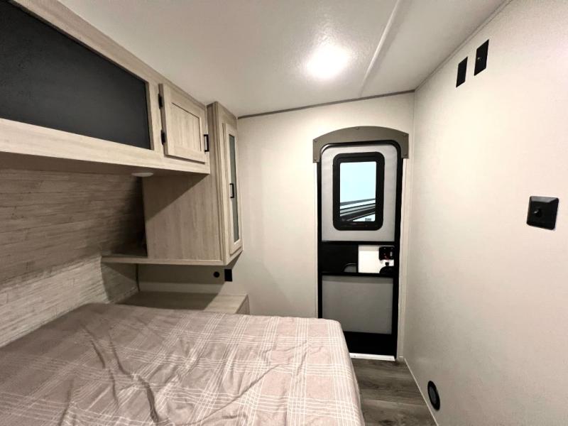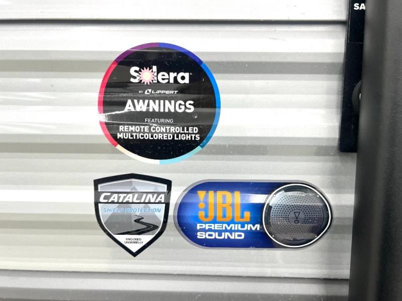 The best looking, most affordable toy hauler is found in the Catalina Trailer Blazer by Coachmen. Each one is constructed with a seamless alpha roof membrane, an enclosed and fully sealed underbelly, and a cambered structural steel I-beam frame for added support. There is a rear loading cargo door with a 3,000 lb. capacity, a black out screen wall with a zip walk-thru and windows, plus 500 lb. tie-downs to secure your toys. You'll love the interior with its Congoleum woodplank linoleum flooring and LED interior lighting. Head outside to find an electric awning with multicolored LED lights and a remote, a 15' Toy Loc cable, a "Leash Link" quick hookup D-ring for pets, and upgraded aluminum wheels. The Catalina Trail Blazer also comes with RV-LINK 4G LTE connectivity with a WiFi booster and extender, a JBL Aura Cube media center, plus premium JBL interior speakers for your pleasure!