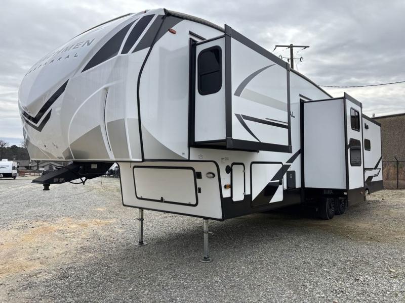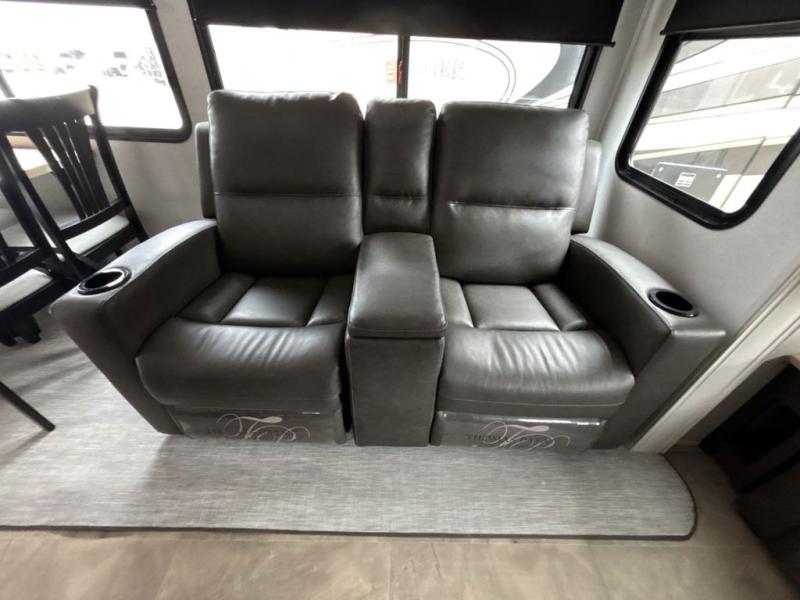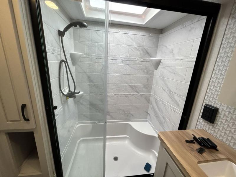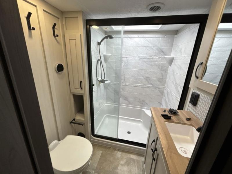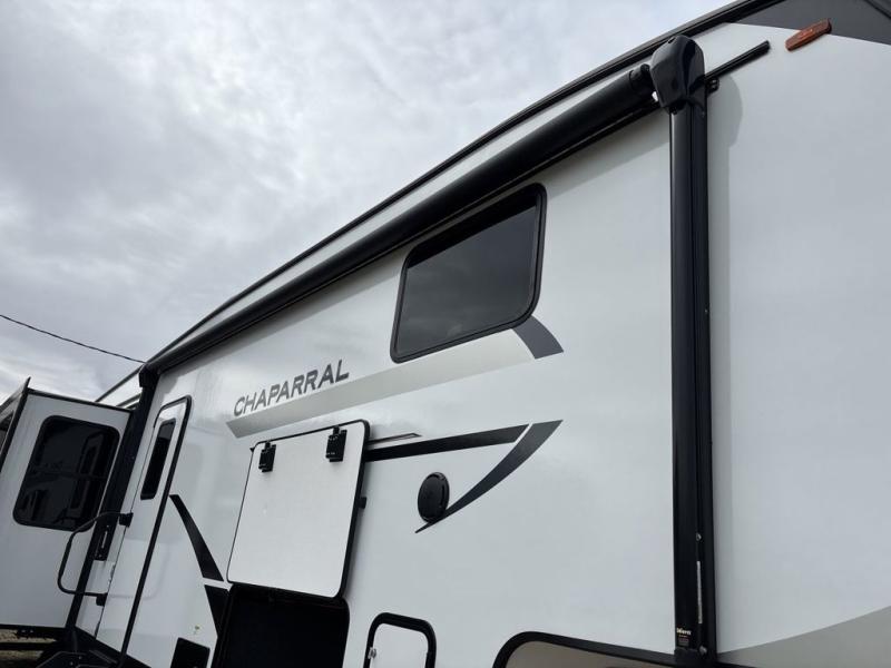 Each Chaparral mid-profile fifth wheel by Coachmen is designed with residential features, loads of storage space, and roomy bedroom suites to make you feel right at home. The durable construction means you can enjoy your RV for years to come. There's 6X double Azdel aluminum cage sidewall system, Weather Shield+ technology, and Tri-Tex powder coated frame technology that will help extend your camping season. Each model includes a Winegard Air 360+ HDTV/radio dome antenna to help keep you connected as you camp, slow rise blackout roller night shades, a new 16 cu. ft. side-by-side stainless glass 12V refrigerator, and a modern electric fireplace to make your space cozy. There is also a large transom window in the kitchen, a modern high-rise faucet, LED motion sensor lights in the bathroom, plus a full-size shower with glass doors and a seat. Now that's what I call luxury! Choose a Chaparral fifth wheel today!