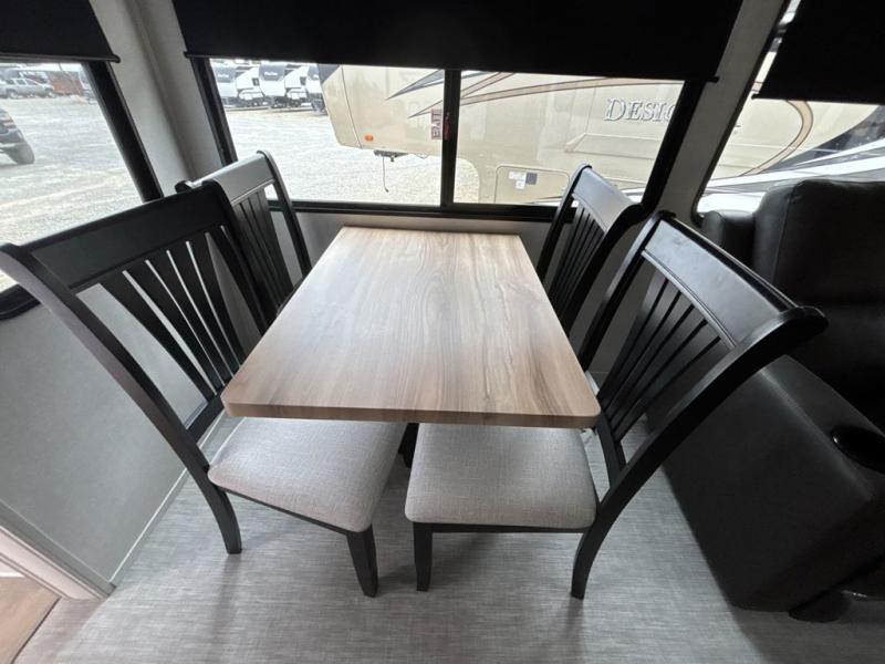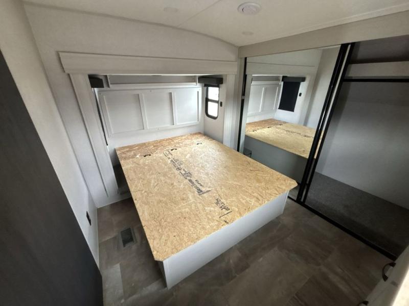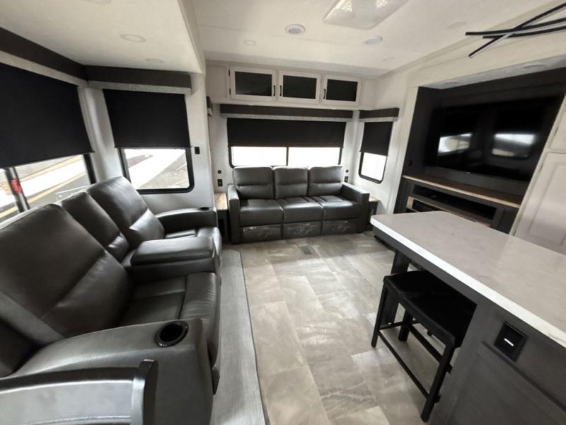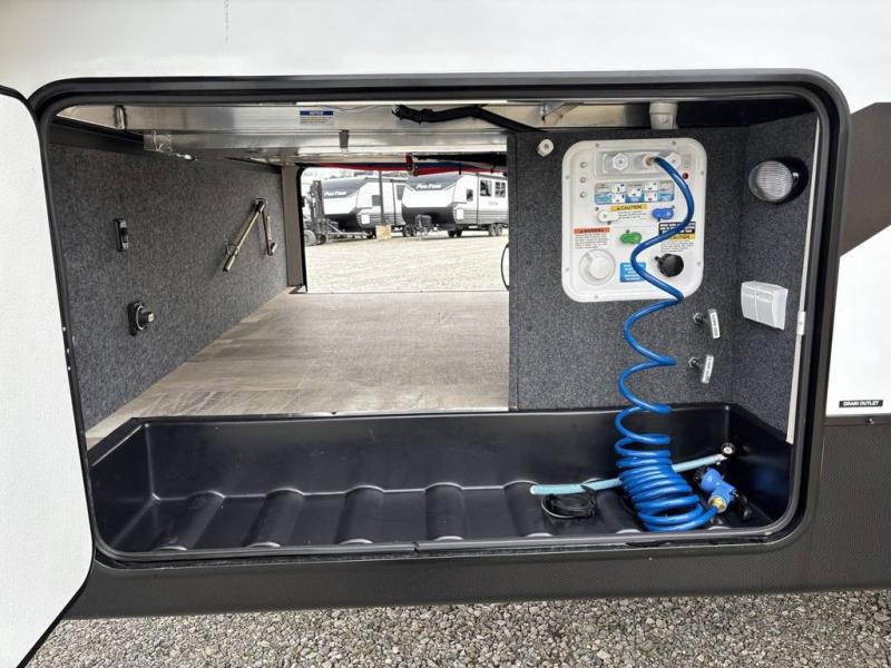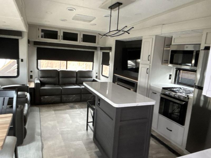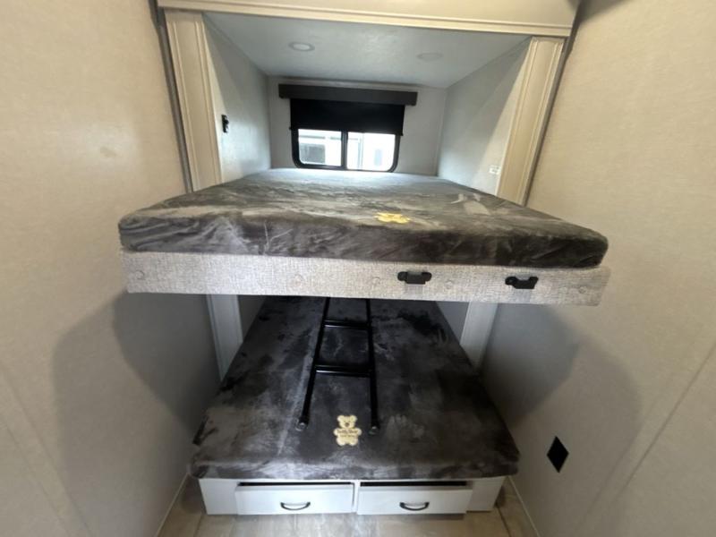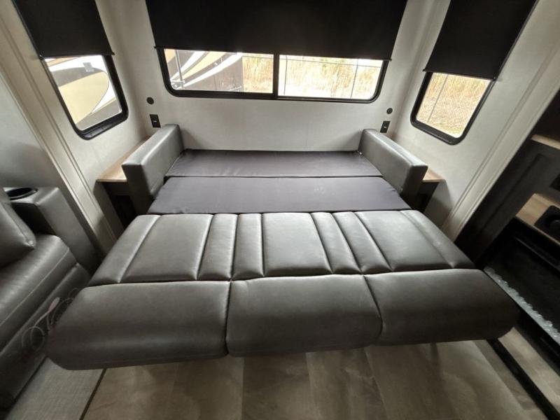 What could be better than a camping trip with family and friends? A camping trip in this spacious fifth wheel that can sleep eight people comfortably! There is a private middle bunkhouse with double-size bunks and overhead cabinets to store belongings, and a front private bedroom with a queen bed slide out. You'll find storage space in the large bedroom wardrobe that also includes washer and dryer prep if you plan to go full-time or camp for longer periods of time. Everyone can meet in the main living area that includes dual opposing slides, theatre seating, a free-spanning table, plus a tri-fold hide-a-bed sofa! And we didn't even mention the fully-equipped kitchen with stainless steel appliances, an extra deep single basin sink, plus tons of counter space with overhead cabinets for more storage!