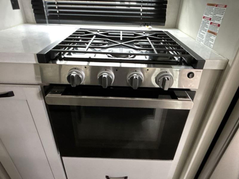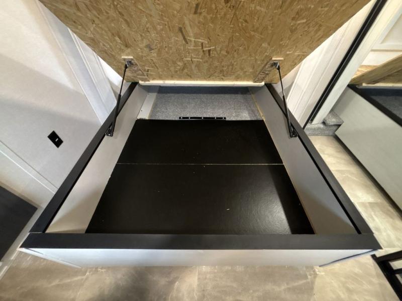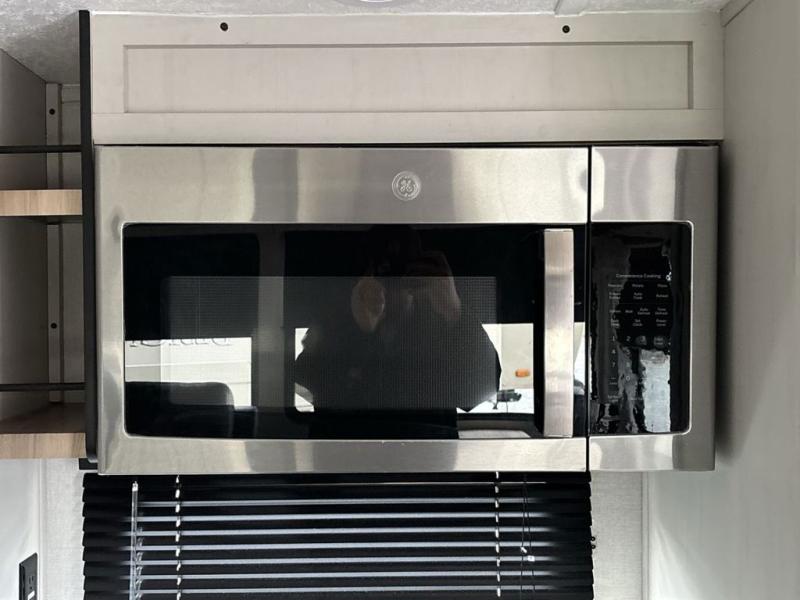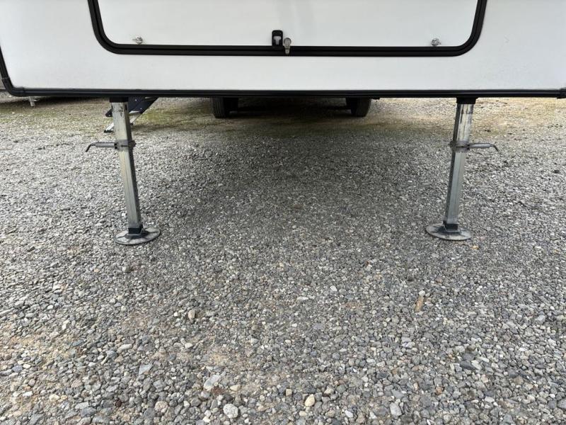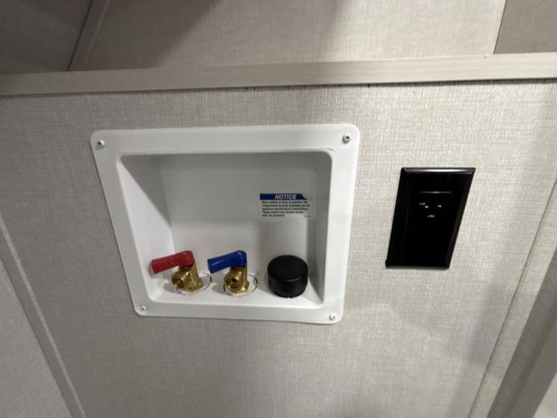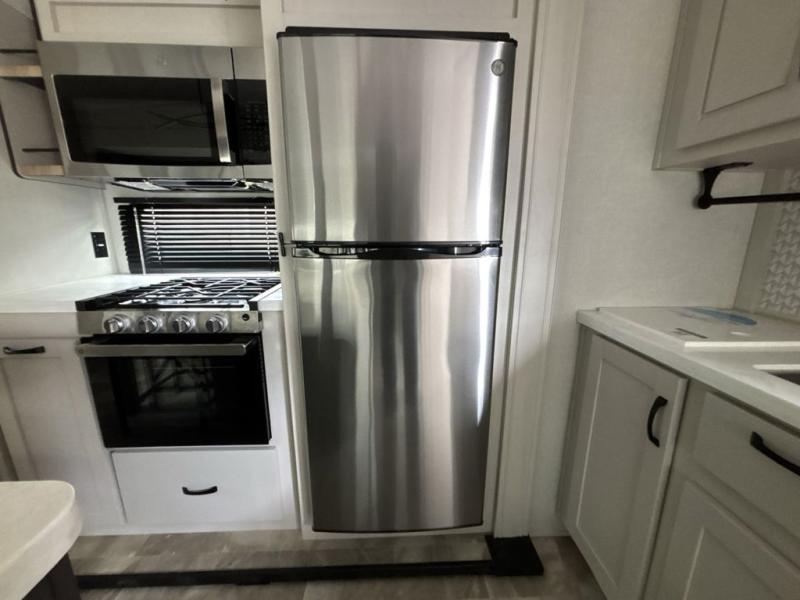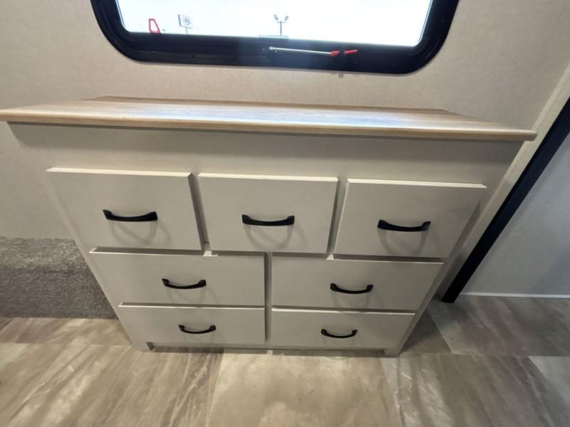 What could be better than a camping trip with family and friends? A camping trip in this spacious fifth wheel that can sleep eight people comfortably! There is a private middle bunkhouse with double-size bunks and overhead cabinets to store belongings, and a front private bedroom with a queen bed slide out. You'll find storage space in the large bedroom wardrobe that also includes washer and dryer prep if you plan to go full-time or camp for longer periods of time. Everyone can meet in the main living area that includes dual opposing slides, theatre seating, a free-spanning table, plus a tri-fold hide-a-bed sofa! And we didn't even mention the fully-equipped kitchen with stainless steel appliances, an extra deep single basin sink, plus tons of counter space with overhead cabinets for more storage!