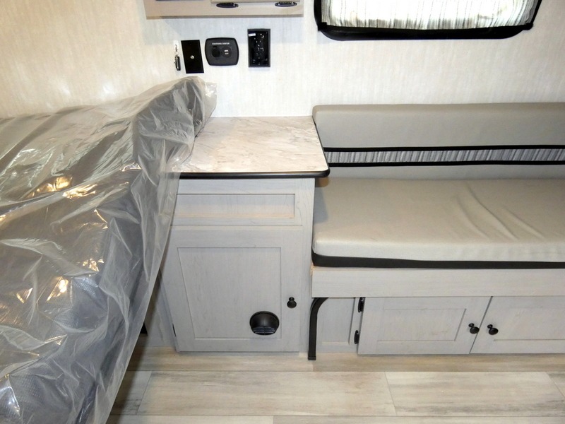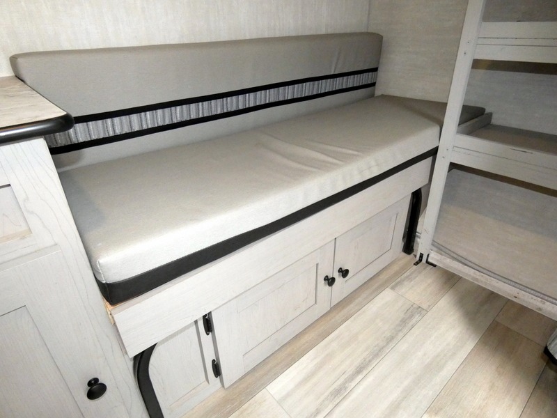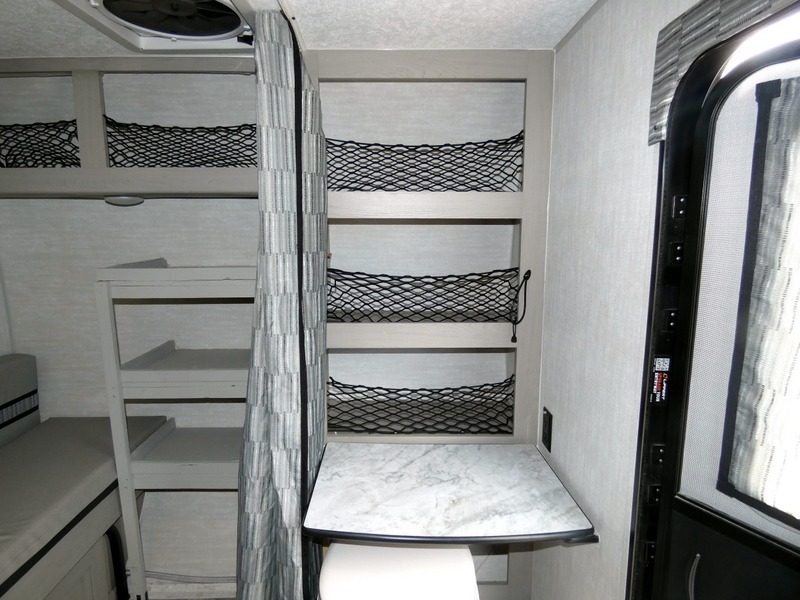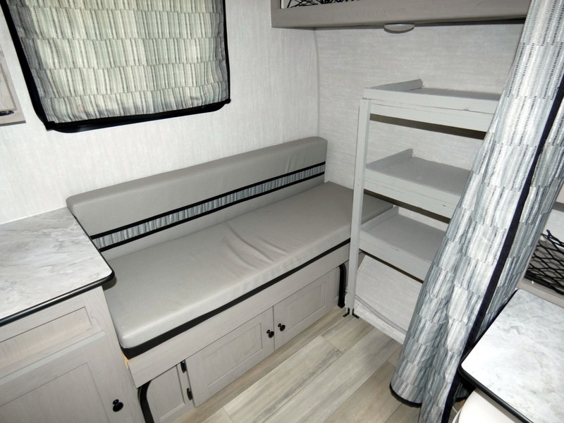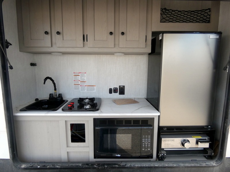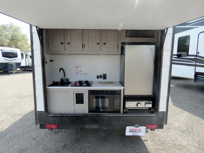 When you want to explore choose this travel trailer for your basic off-road adventure needs and a bit more by offering you a 54" X 74" flip-up bed with storage beneath, and gaucho seating that pulls out into a bed for an additional camper at night. There is front and rear overhead cabinetry for storage, and a cassette toilet for added convenience especially at night. A rear hatch camp kitchen provides a place for you to create meals and snacks while you explore. There is a slide-out griddle and grill combo cooktop, a 3.3 cu. ft. 12-volt refrigerator for your cold items, a single sink, and two burner cooktop, plus a microwave oven. A 9' power awning creates a bit of added outdoor living space where you can set up your camp chairs.