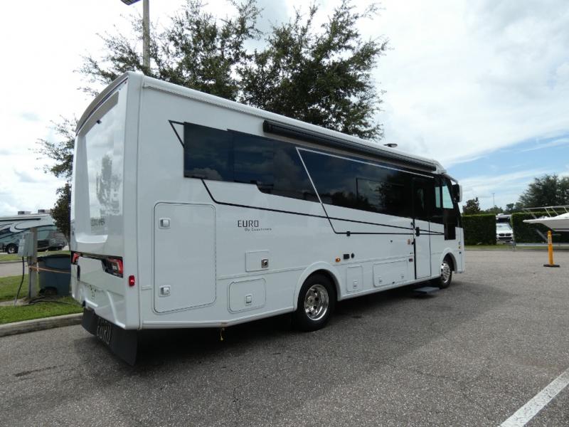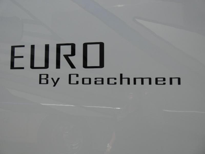 Enjoy the compact and stylish look of a European coach with the Euro Class A gas motorhome by Coachmen RV! There is a crowned, laminated fiberglass roof, a fiberglass front cap, plus a Ford F53 7.3L V8 chassis that will add to the life of your RV. The driver will love having a back up monitor with side view cameras, and the passenger can use the computer workstation to work remotely if needed. There is also traction control, cruise control, plus a tilt and telescoping steering wheel that will make the drive that much easier. An exterior propane hook-up also comes standard, along with radius trunk doors for your gear, and automatic leveling jacks to be set up in no-time. Head inside to find modern features, like the stainless steel appliances, square windows with day/night shades, and the list goes on!