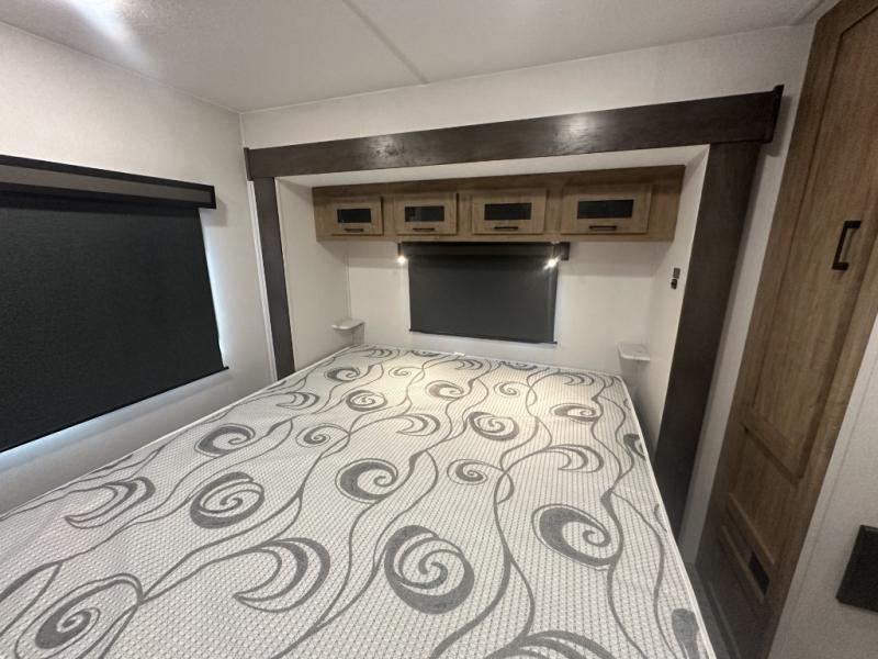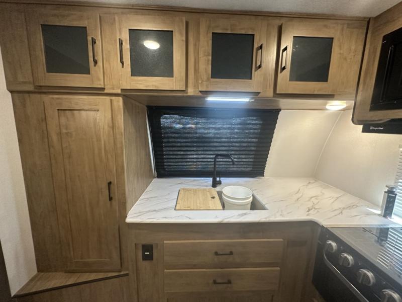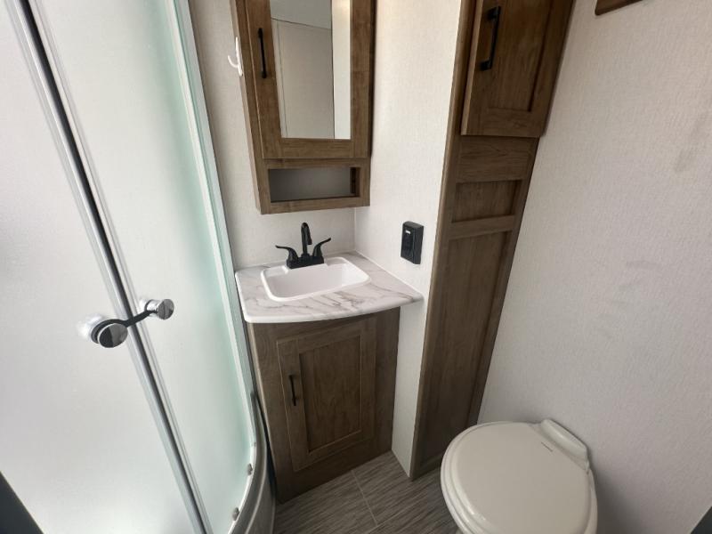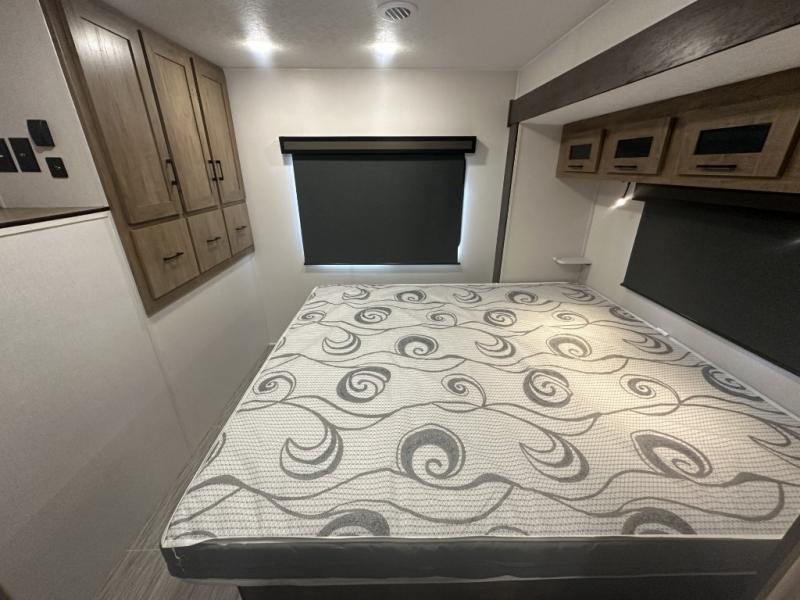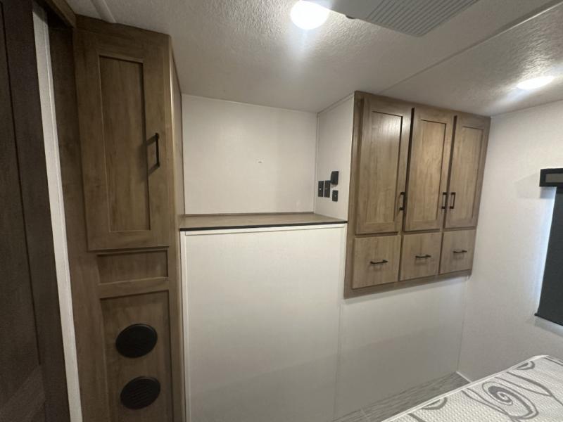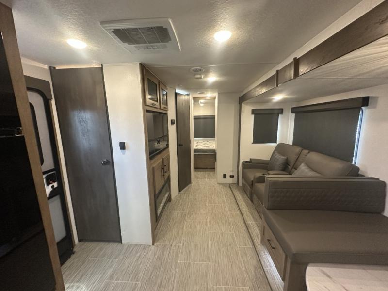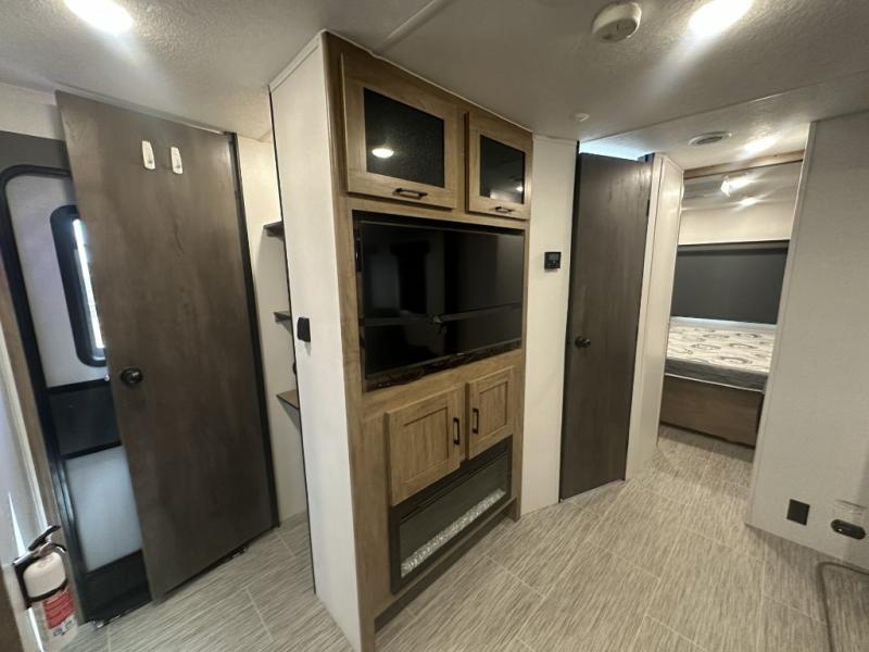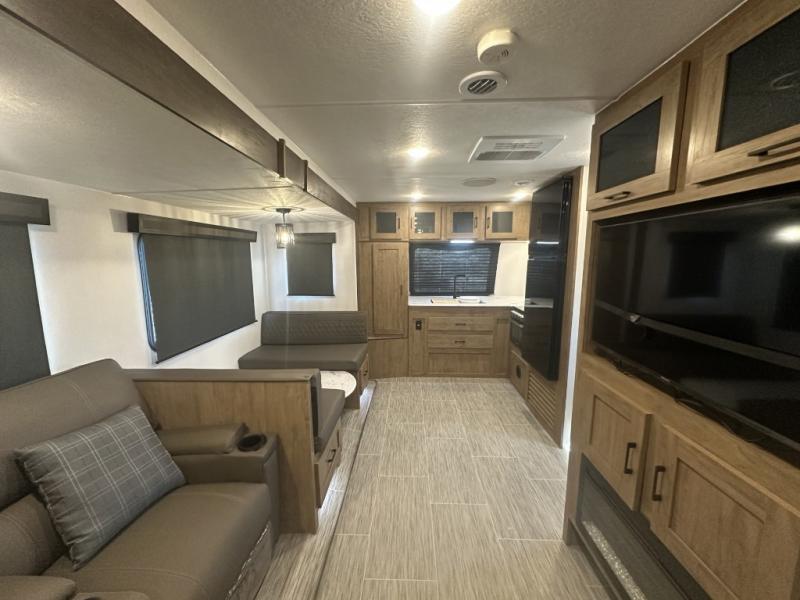 Comfort comes easy in this front kitchen travel trailer for four! You will love the rear master bedroom with its king bed slide out, spacious wardrobe, and a private entrance into the dual entry bath. There is a sofa that sits directly across from the fireplace and entertainment center, or you can choose the optional theater seat or optional hide-a-bed sofa in place of the standard sofa. The front kitchen features tons of counter space, an 8 cu. ft. double door refrigerator, plus a large pantry for dry good and snacks. There is also a pantry/closet just as you enter the trailer that will be perfect for shoes and jackets!