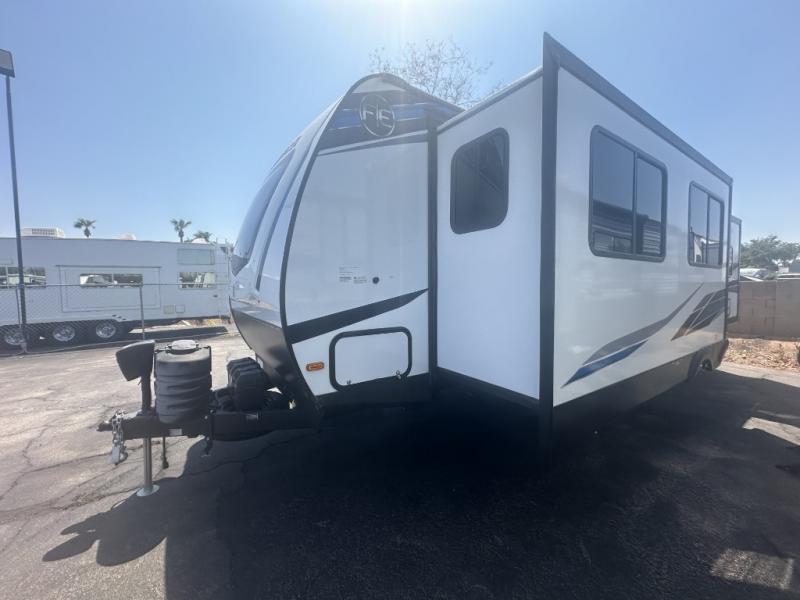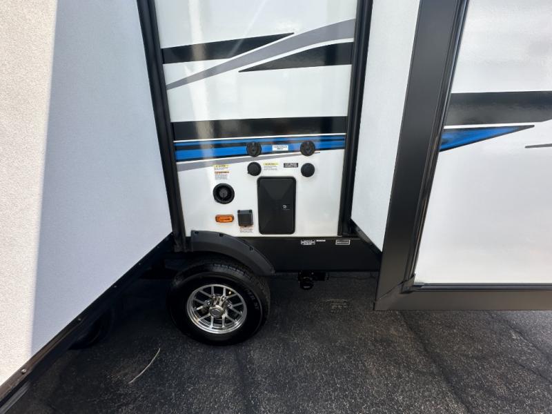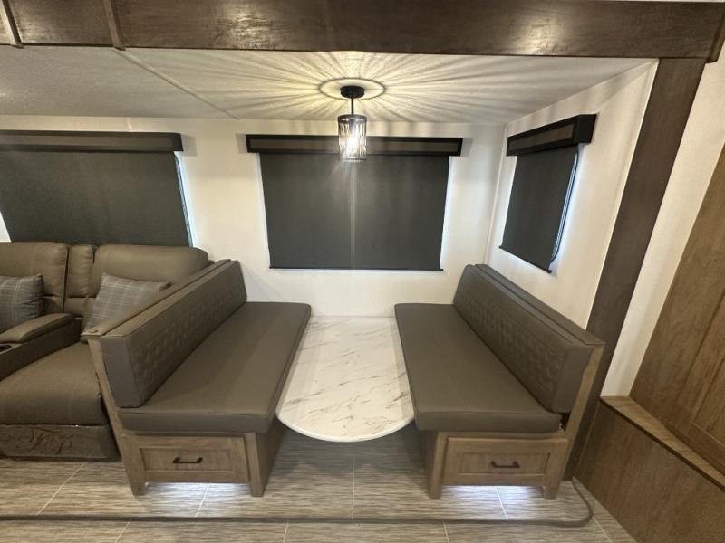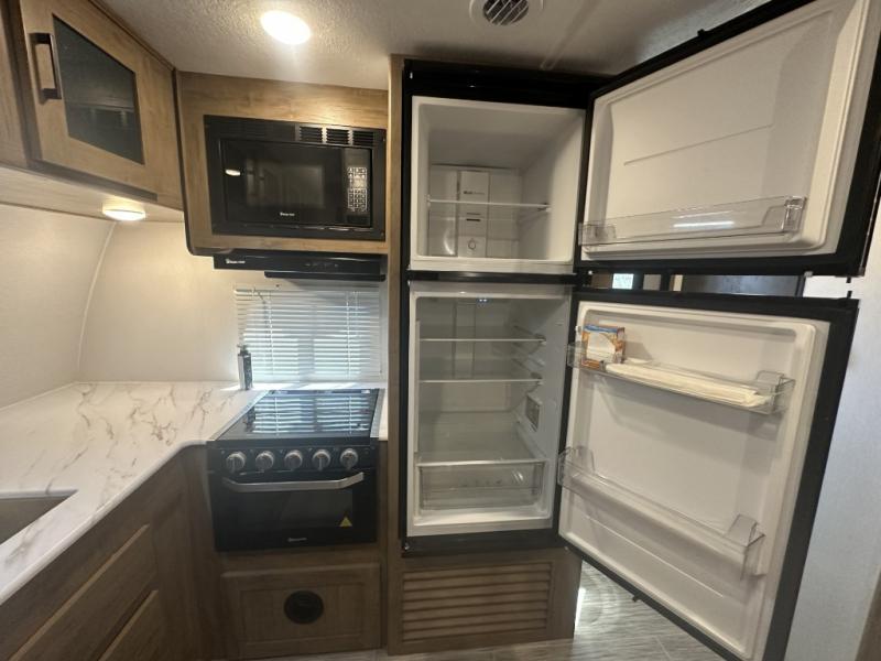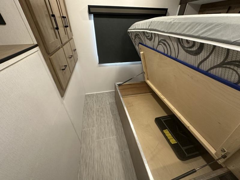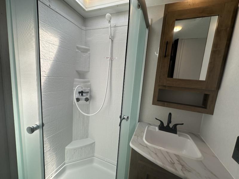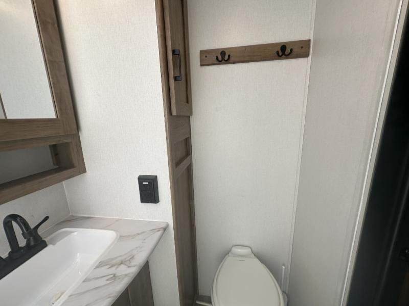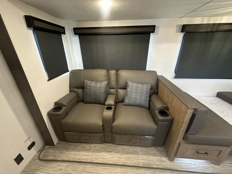 Comfort comes easy in this front kitchen travel trailer for four! You will love the rear master bedroom with its king bed slide out, spacious wardrobe, and a private entrance into the dual entry bath. There is a sofa that sits directly across from the fireplace and entertainment center, or you can choose the optional theater seat or optional hide-a-bed sofa in place of the standard sofa. The front kitchen features tons of counter space, an 8 cu. ft. double door refrigerator, plus a large pantry for dry good and snacks. There is also a pantry/closet just as you enter the trailer that will be perfect for shoes and jackets!