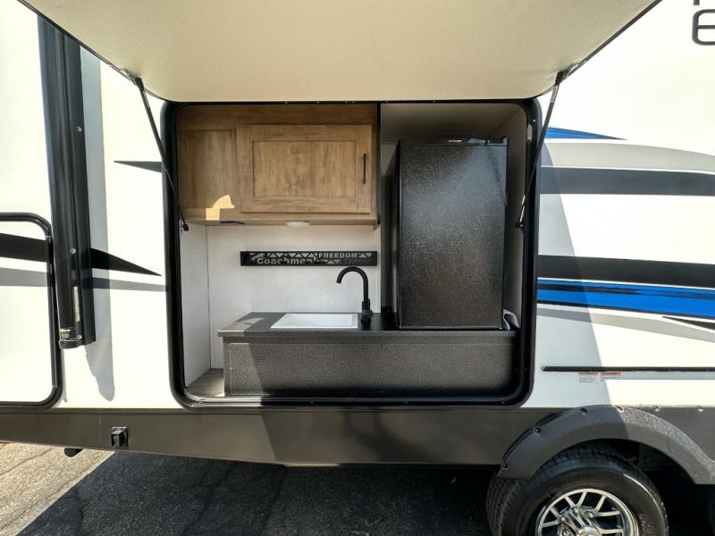 With any Freedom Express Ultra Lite travel trailer by Coachmen you will appreciate quality construction materials, such as vacuum bonded walls with Azdel composite, a 3/4 gel coated fiberglass cap with an automotive glass windshield, and a heated enclosed underbelly. Each model also features Tufflex PVC roofing, front rock guard, and E-Z Lube axles for smooth towing. Inside, you'll find kitchen backsplash, hidden hinge cabinetry, and wear-resistant vinyl flooring throughout. The power tongue jack included with the Ultra Lite Express Package will make set-up a breeze, and each model includes back-up camera prep and they are Freedom solar ready if you plan to go off-grid. Enjoy lightweight camping with a Freedom Express Ultra Lite travel trailer today!