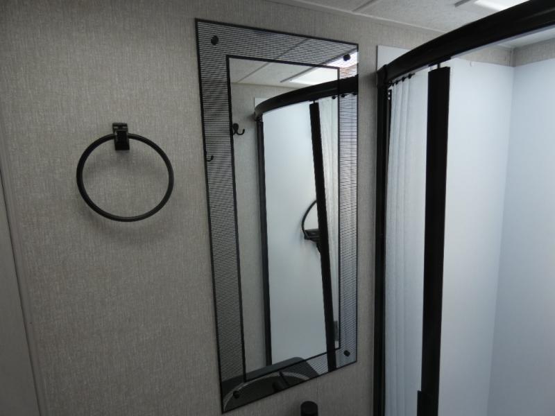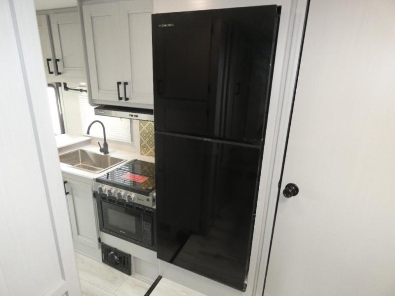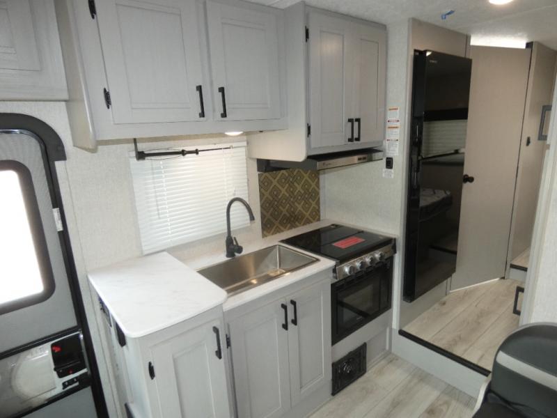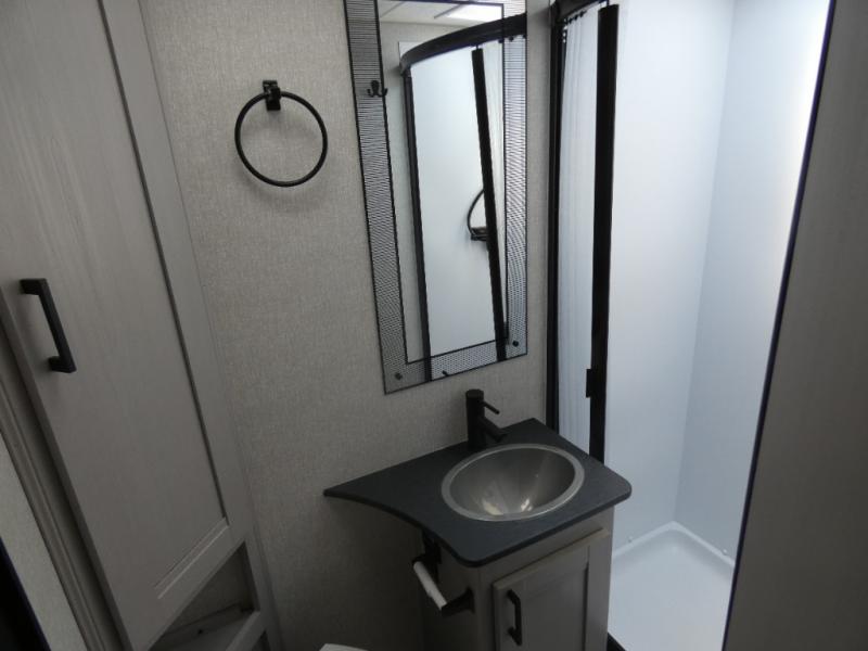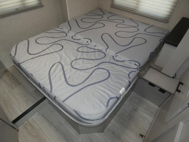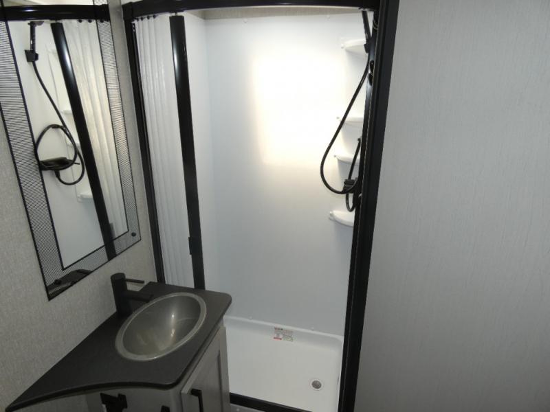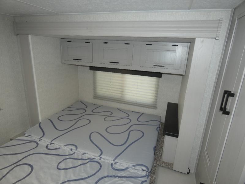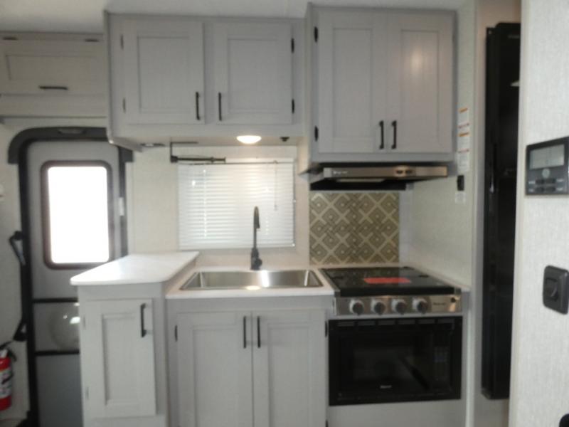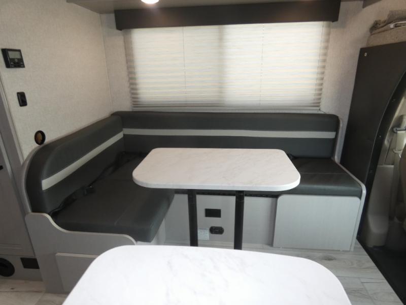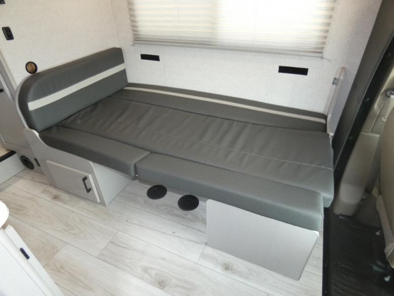 You will be met with comfort at every turn in this coach for six! Once you have stopped for the day, you can make lunch on the three burner cooktop and grab a cold drink from the 10 cu. ft. 12V refrigerator. There is a J-lounge with a pedestal table and extension where you can dine together, and the swing-arm TV in the cab will let you check the weather before heading outdoors. The rear corner full bath will let everyone freshen up when you return from hiking, and you'll enjoy a queen bed slide out to sleep on each night, while your guest take the J-lounge and cab-over bunk!
