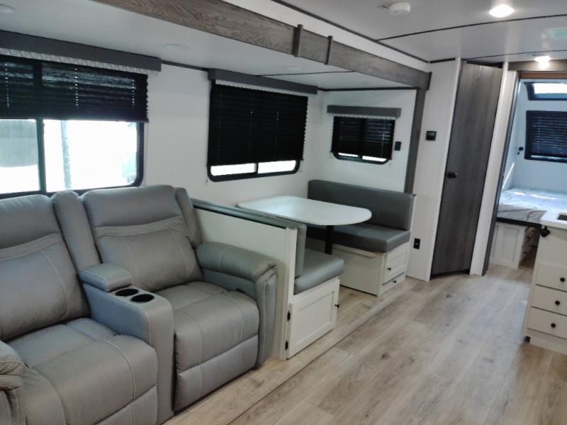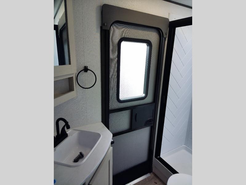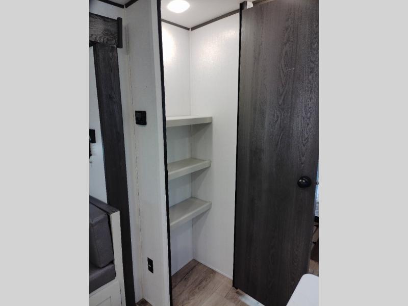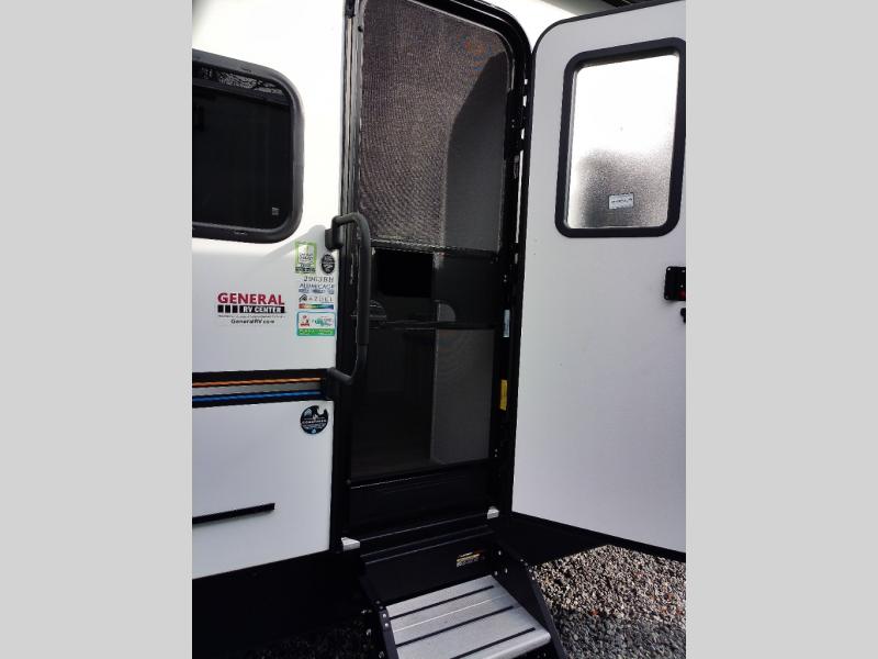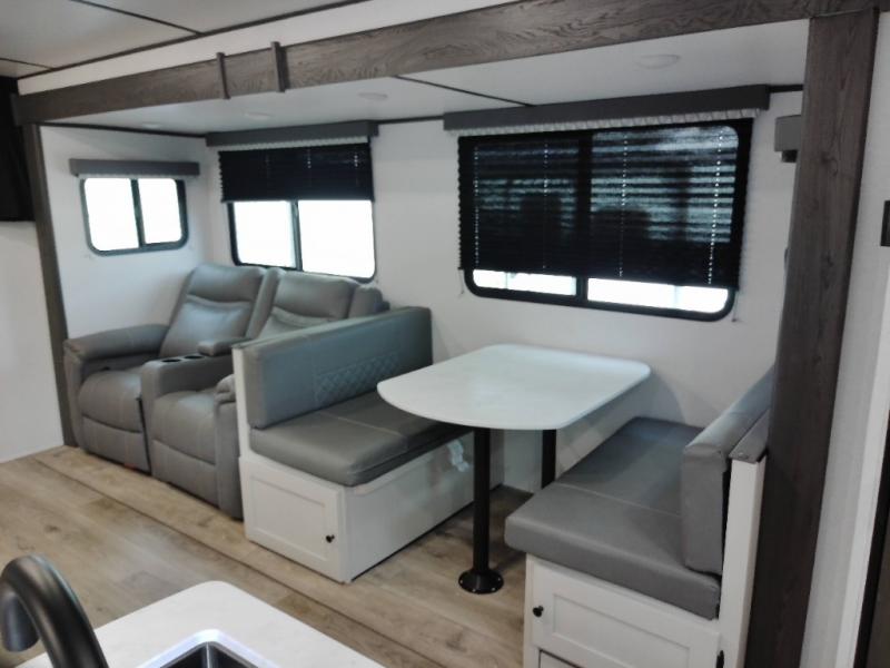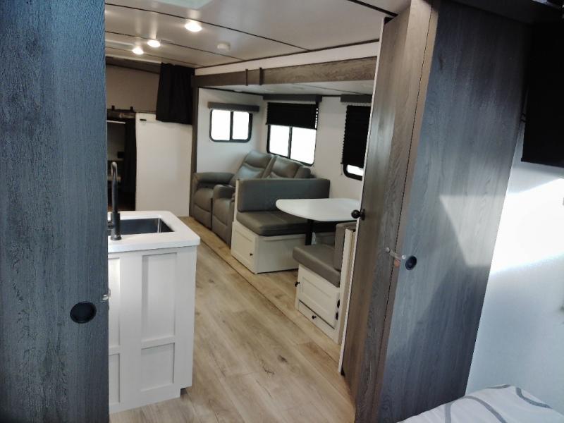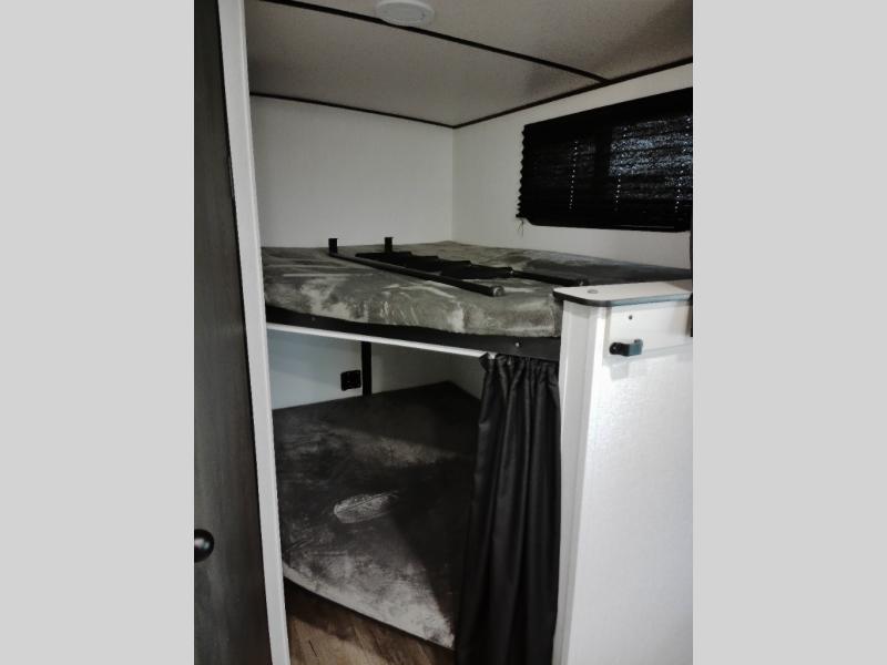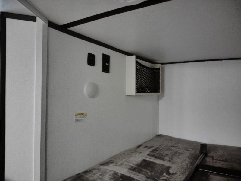 This is a popular bunk trailer for a larger family thanks to having the convenience of dual entry doors allowing access to the main living and kitchen area and near the front bedroom, and into the full bathroom for a quick in and out when playing outside. The bathroom also includes a hamper for convenience. The Stor-More cargo door allows you to place items from the exterior to the interior under the lower flip bunk for safe travels to your destinations and back home. The kids will surely love the convenience centers when playing or sleeping in a bunk. There is a sofa and booth dinette slide including a pet center for relaxing and feeding your pet. The kitchen includes full amenities plus a pantry to store lots of goodies for everyone. Along the exterior, the outside camp kitchen will come in handy when you have everyone at the campsite for dinner and the 18' awning offers some protection from the elements.