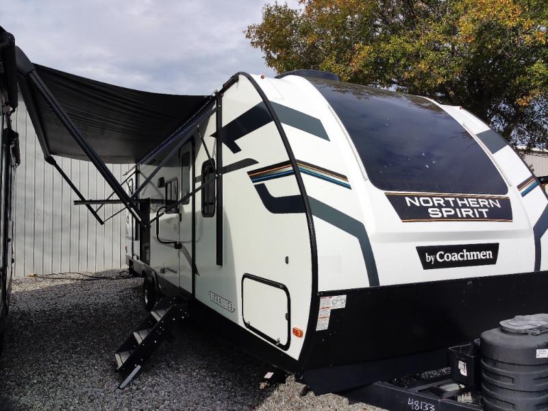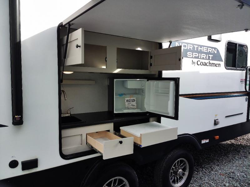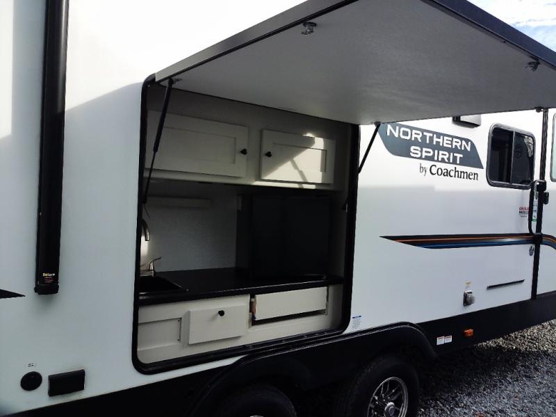 With any Northern Spirit Ultra Lite travel trailer by Coachmen, the "Twice Cool" dual ducted air conditioning system, motion activated floor lights, and the motion activated pass-through storage light plus fishing pole storage, will make your camping experience simplified. The heated and enclosed underbelly provides protection on the road, the 200W solar panel with 30 amp controller provides off-grid camping, and the power tongue jack makes setup easier. Each is built with a front cap with LED strip lights, a laminated, aluminum framed floor, rear wall, and sidewalls, plus a fully walkable roof with seamless Tufflex PVC covering. Make your decision today, and camp with everything in its place!