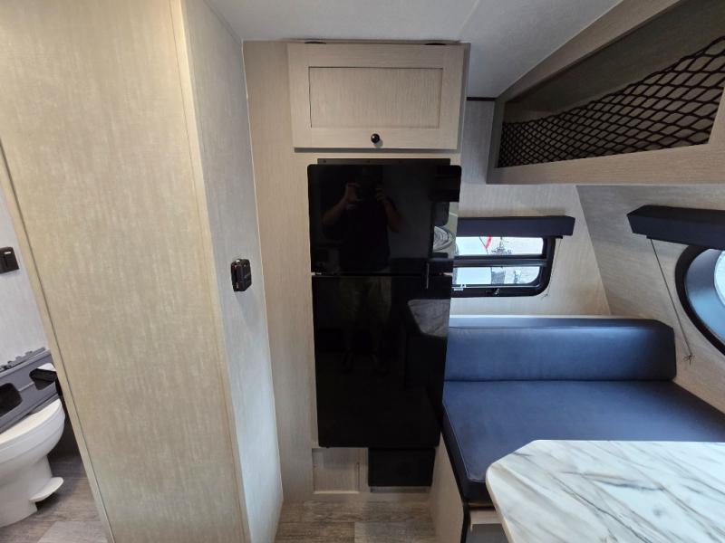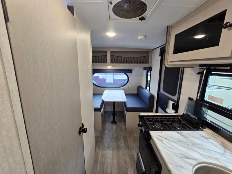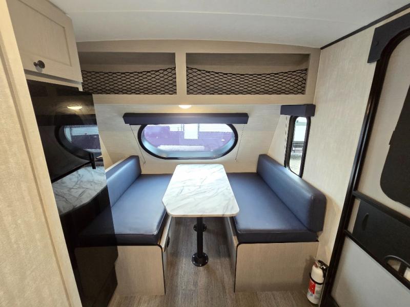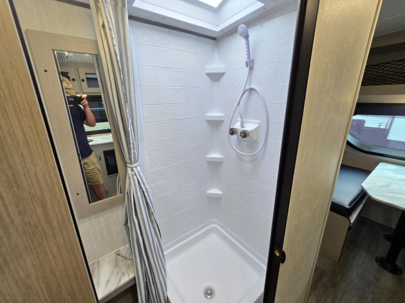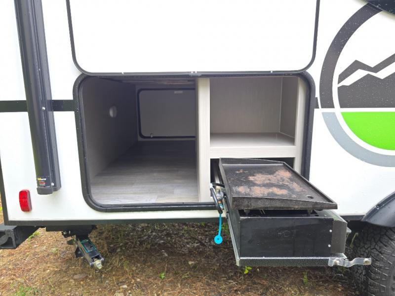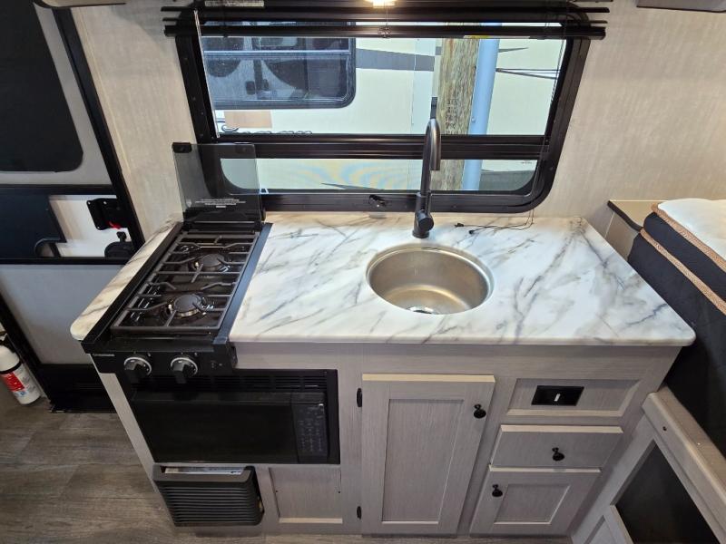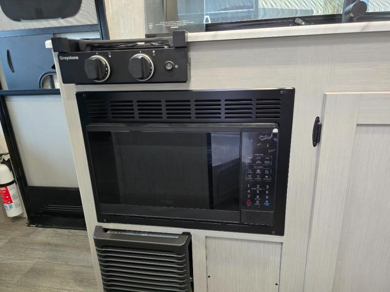 Three can camp comfortably in this Remote travel trailer with plenty of outdoor storage! There is a 54" x 80" bed inside for sleeping with overhead storage and more below. A full bath with angled shower will keep everyone feeling refreshed, and the skylight not only lets in more natural lighting, but more head room as well. Cook inside or out with the two burner cooktop and microwave, or outside on the cast iron griddle. Dine at the booth dinette inside which can also be transformed into sleeping for one more.