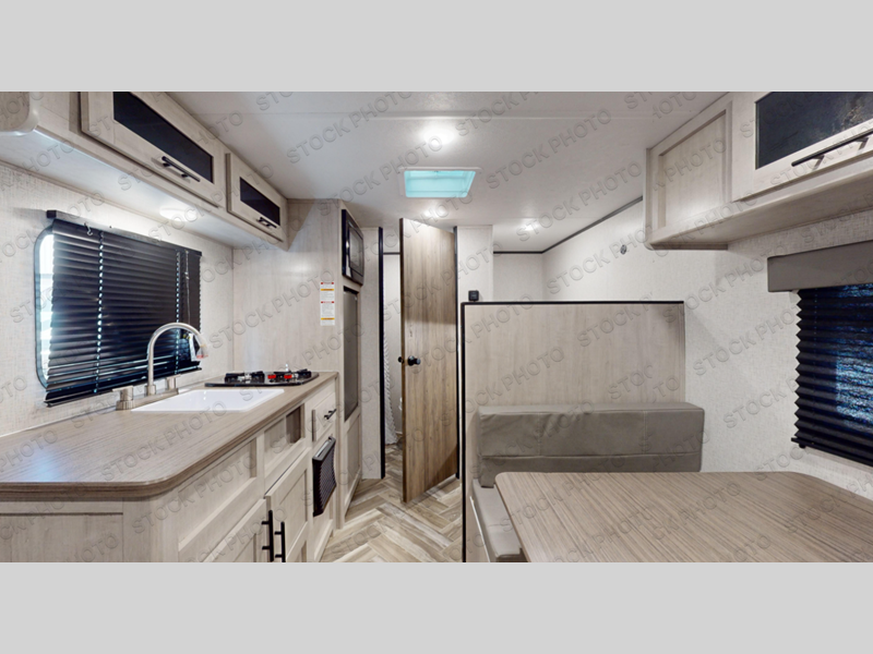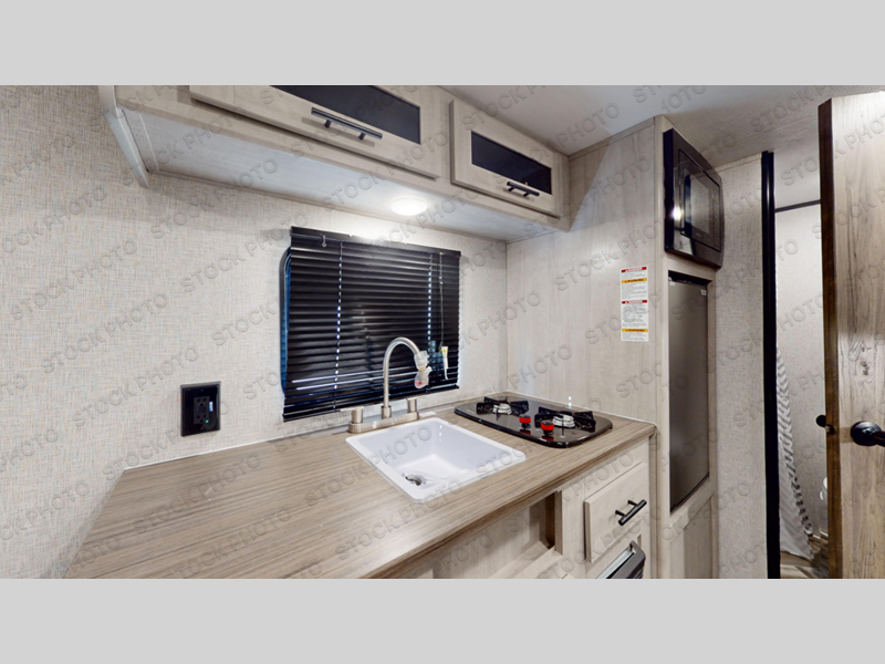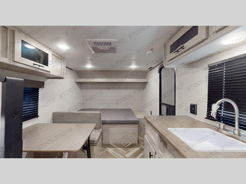 This Zinger Lite travel trailer is perfect for your next family vacation or weekend at the lake with friends. With room for five, this unit gives you the space you need to pack up the kids and the dog and get ready to hit the road! With an RV queen bed and bunk beds, everyone will have a place to sleep. The 38" booth dinette can comfortably hold one to two little ones or an adult guest. Use the two burner range to make a home-cooked meal and easily store your leftovers in the 12V refrigerator. Enjoy extra privacy with a rear corner bath that includes a 30" x 36" shower. This unit features multiple overhead compartments, so bring along the board games and other valuables from home.