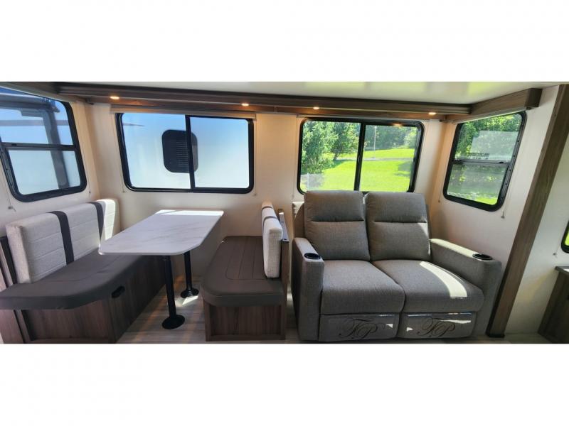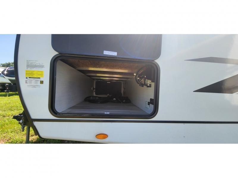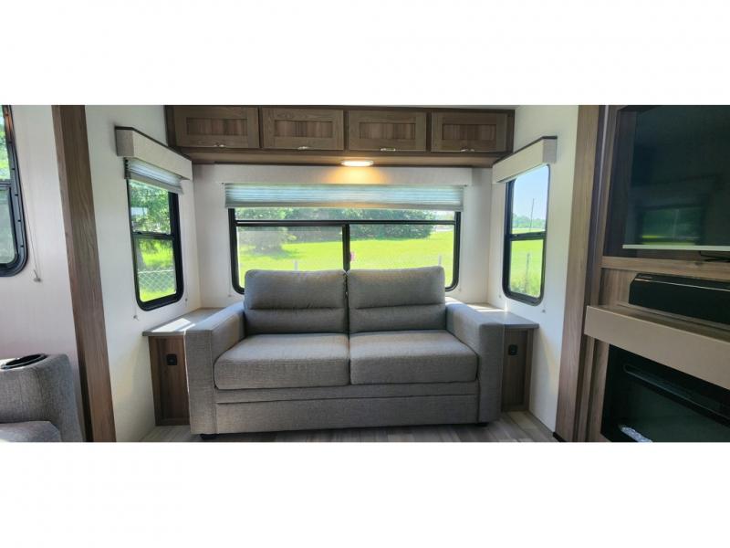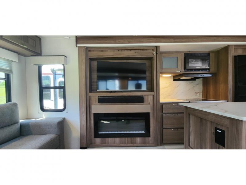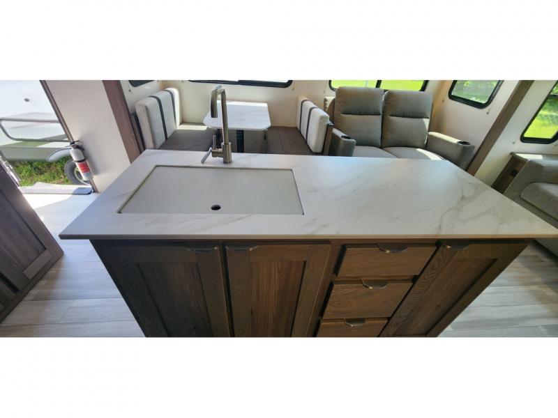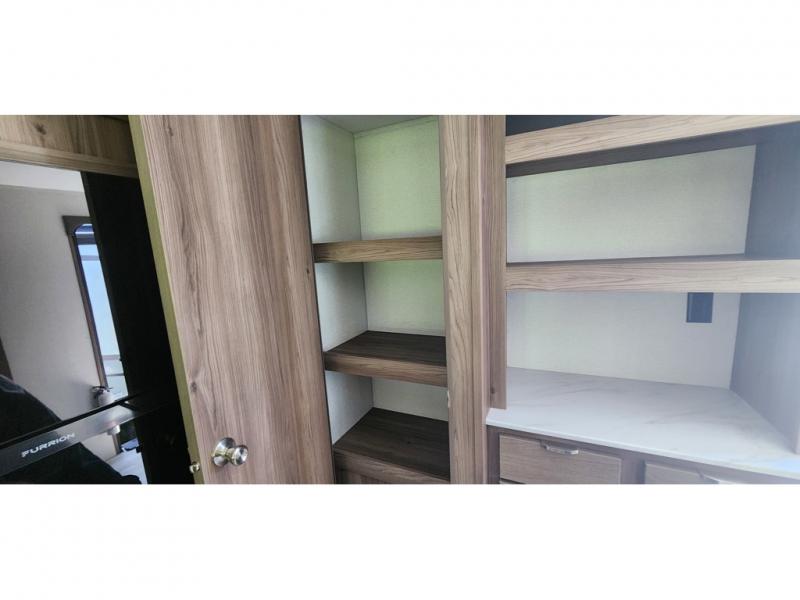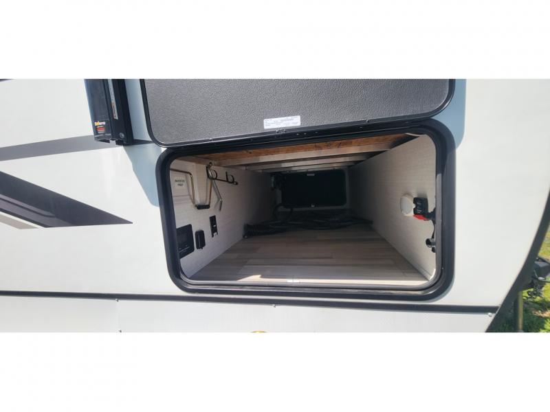 You'll love every minute spent in this spacious travel trailer that can sleep four to five each night. The rear living area will be a favorite place to visit together since there are dual opposing slides, a rear sofa, a booth dinette, plus a 60" theatre seat across from the entertainment center with a hidden pantry behind it. A kitchen island with storage in the middle will provide more counter space, and the wine rack will let you entertain guests. After you've spent your day outdoors, the full bath with a spacious shower, plenty of counter space, and a linen closet will let you freshen up before turning in for the night. Speaking of nighttime, the front private bedroom will provide a great night's rest on the king-size sliding bed, and there is storage space in the dual wardrobes plus the dresser/wardrobe!