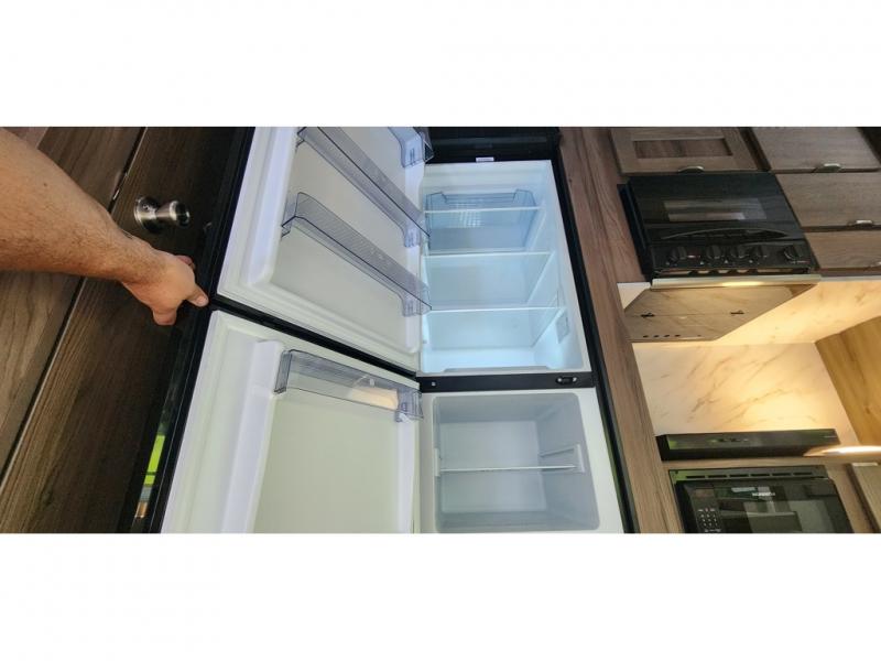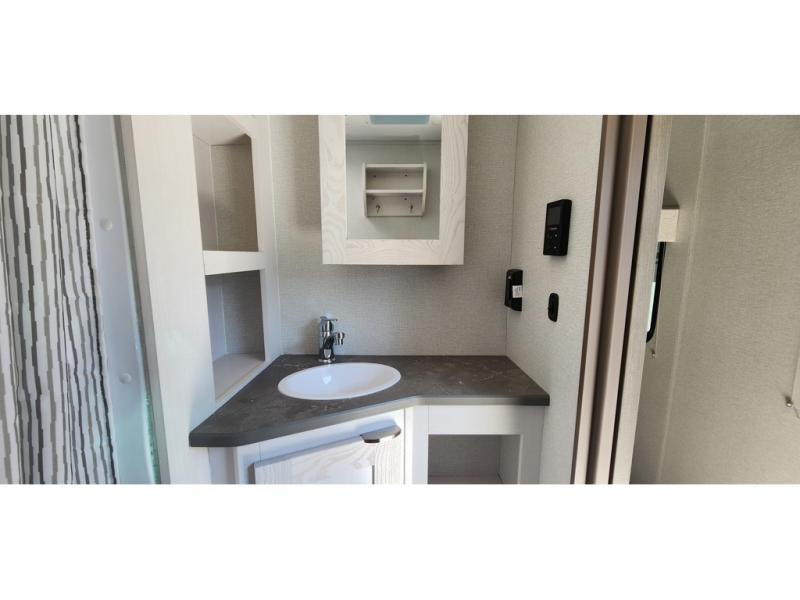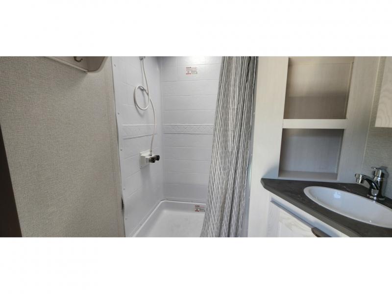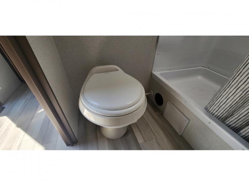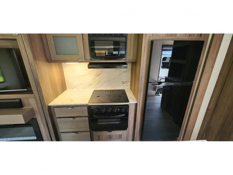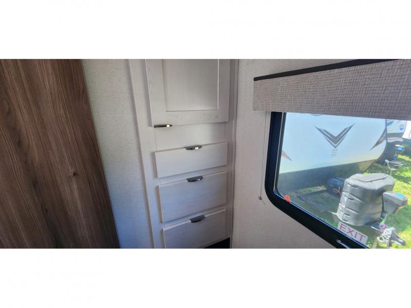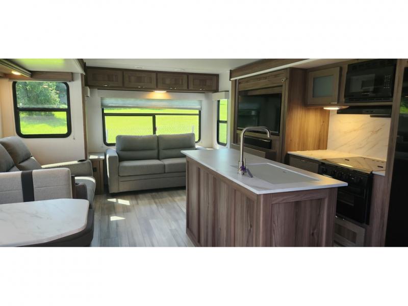 You'll love every minute spent in this spacious travel trailer that can sleep four to five each night. The rear living area will be a favorite place to visit together since there are dual opposing slides, a rear sofa, a booth dinette, plus a 60" theatre seat across from the entertainment center with a hidden pantry behind it. A kitchen island with storage in the middle will provide more counter space, and the wine rack will let you entertain guests. After you've spent your day outdoors, the full bath with a spacious shower, plenty of counter space, and a linen closet will let you freshen up before turning in for the night. Speaking of nighttime, the front private bedroom will provide a great night's rest on the king-size sliding bed, and there is storage space in the dual wardrobes plus the dresser/wardrobe!