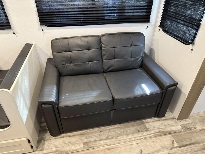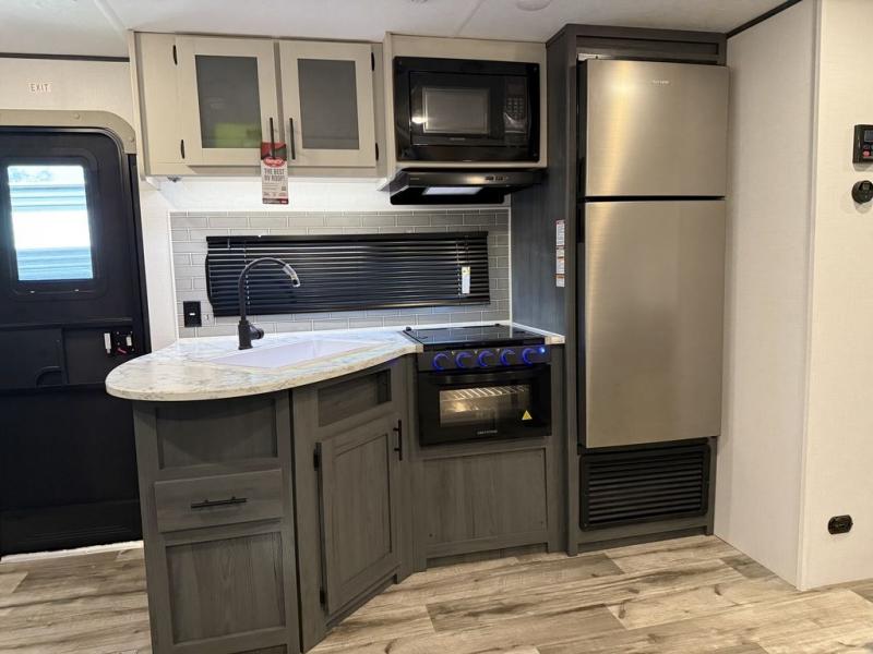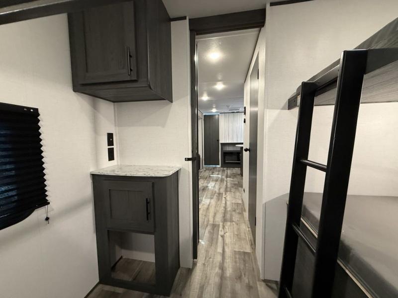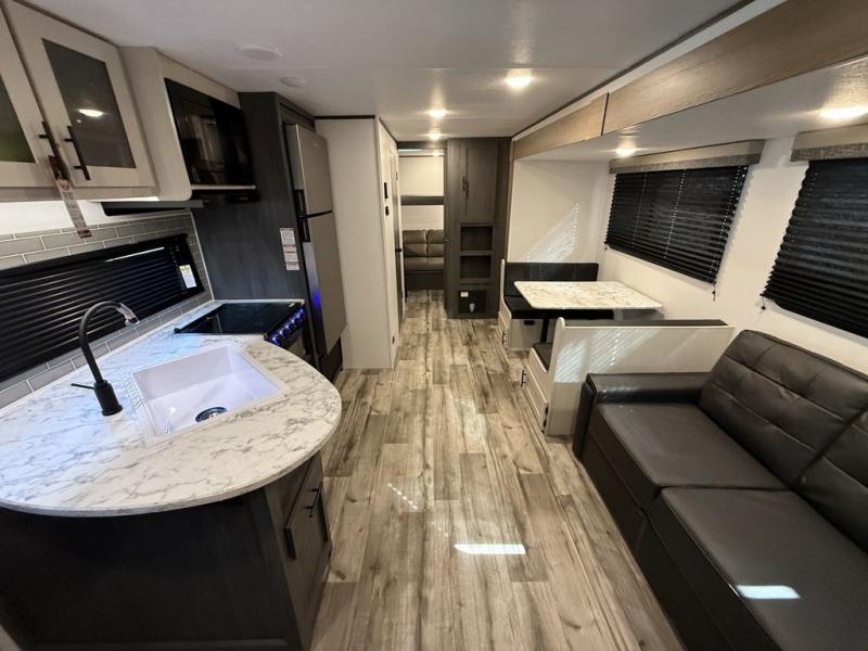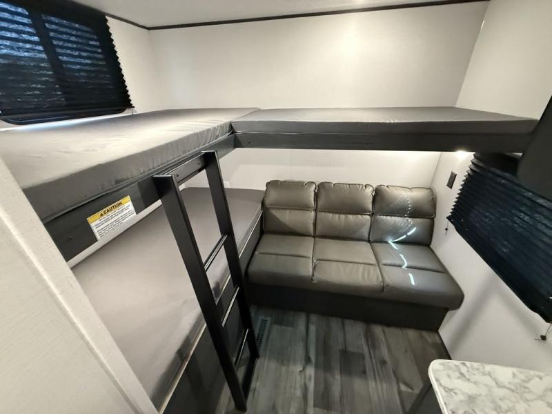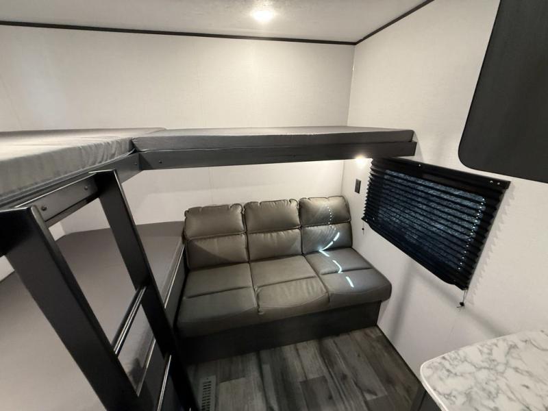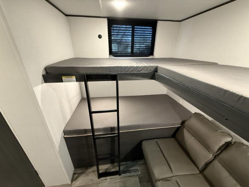 The private bunkhouse might be the main reason you chose this trailer or maybe it was the spacious interior, either way you will enjoy camping with your family and friends every chance you get. The bunkhouse offers triple bunk beds and a sofa, allowing four people to sleep in privacy. You will have your own bedroom up front to sleep on a residential queen bed with dual access, closets and windows to enjoy the campsite view. The full bathroom offers convenience, and the large slide out offers more floor space to move about. There is a booth dinette and jackknife sofa to relax on as well as provide more sleeping space for friends and family. The cook will have full amenities including a three burner range top, a galley sink with high rise faucet, plus a 10 cu. ft. 12V refrigerator to store the cold items.