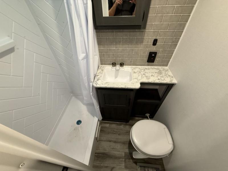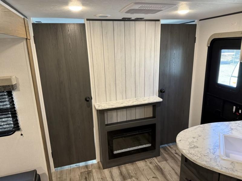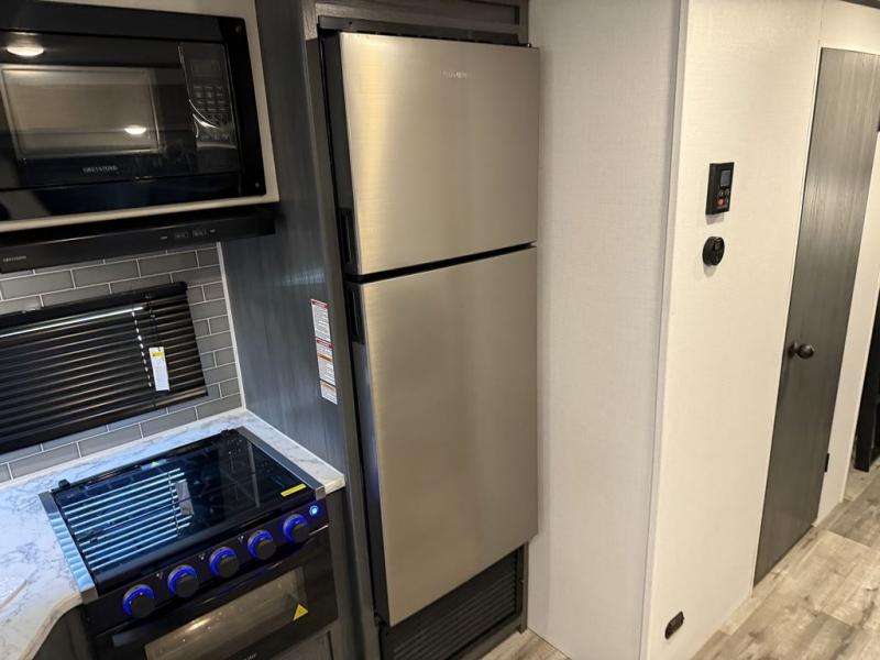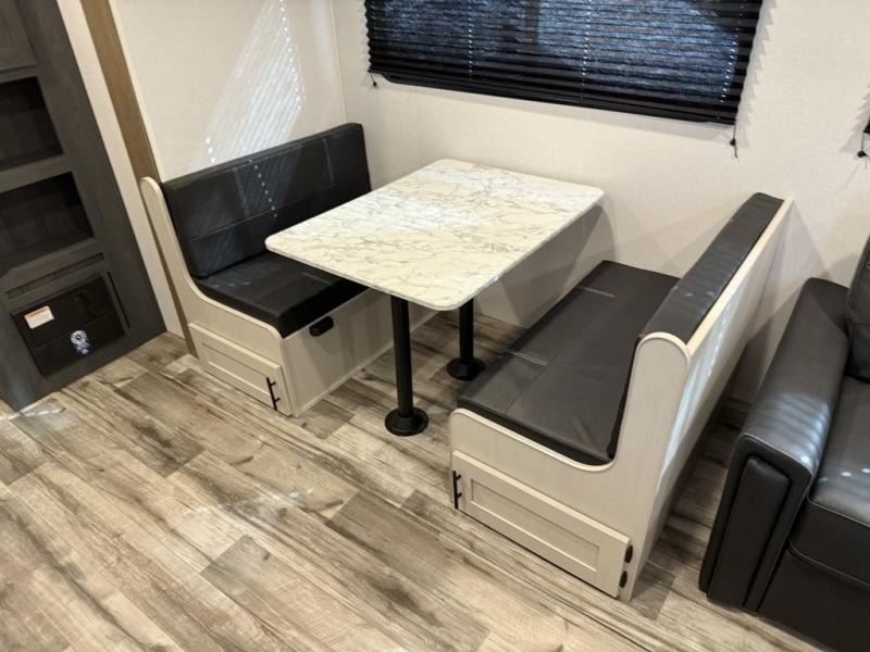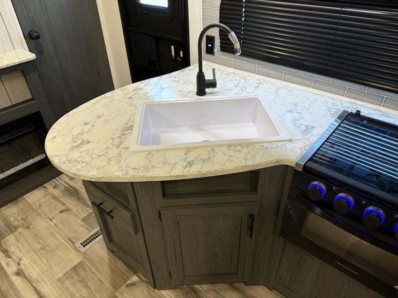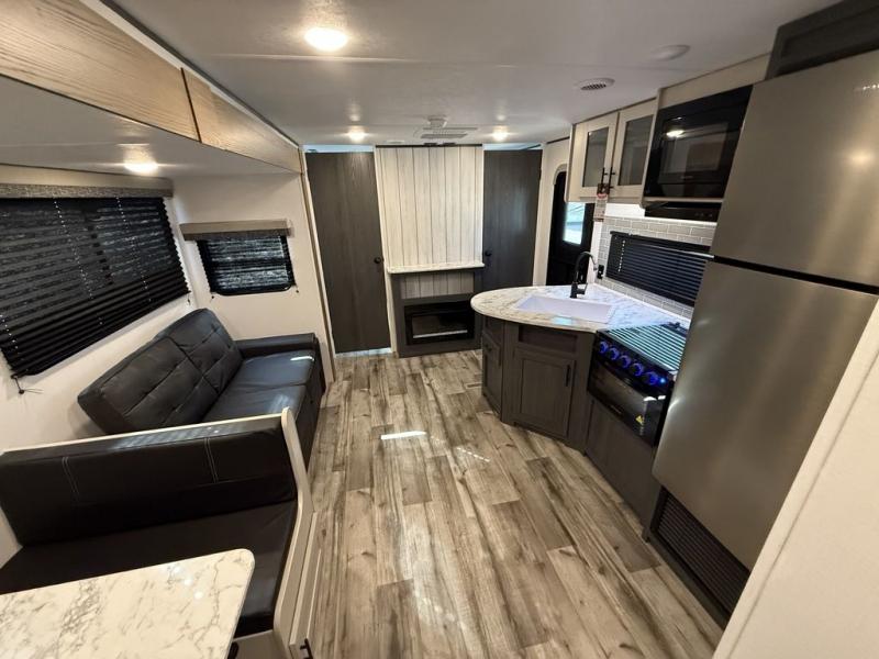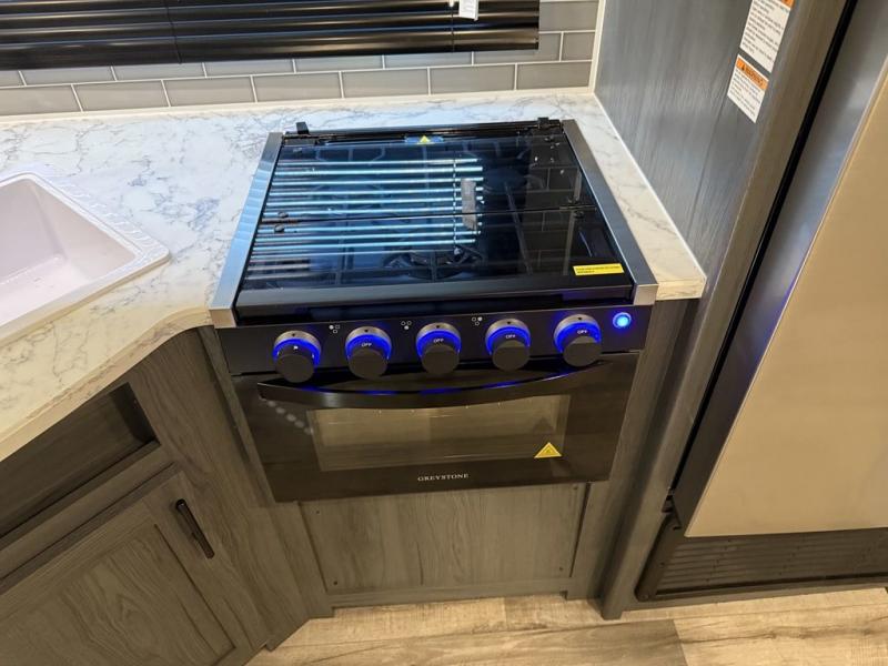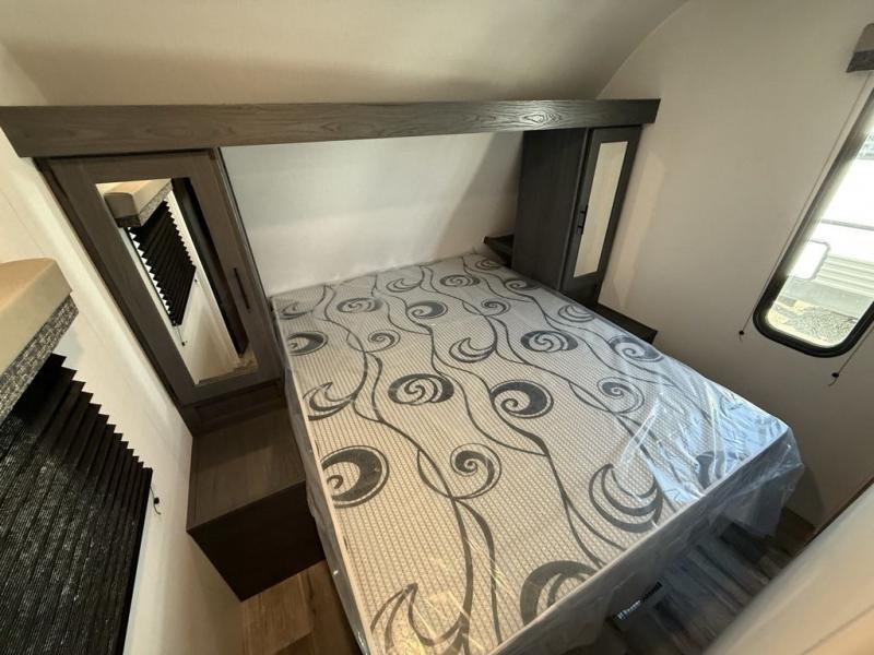 The private bunkhouse might be the main reason you chose this trailer or maybe it was the spacious interior, either way you will enjoy camping with your family and friends every chance you get. The bunkhouse offers triple bunk beds and a sofa, allowing four people to sleep in privacy. You will have your own bedroom up front to sleep on a residential queen bed with dual access, closets and windows to enjoy the campsite view. The full bathroom offers convenience, and the large slide out offers more floor space to move about. There is a booth dinette and jackknife sofa to relax on as well as provide more sleeping space for friends and family. The cook will have full amenities including a three burner range top, a galley sink with high rise faucet, plus a 10 cu. ft. 12V refrigerator to store the cold items.
