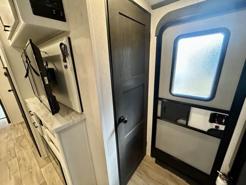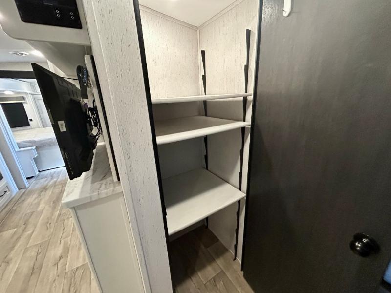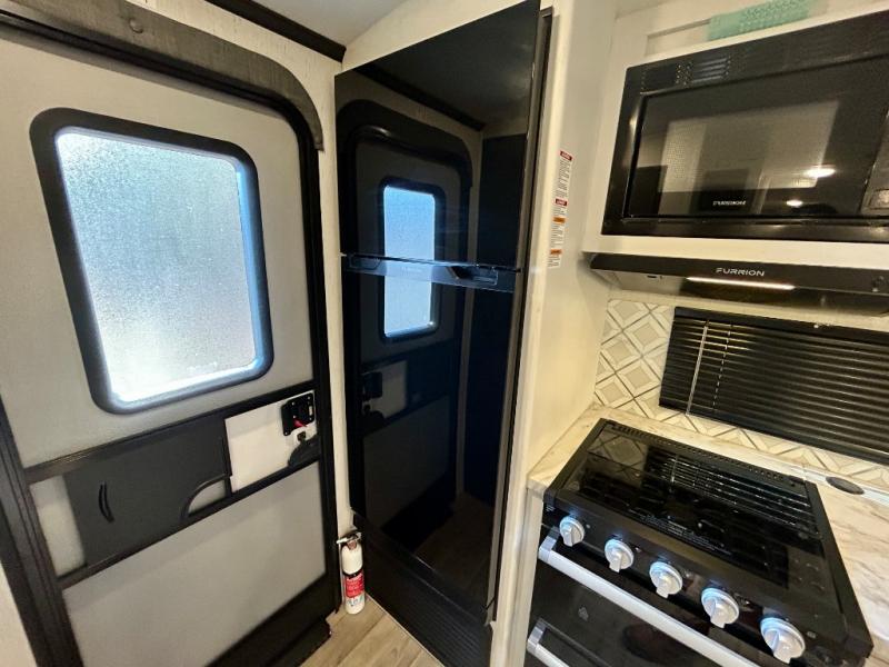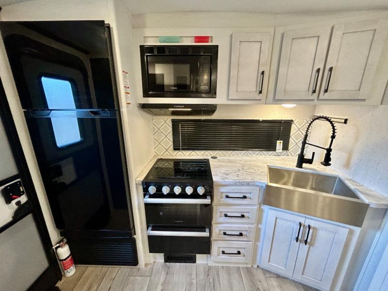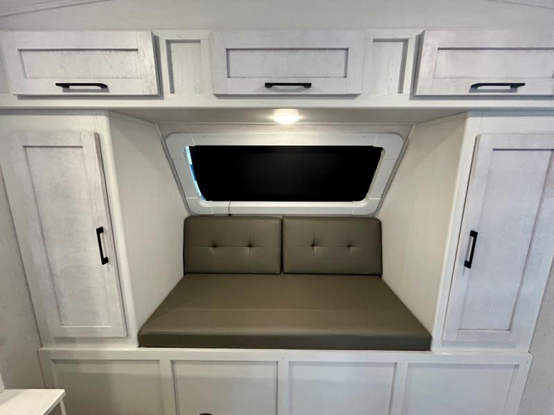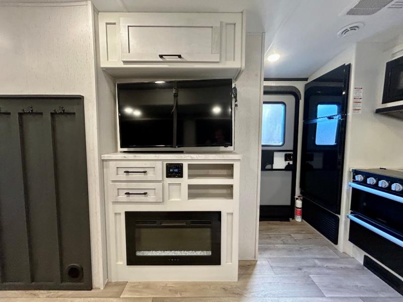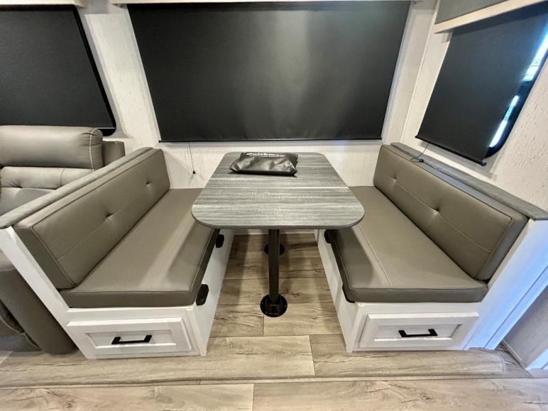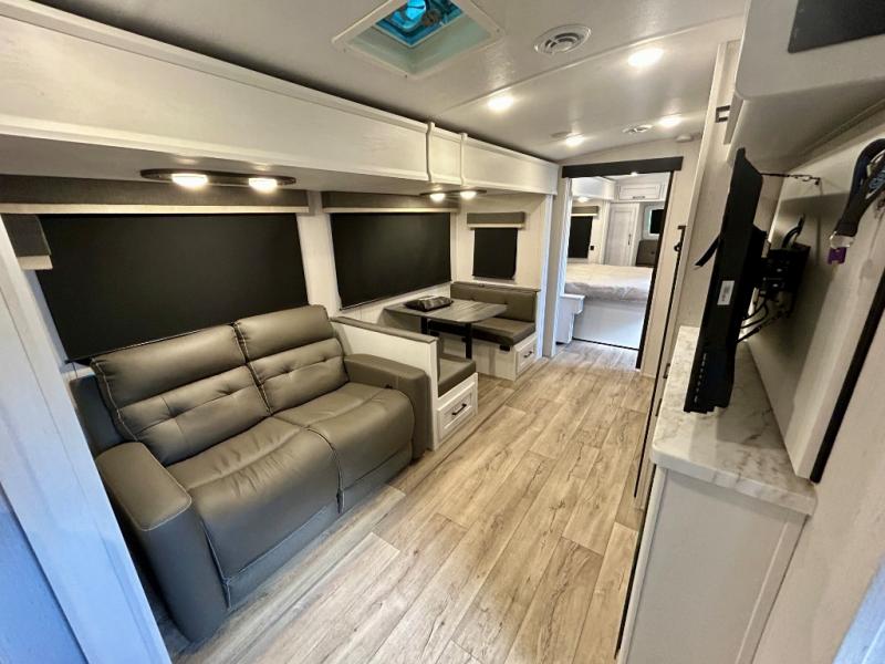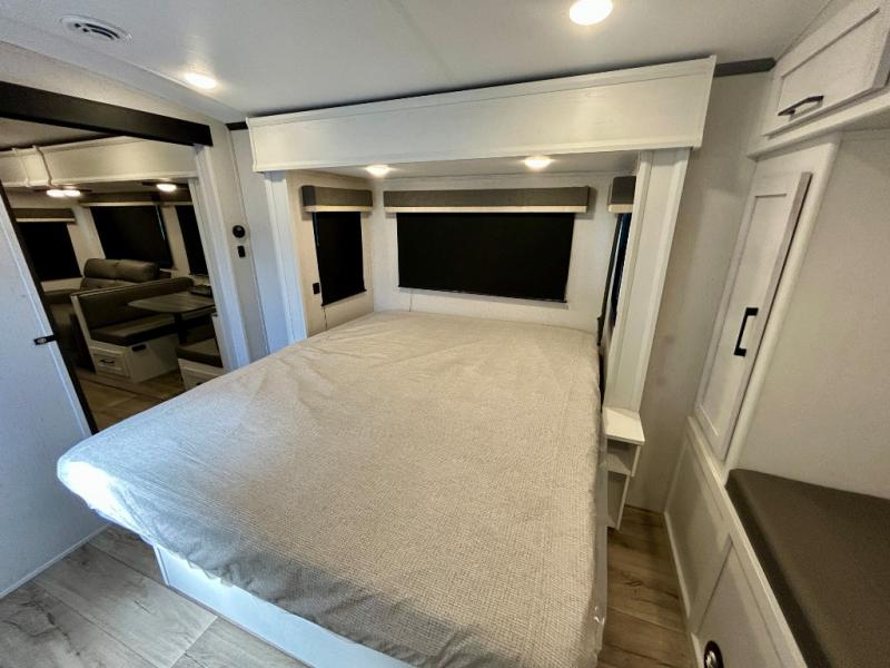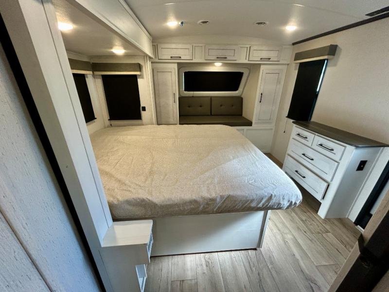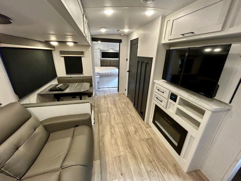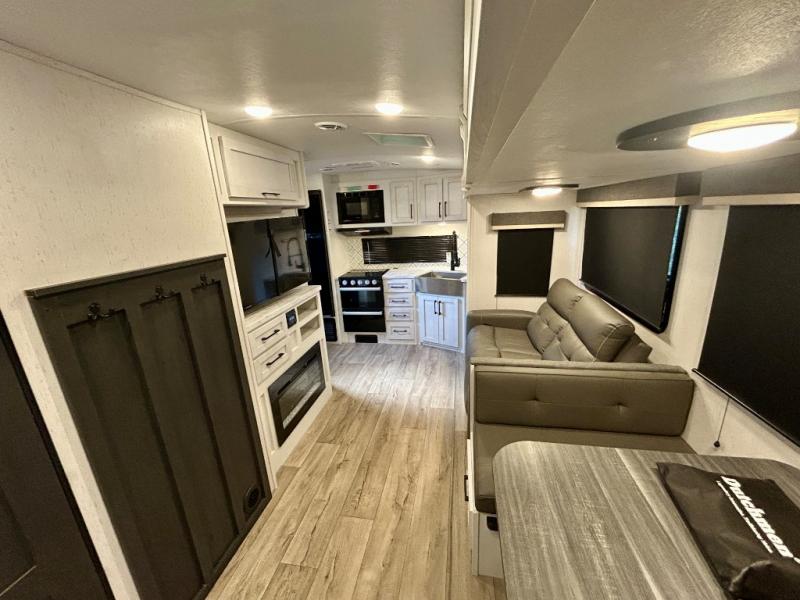 Step right in to this spacious rear kitchen travel trailer for unforgettable camping trips! The rear kitchen includes a three burner cooktop with an oven and glass cover, a microwave oven, and a 10 cu. ft. 12V refrigerator for perishables. Within the large slide out, you can dine at the booth dinette and relax on the theater seats after dinner. There is also an HD LED TV across from the sofa for easy viewing. The second slide out is found in the front bedroom, along with a king bed, storage space, and a front seating space. You'll also find plenty of storage throughout, including exterior storage and an entry closet to keep jackets, food, and more!